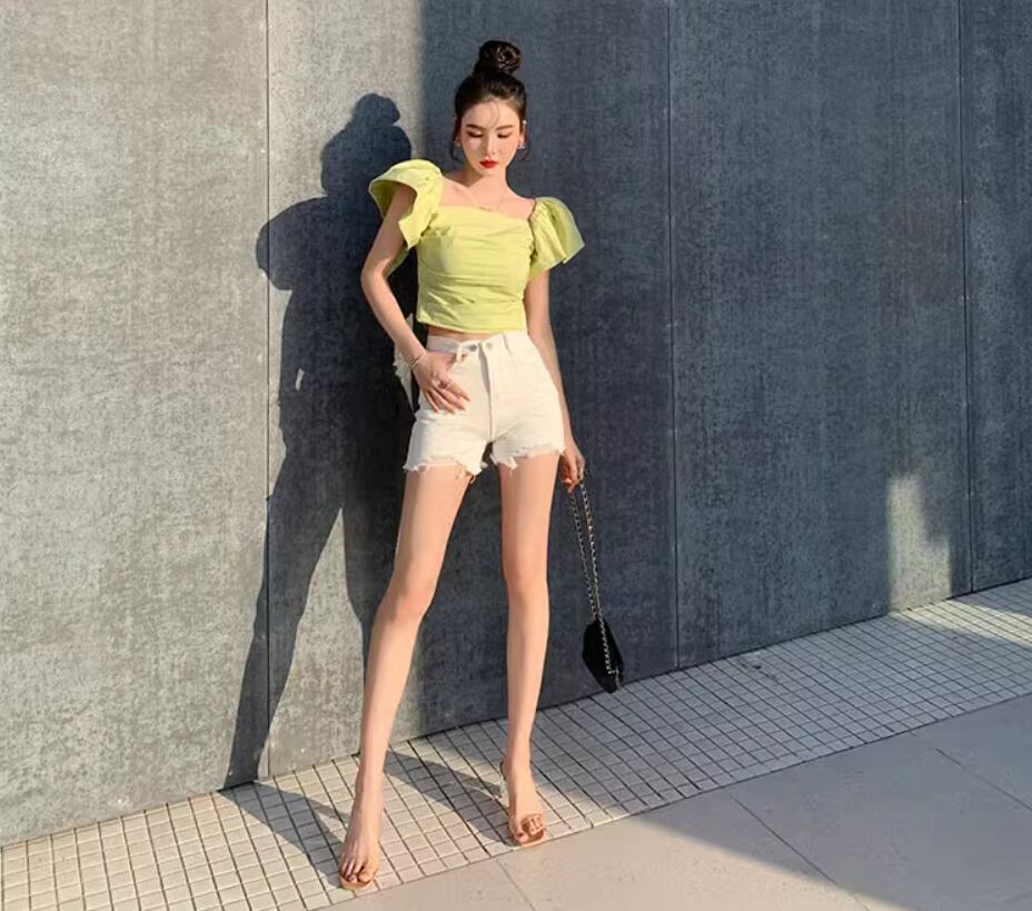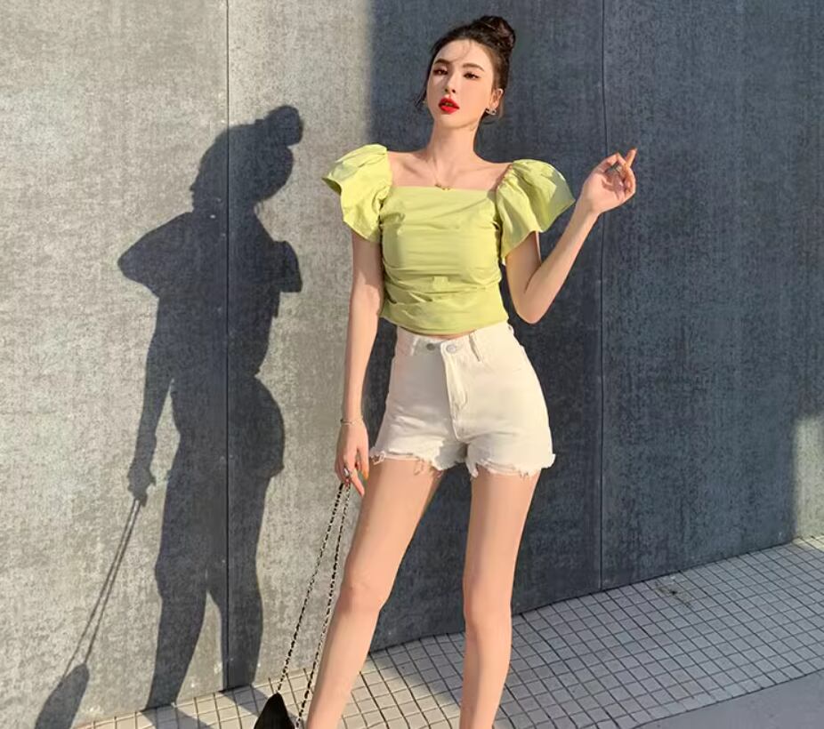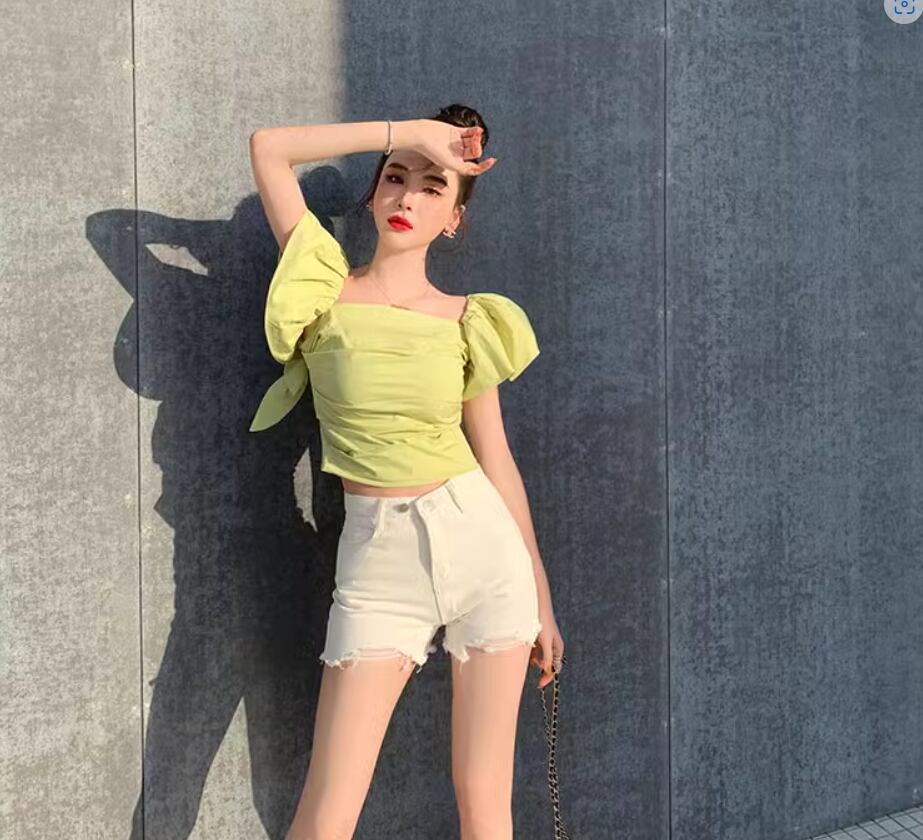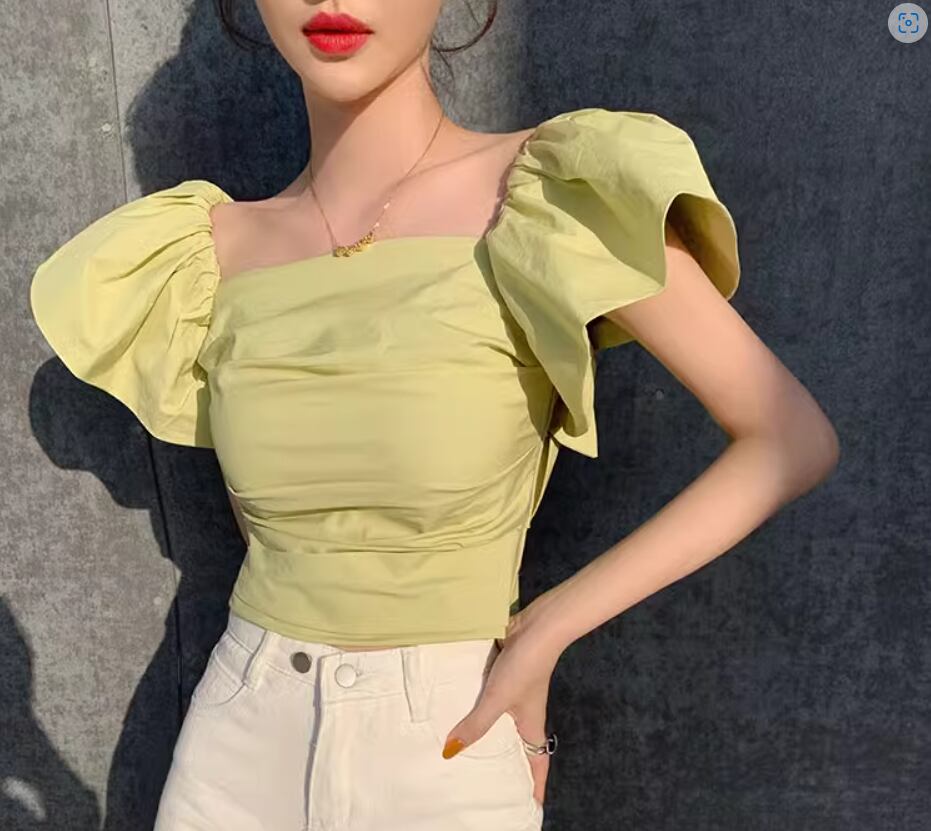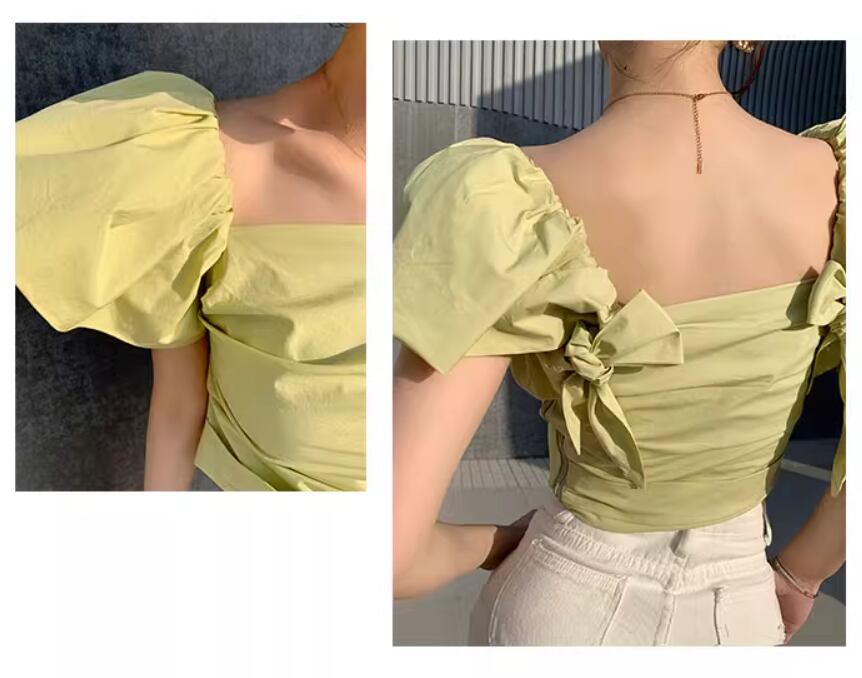 ボリューム袖と大胆な背中見せが魅力のショート丈ブラウス