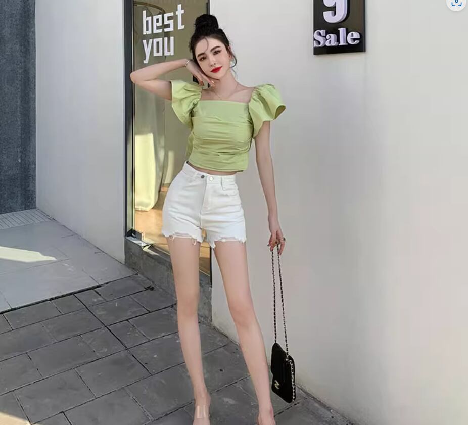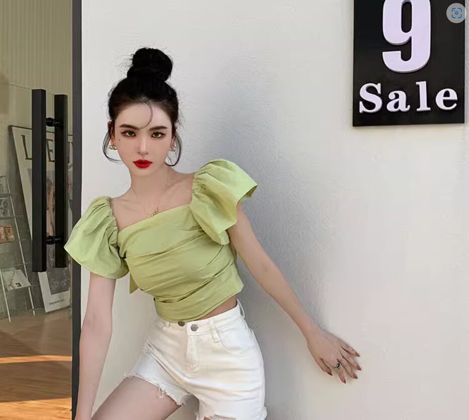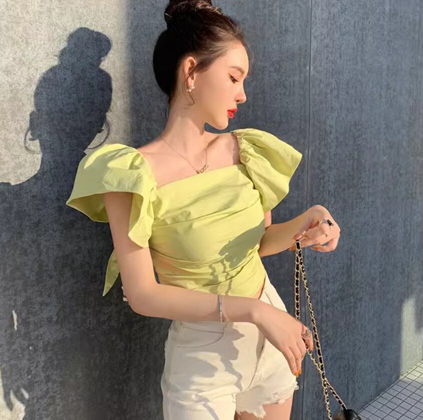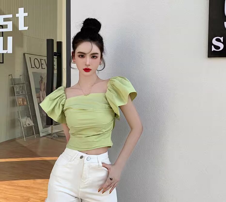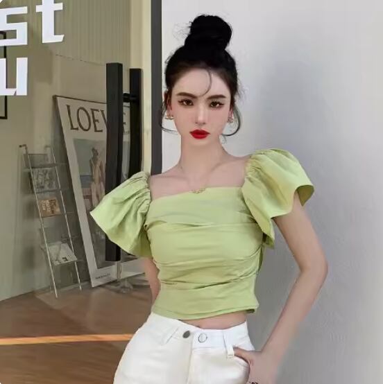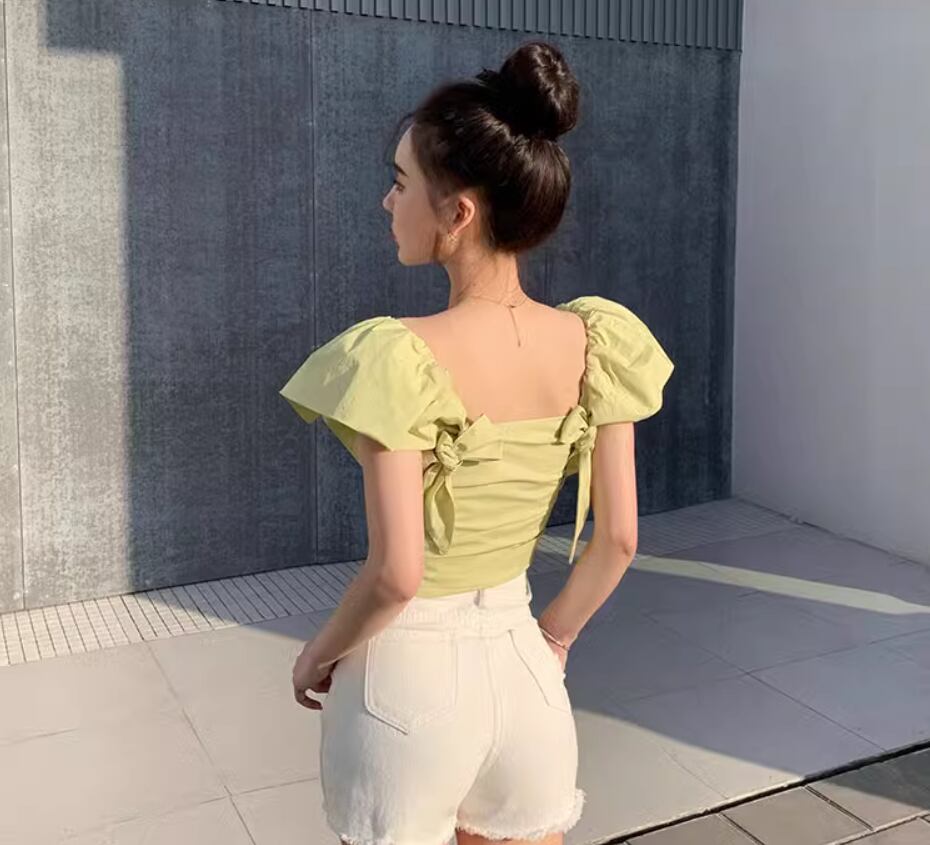 ボリューム袖ショート丈ブラウス トップス ショート丈 袖あり 半袖 スクエアネック スリム 細身 リボン バックコンシャス かわいい 大人可愛い シンプル カジュアル おしゃれ お洒落 こなれ感 無地 夏 10代 20代 30代 40代 レディース デート お出かけ 休日 イベント リゾート 旅行 海 プール 着回し 普段使い S M 緑 グリーン