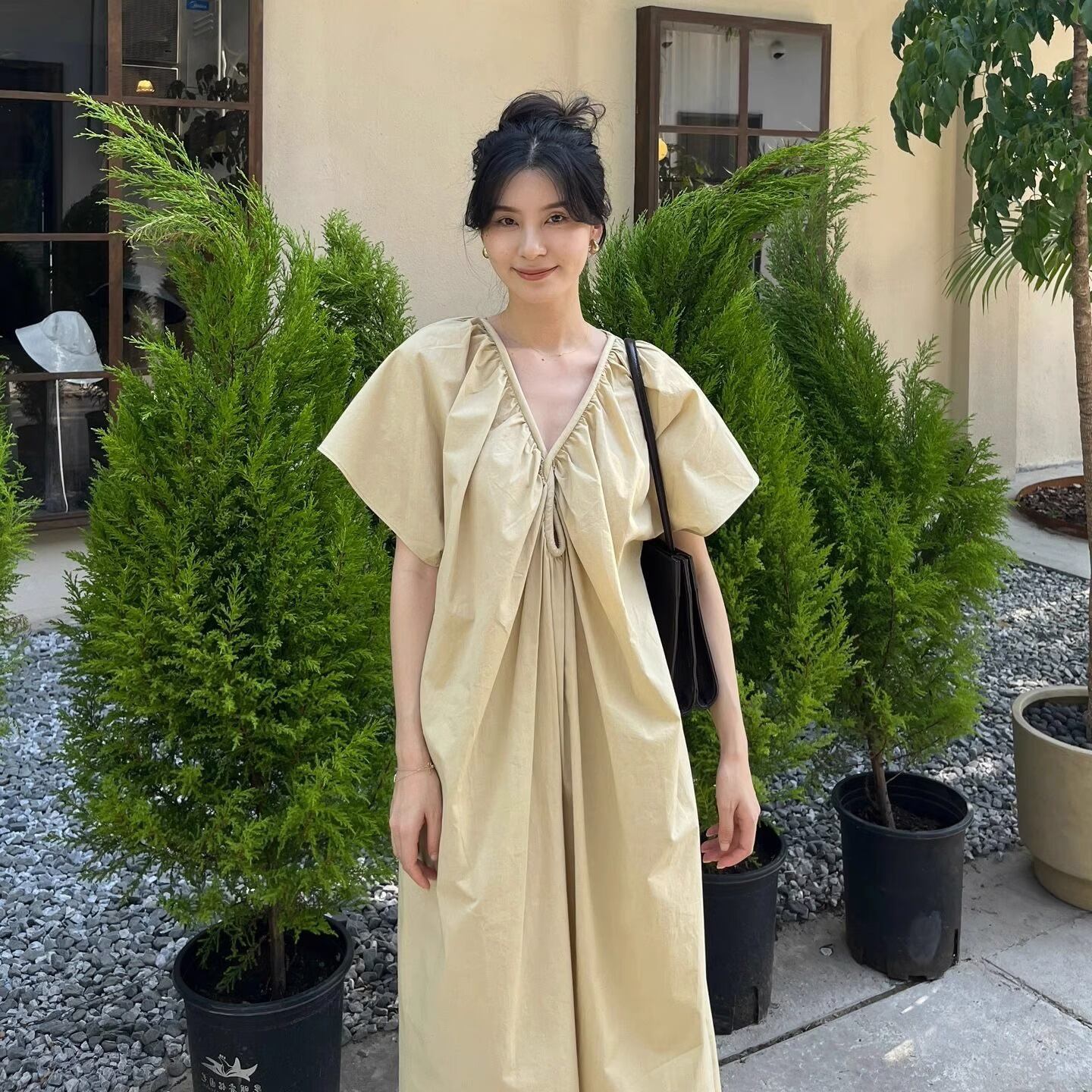 このマキシ丈ワンピースは、Vネックと胸元のデザインが女性らしさを引き立てる一枚。