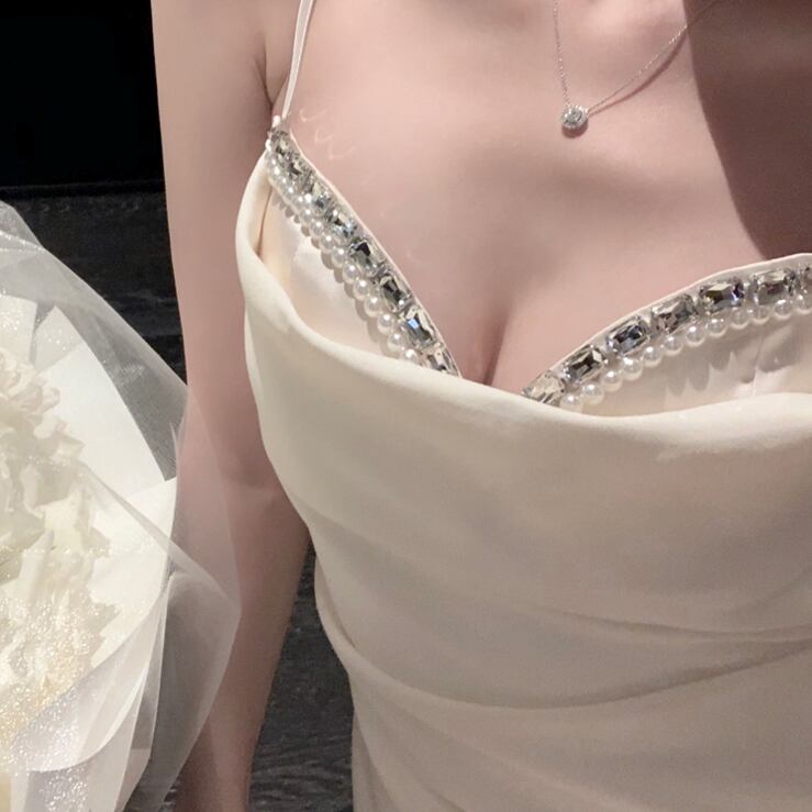 胸元のビジューがアクセントとなり、女性らしさを引き立てる一枚です。