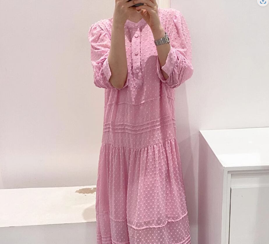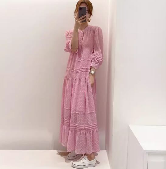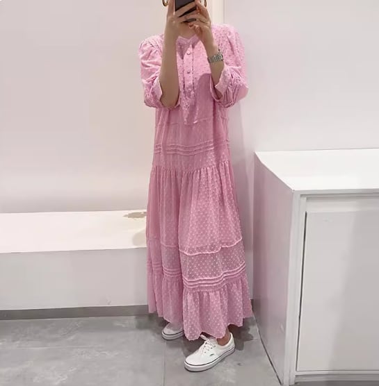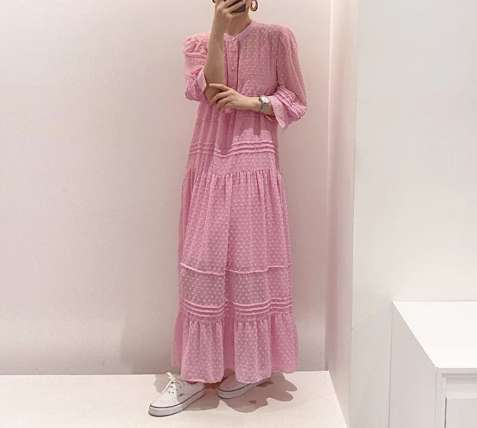 シアー素材ドット柄ワンピース ロング丈 マキシ丈 袖あり 7分袖 七分袖 スタンドカラー ワイド ウエストマーク 透け感 かわいい 大人可愛い シンプル カジュアル おしゃれ ドット柄 春 夏 秋 10代 20代 30代 40代 50代 60代 レディース 女性用 ママ マタニティ デート お出かけ 休日 着回し 普段使い 体系カバー S M L XL ゆったり ピンク