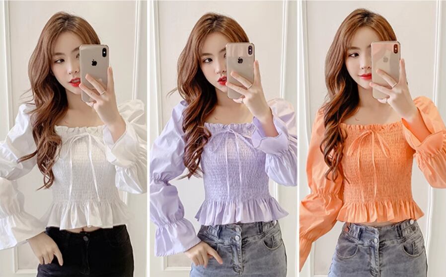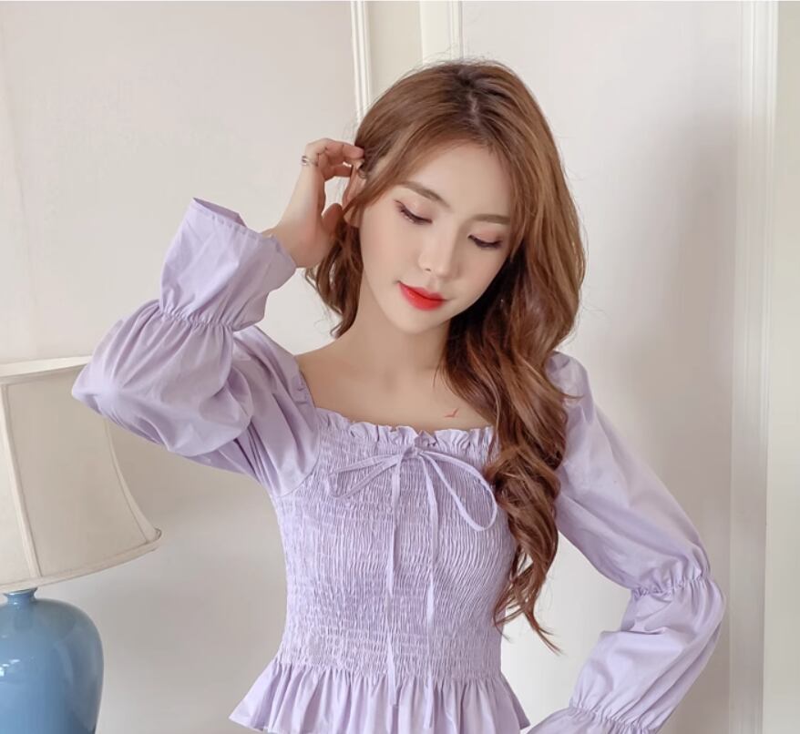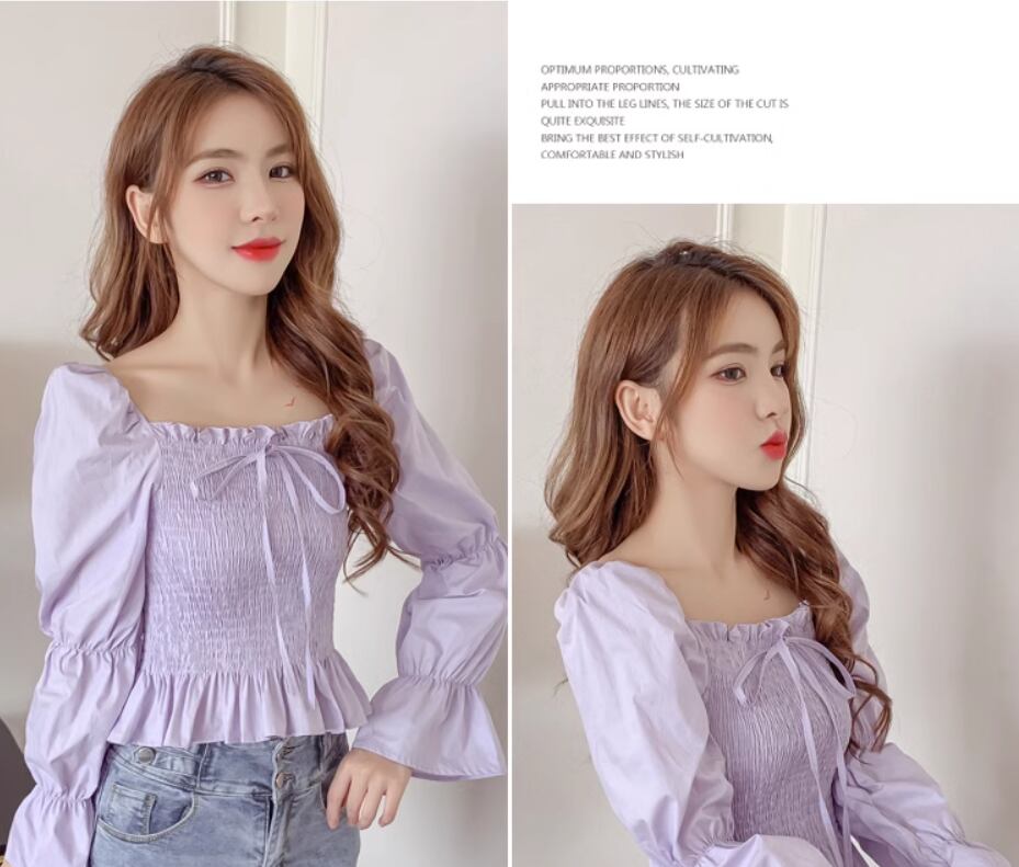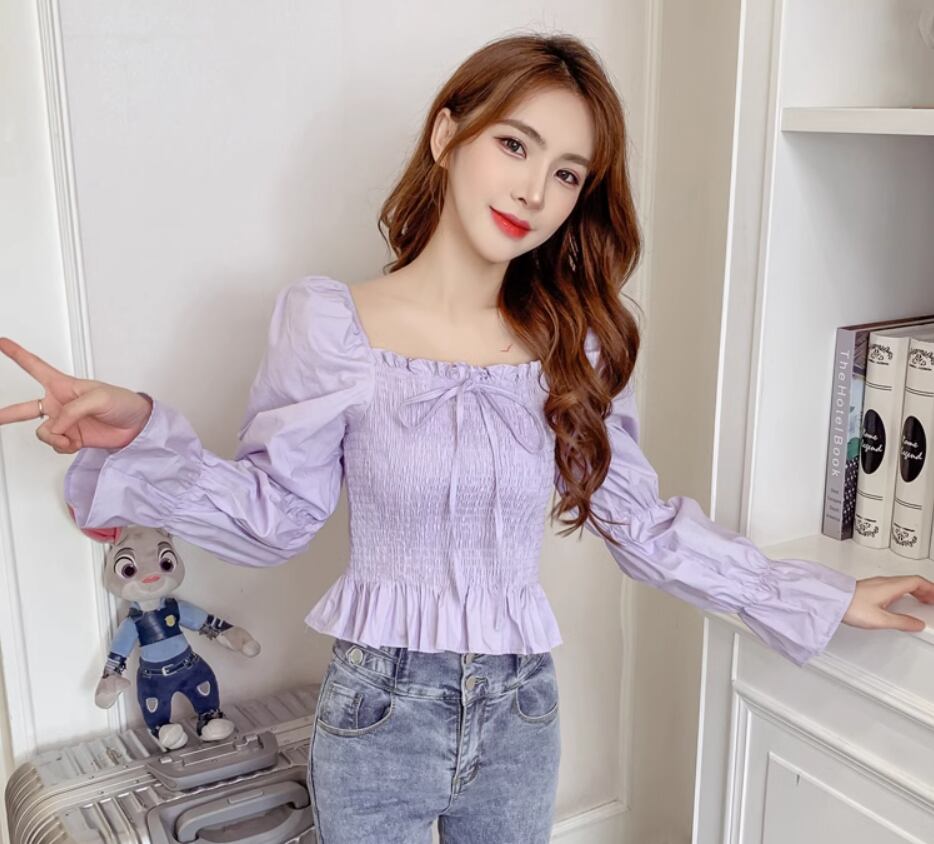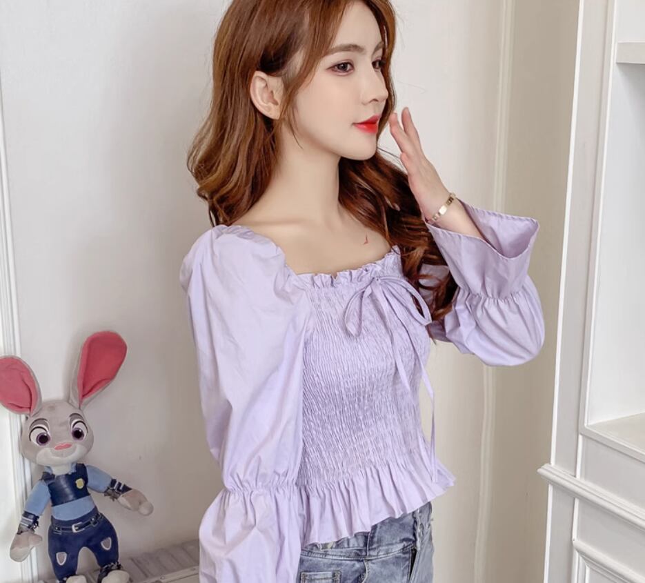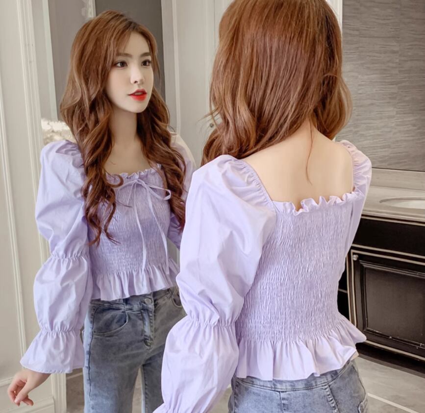 シャーリングデザインブラウス トップス 白シャツ 白トップス ショート丈 袖あり 長袖 ボリューム袖 スクエアネック スリム 透け感 かわいい シンプル カジュアル おしゃれ お洒落 ガーリー 無地 春 夏 10代 20代 30代 レディース 女性用 デート お出かけ 休日 着回し 普段使い 楽ちん S M L XL 白 ホワイト 紫 パープル オレンジ