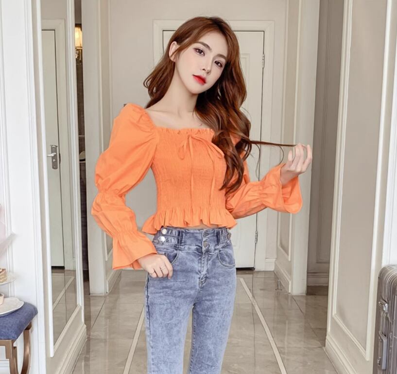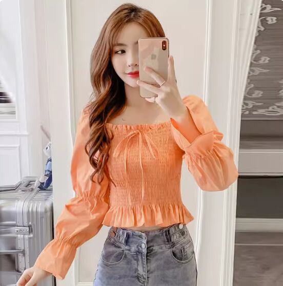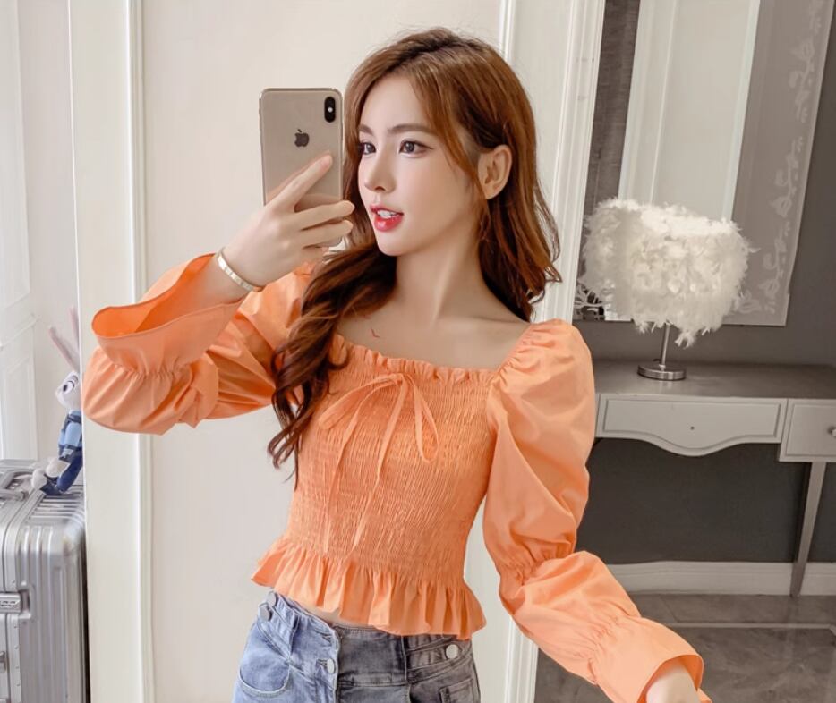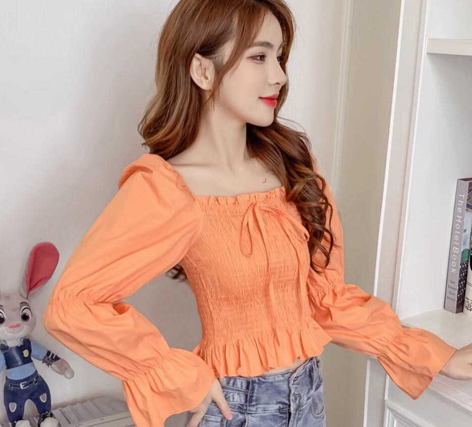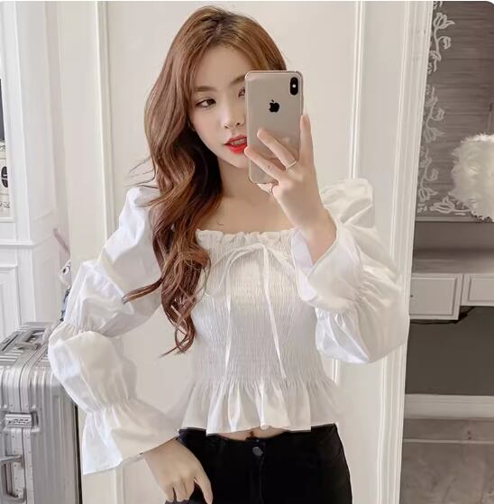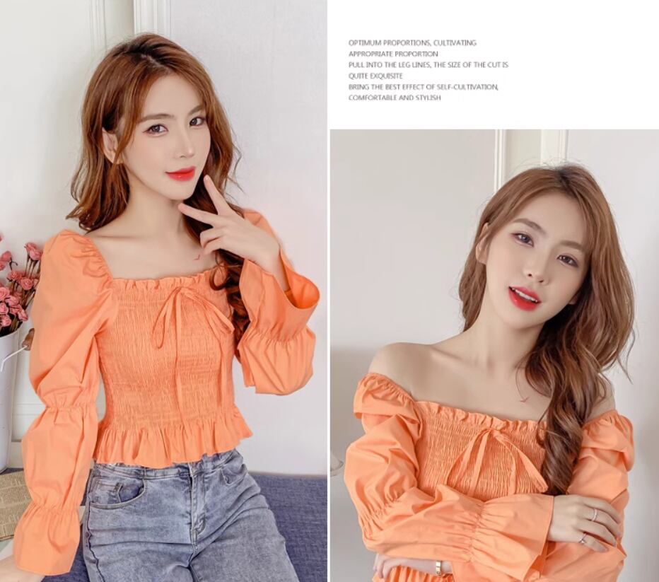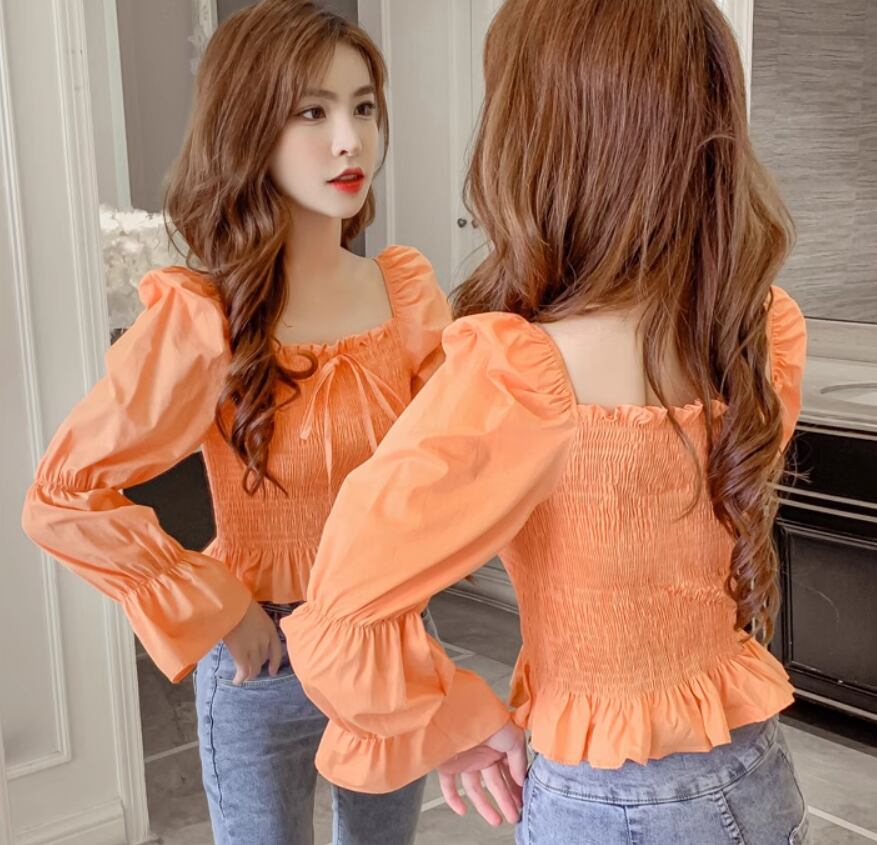 シャーリングデザインブラウス トップス 白シャツ 白トップス ショート丈 袖あり 長袖 ボリューム袖 スクエアネック スリム 透け感 かわいい シンプル カジュアル おしゃれ お洒落 ガーリー 無地 春 夏 10代 20代 30代 レディース 女性用 デート お出かけ 休日 着回し 普段使い 楽ちん S M L XL 白 ホワイト 紫 パープル オレンジ