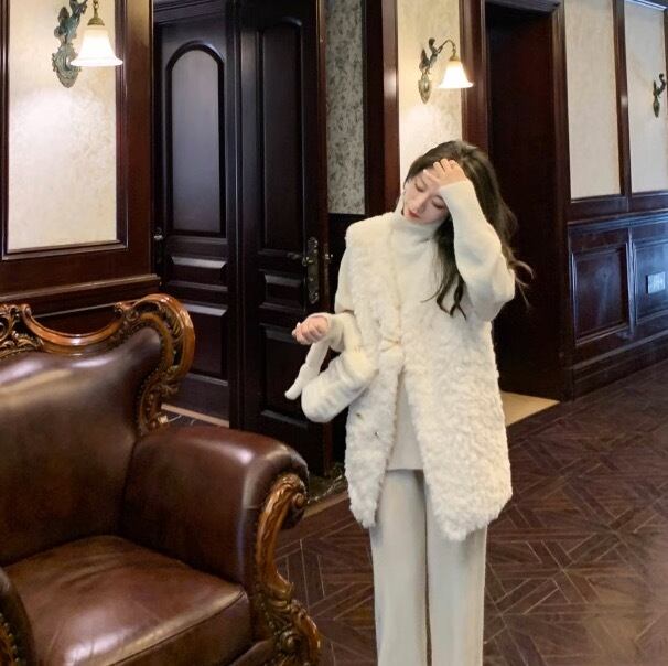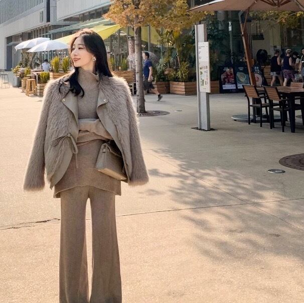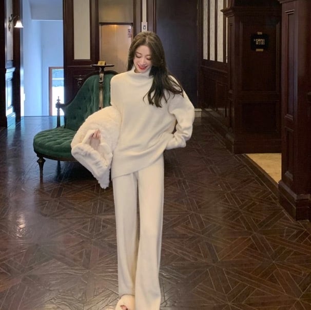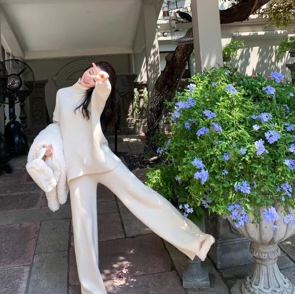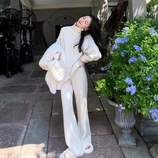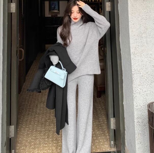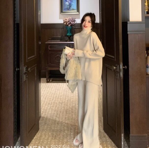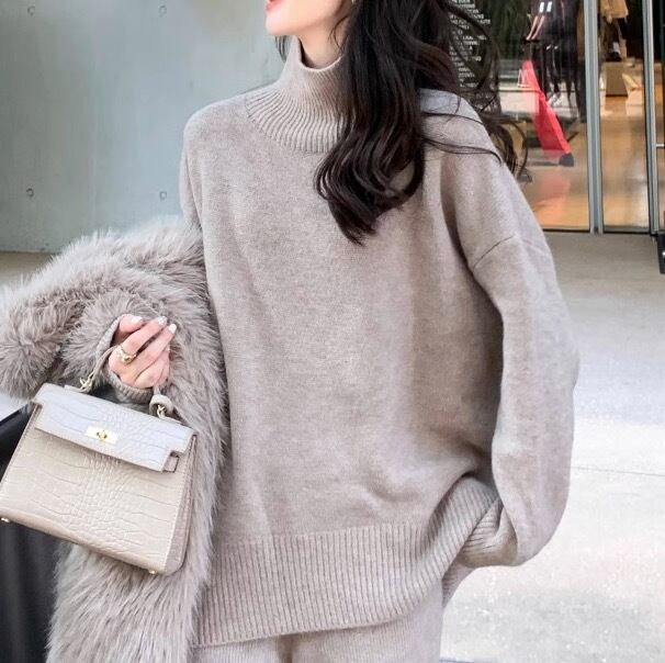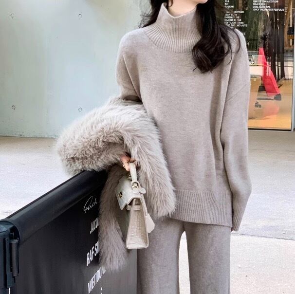 おしゃれなニットセットアップが登場しました!トップスとボトムスがセットになった便利なアイテムで、コーディネートも簡単に決まります。タートルネックのトップスは、襟なしでシンプルなデザインながらも存在感抜群。一方のパンツは、ストレートでありながらもワイドなシルエットがおしゃれさを引き立てます。