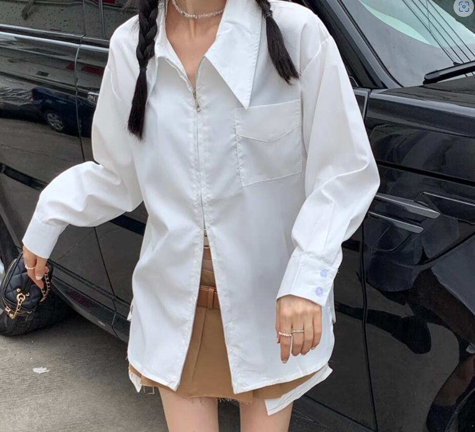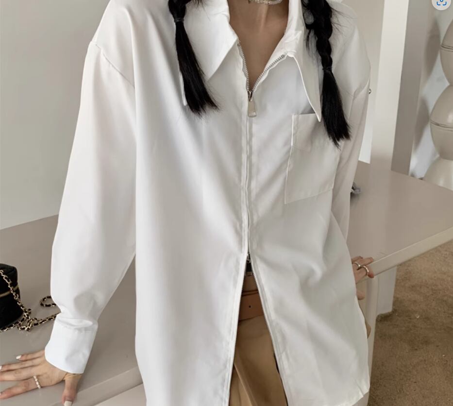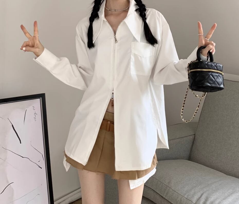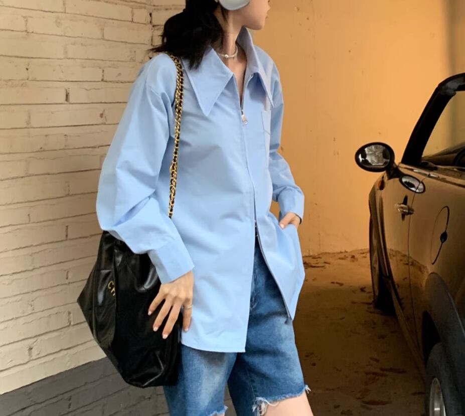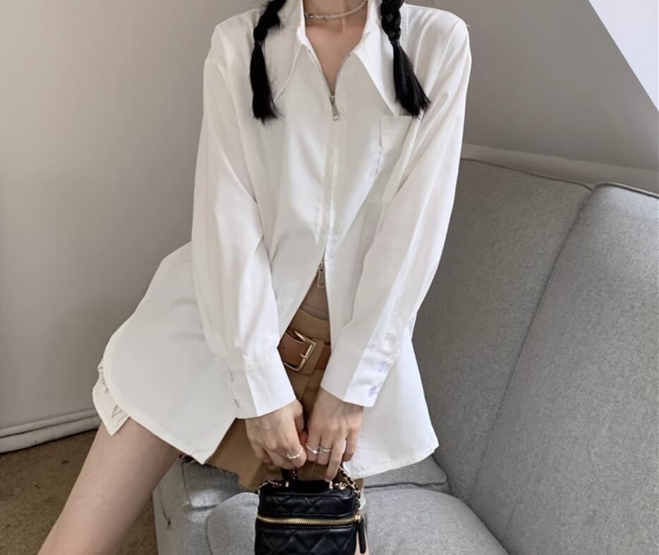 トップス シャツ ブラウス 白シャツ 白トップス 袖あり 長袖 襟付き ストレート ファスナー シンプル カジュアル おしゃれ お洒落 大人女子 こなれ感 個性的 無地 春 夏 秋 10代 20代 30代 40代 ママ お出かけ 休日 着回し 普段使い 重ね着 楽ちん S M L XL 白 ホワイト 青 ブルー