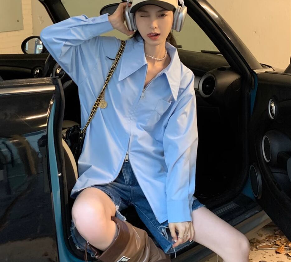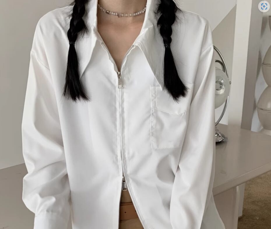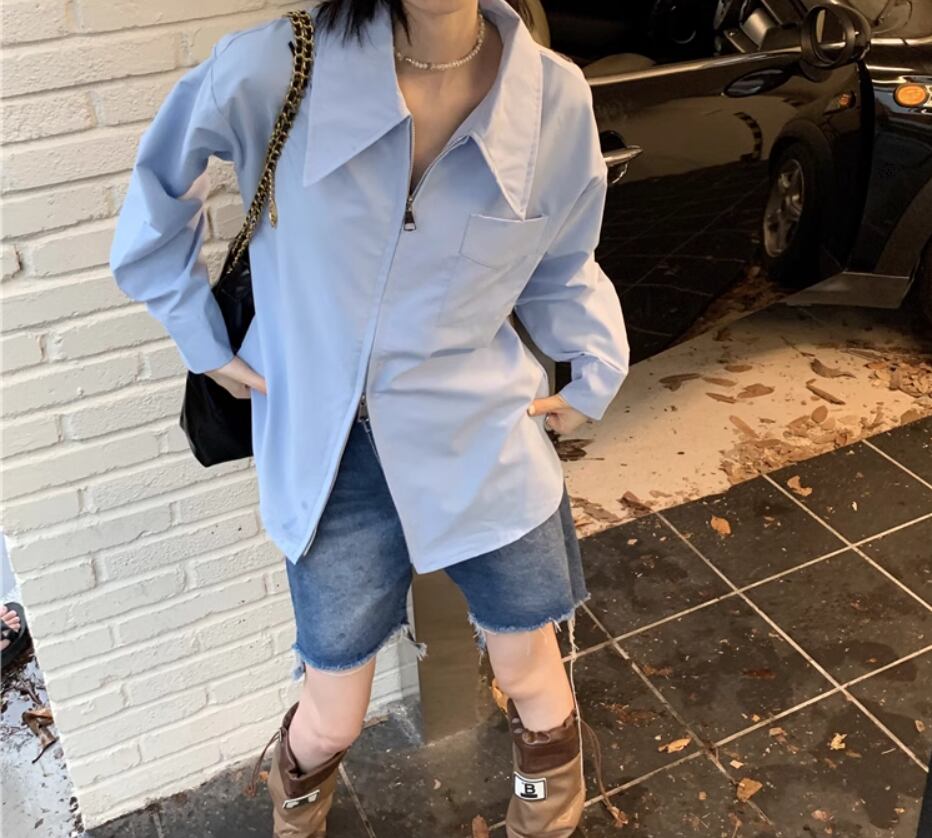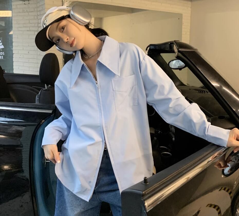 トップス シャツ ブラウス 白シャツ 白トップス 袖あり 長袖 襟付き ストレート ファスナー シンプル カジュアル おしゃれ お洒落 大人女子 こなれ感 個性的 無地 春 夏 秋 10代 20代 30代 40代 ママ お出かけ 休日 着回し 普段使い 重ね着 楽ちん S M L XL 白 ホワイト 青 ブルー