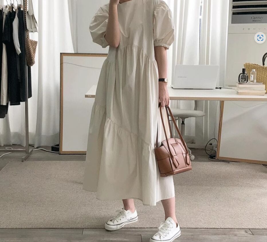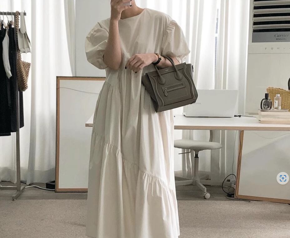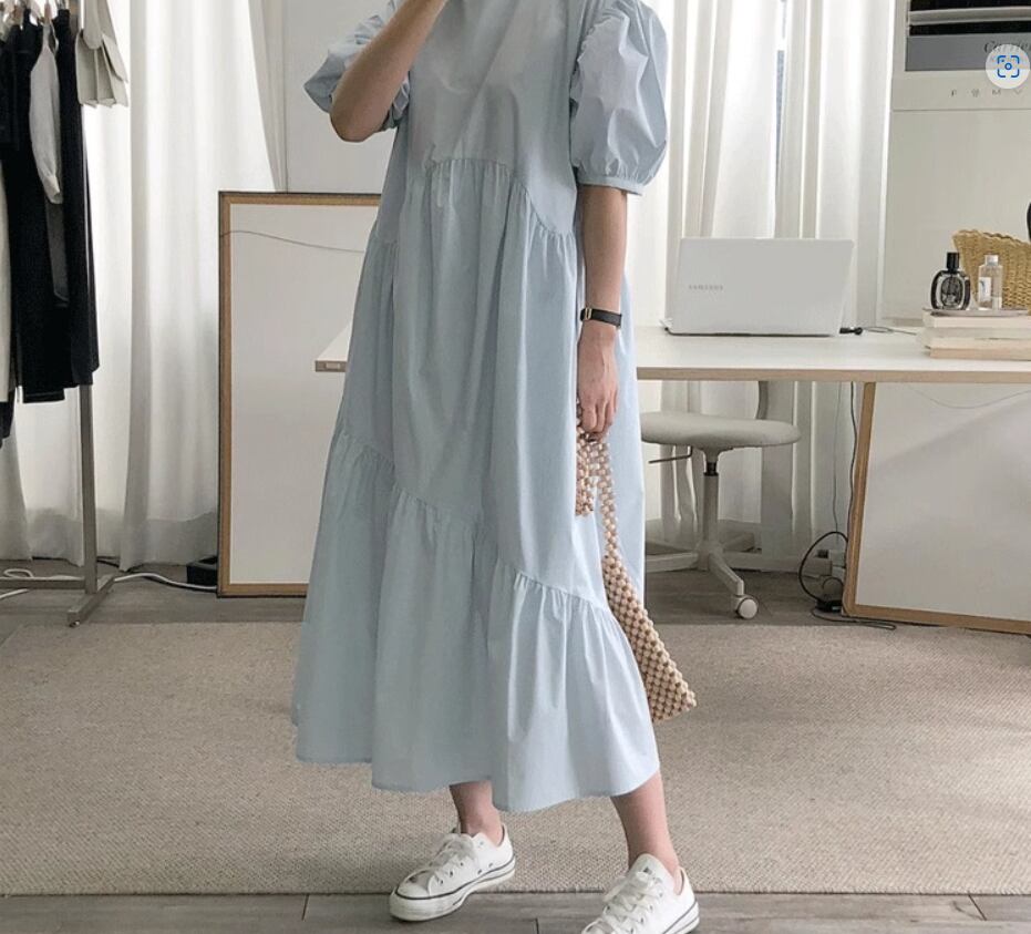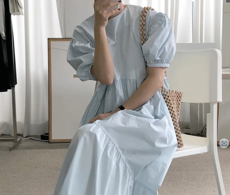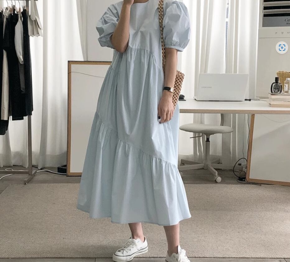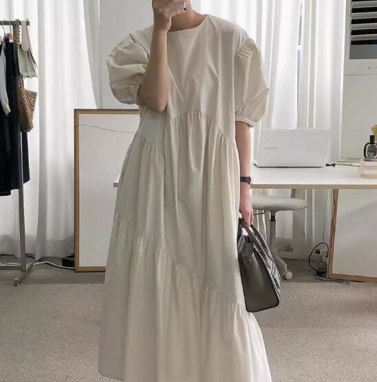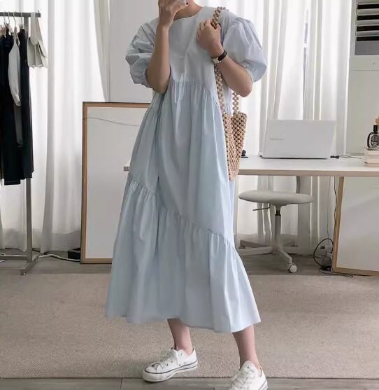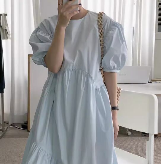 パフスリーブギャザーワンピース ティアードワンピース ワンピドレス 袖あり 半袖 ラウンドネック Aライン かわいい 大人可愛い シンプル カジュアル おしゃれ お洒落 無地 春 夏 10代 20代 30代 40代 レディース 女性用 ママ マタニティ 休日 旅行 普段使い 楽ちん 体系カバー S M L XL 青 ブルー アプリコット