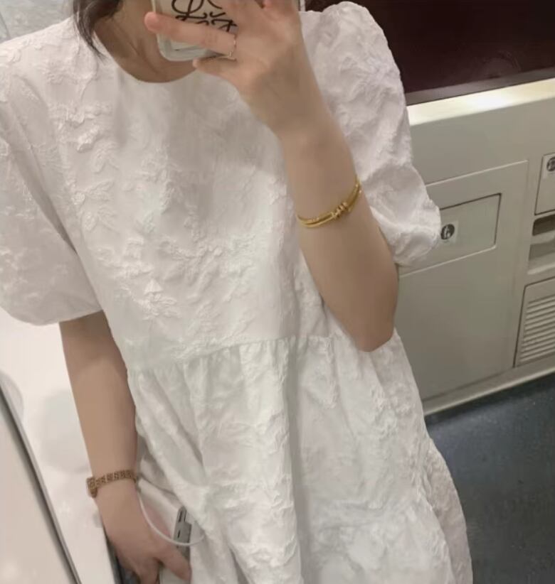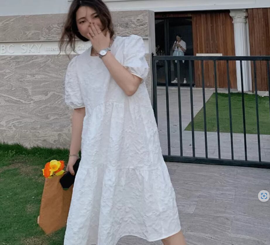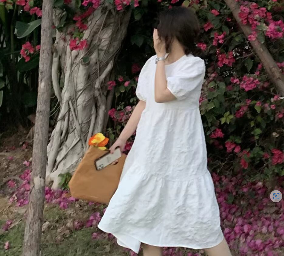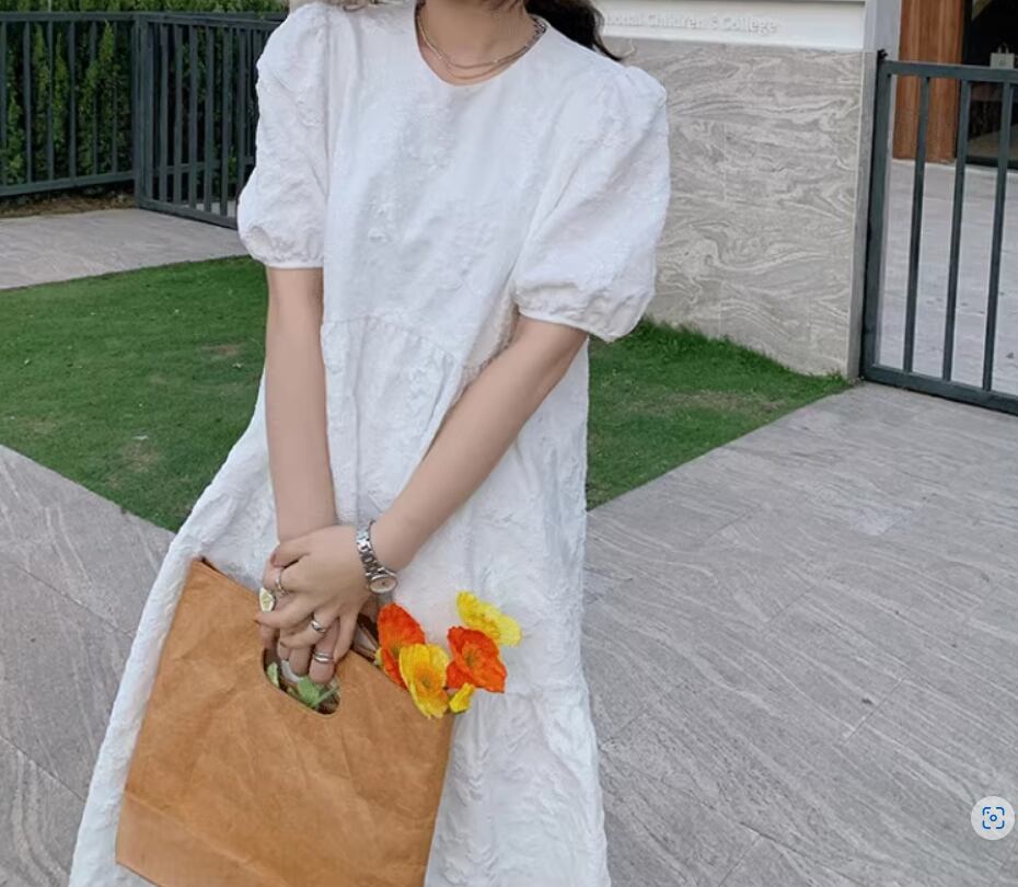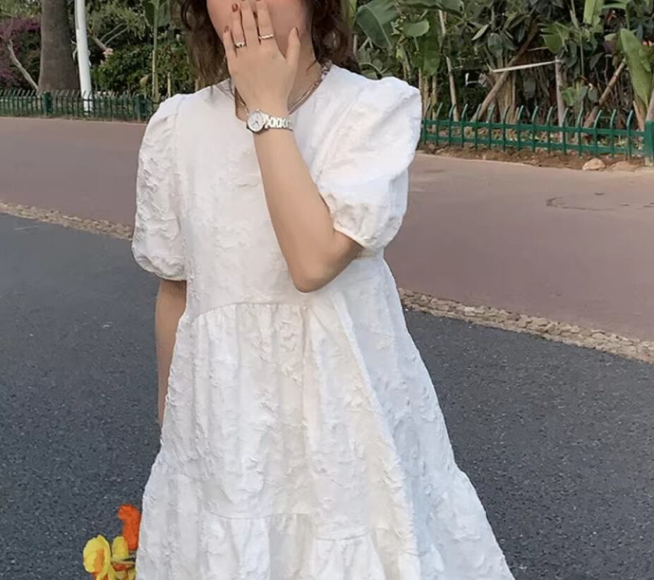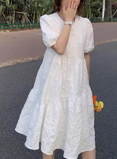 エンボス加工パフスリーブワンピース 袖あり 半袖 パフスリーブ ラウンドネック Aライン 切り替えデザイン 透け感 かわいい 大人可愛い シンプル 上品 おしゃれ お洒落 ガーリー 無地 春 夏 10代 20代 30代 レディース 女性用 お出かけ 休日 普段使い モテ S M L 白 ホワイト