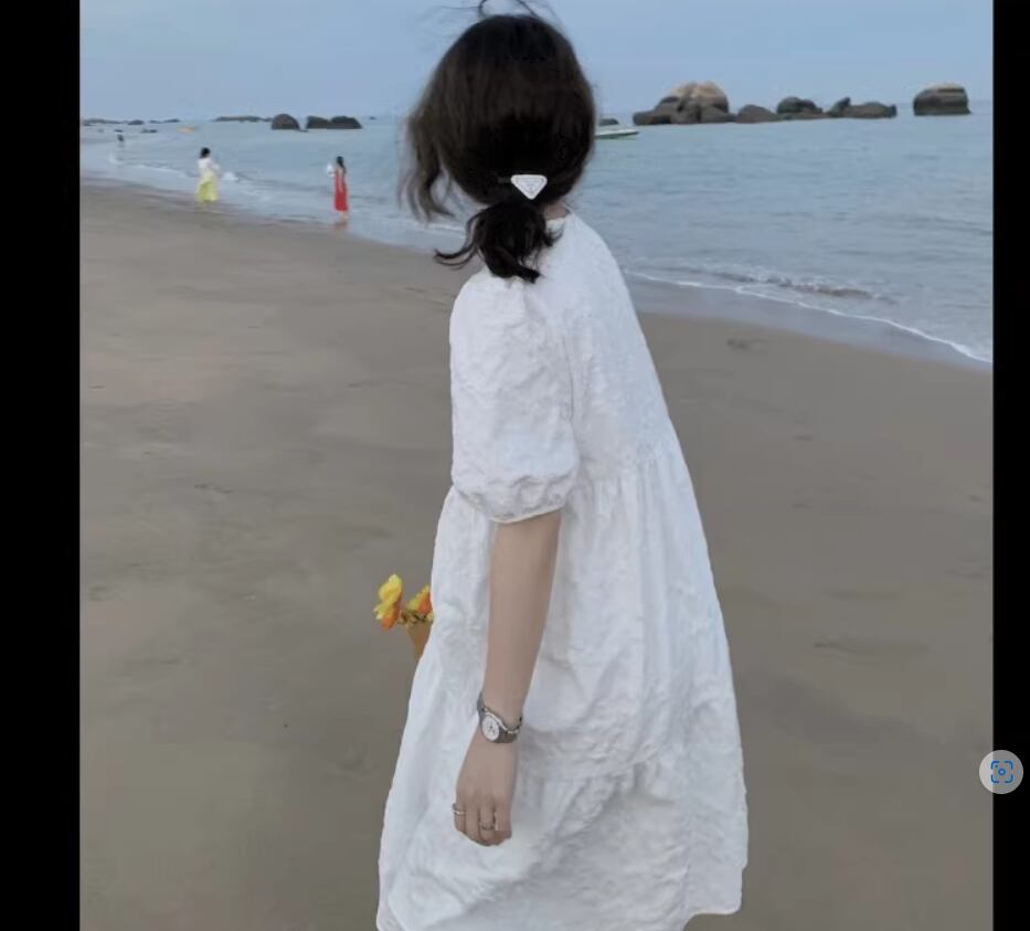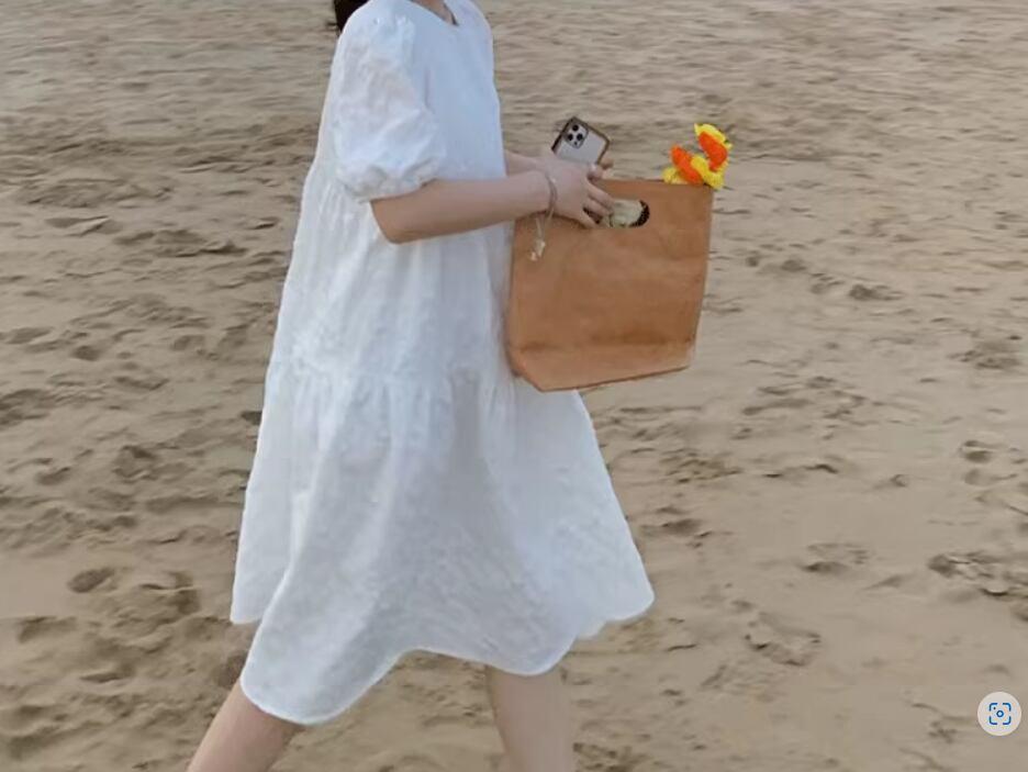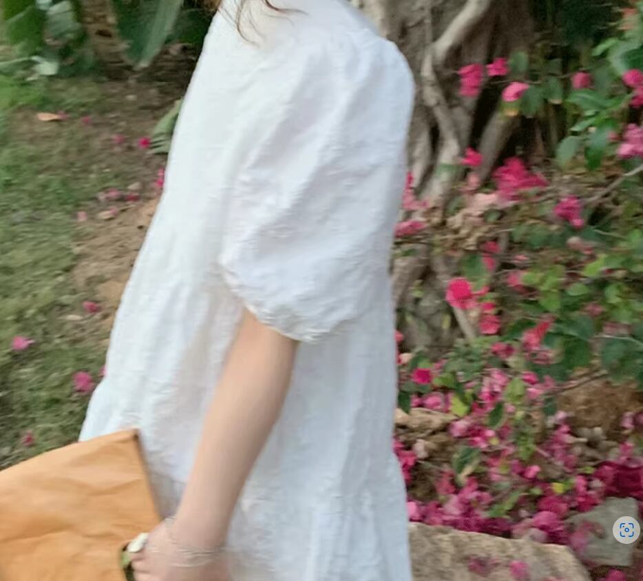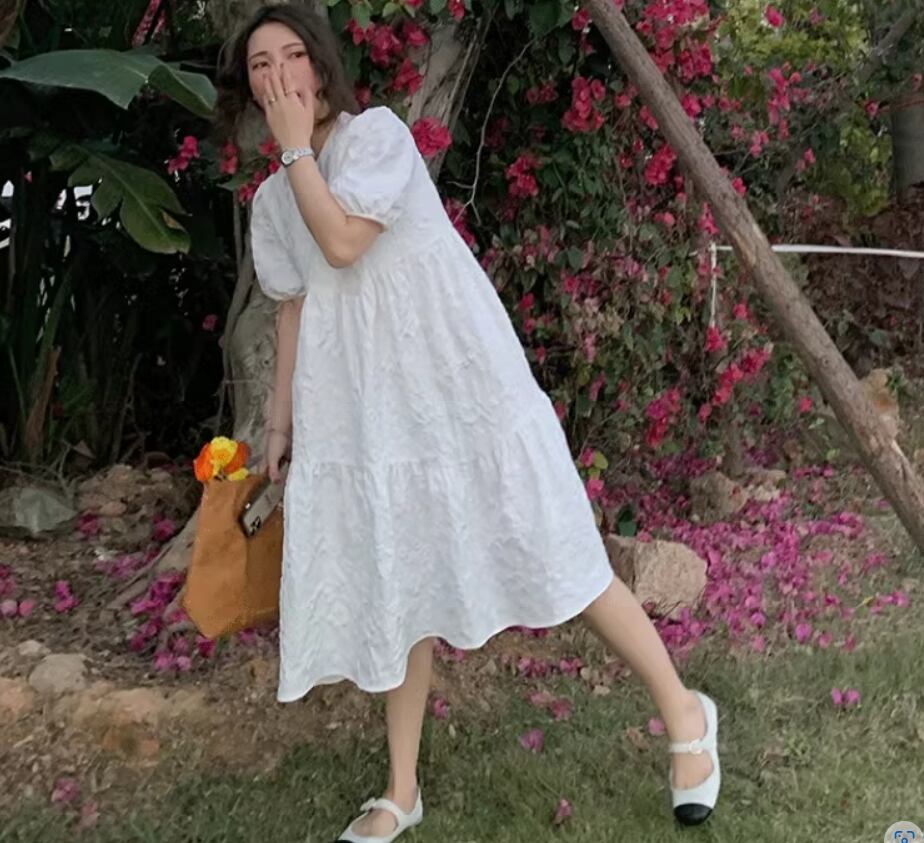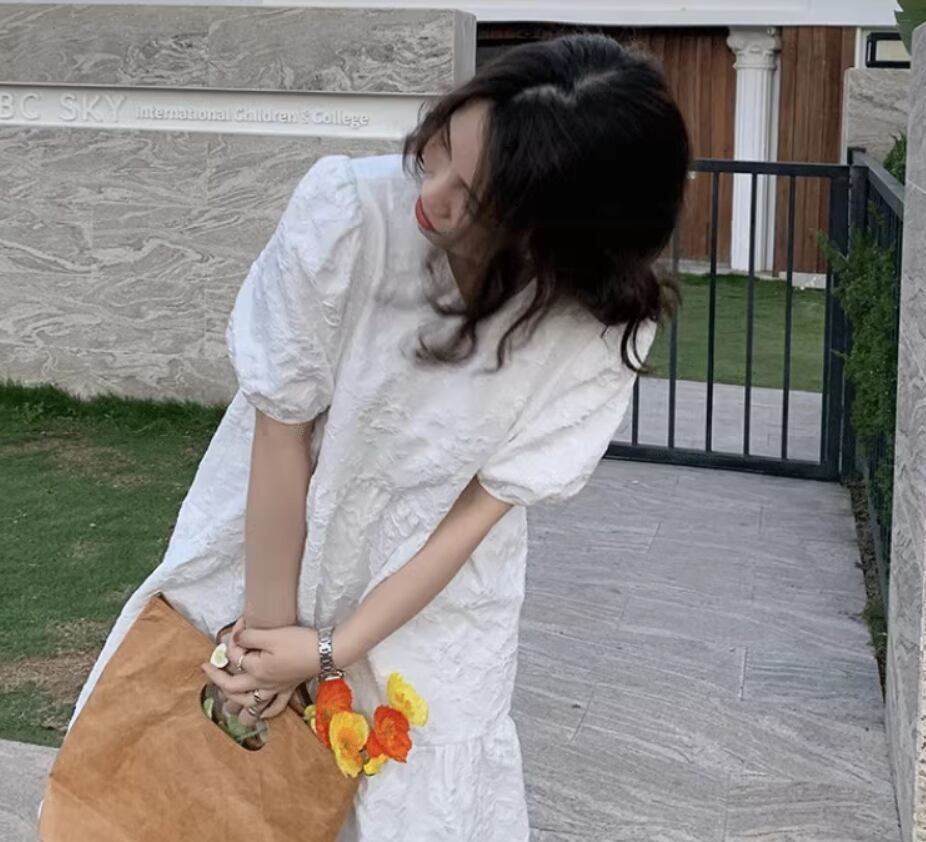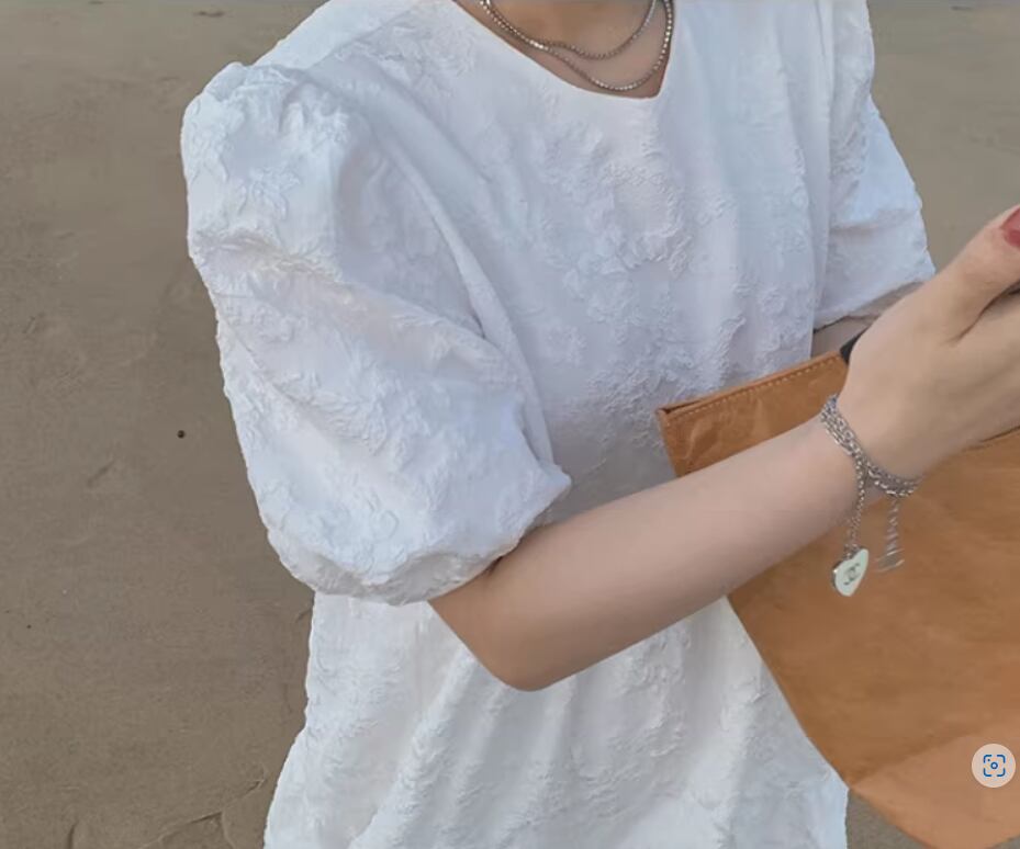 エンボス加工パフスリーブワンピース 袖あり 半袖 パフスリーブ ラウンドネック Aライン 切り替えデザイン 透け感 かわいい 大人可愛い シンプル 上品 おしゃれ お洒落 ガーリー 無地 春 夏 10代 20代 30代 レディース 女性用 お出かけ 休日 普段使い モテ S M L 白 ホワイト