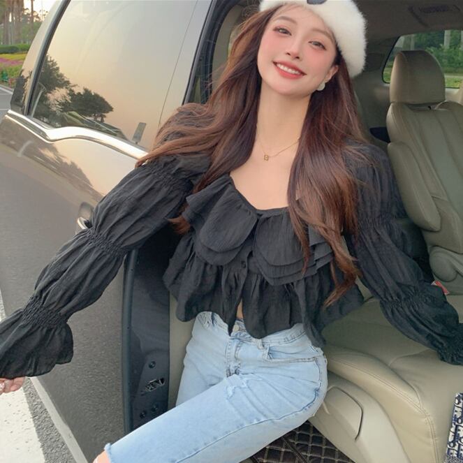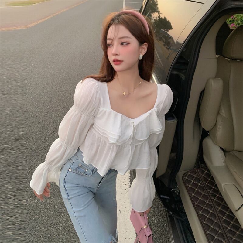 トップス ブラウス プルオーバー ショート丈 長袖 ベルスリーブ スクエアネック フリル 透け感 かわいい 大人可愛い きれいめ シンプル 上品 おしゃれ かっこいい レトロ こなれ感 きちんと 個性的 主役級 存在感 抜け感 キュート ナチュラル ガーリー ベーシック ガーリー レディース 女性用 ママ OL 通勤 オフィス 学生 通学 デート お出かけ お泊まり イベント 女子会 休日 アウトドア カフェ ショッピング レストラン コンパ レイヤード 重ね着 普段使い 着回し S M L モテ