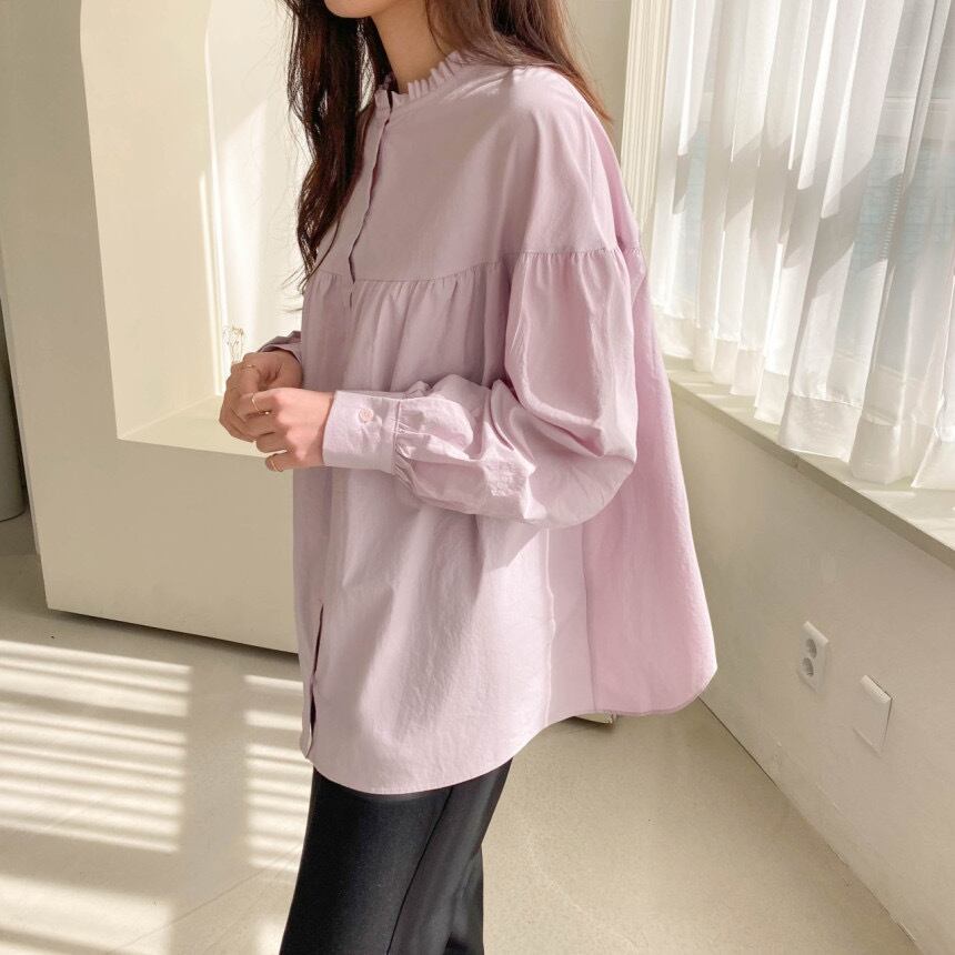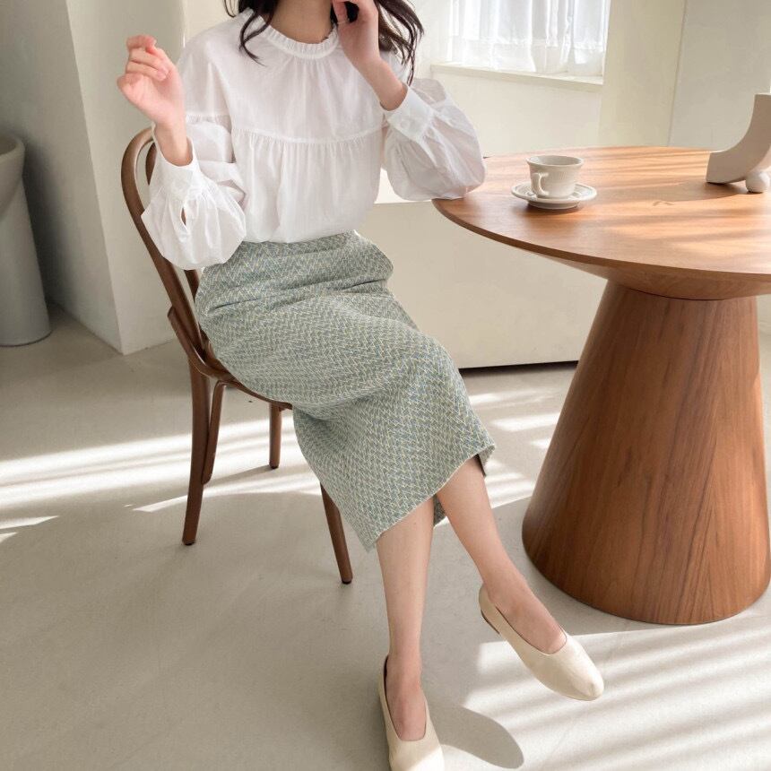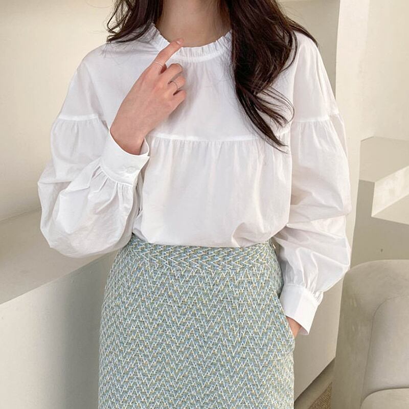 このブラウスは、ミディアム丈で着こなしやすく、長袖で季節を問わず活躍します。