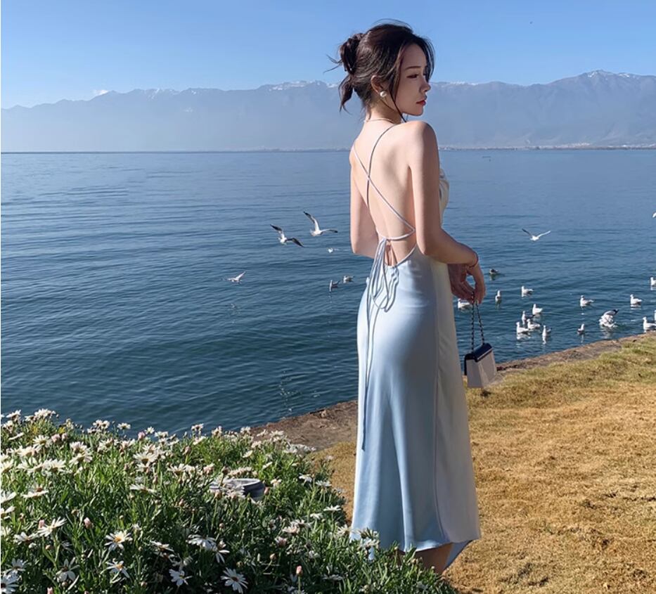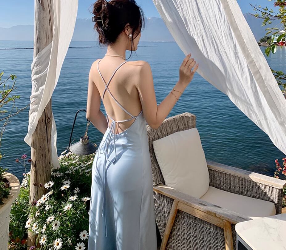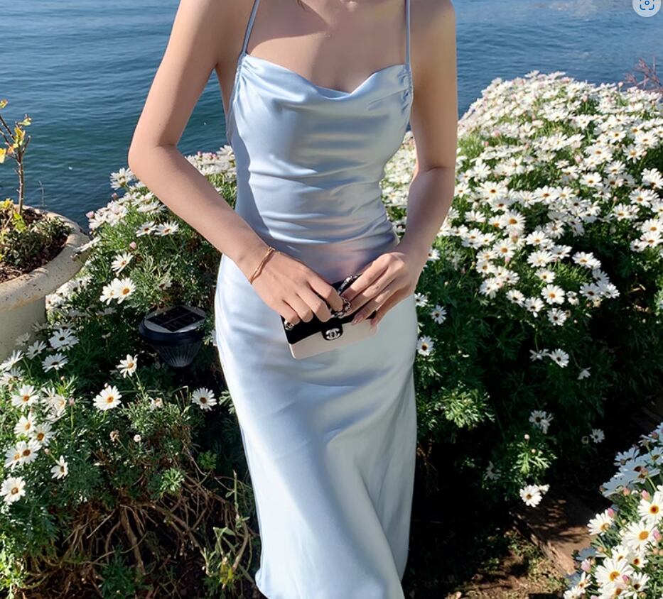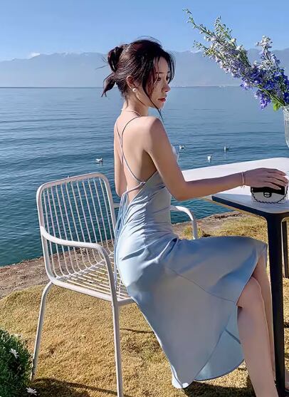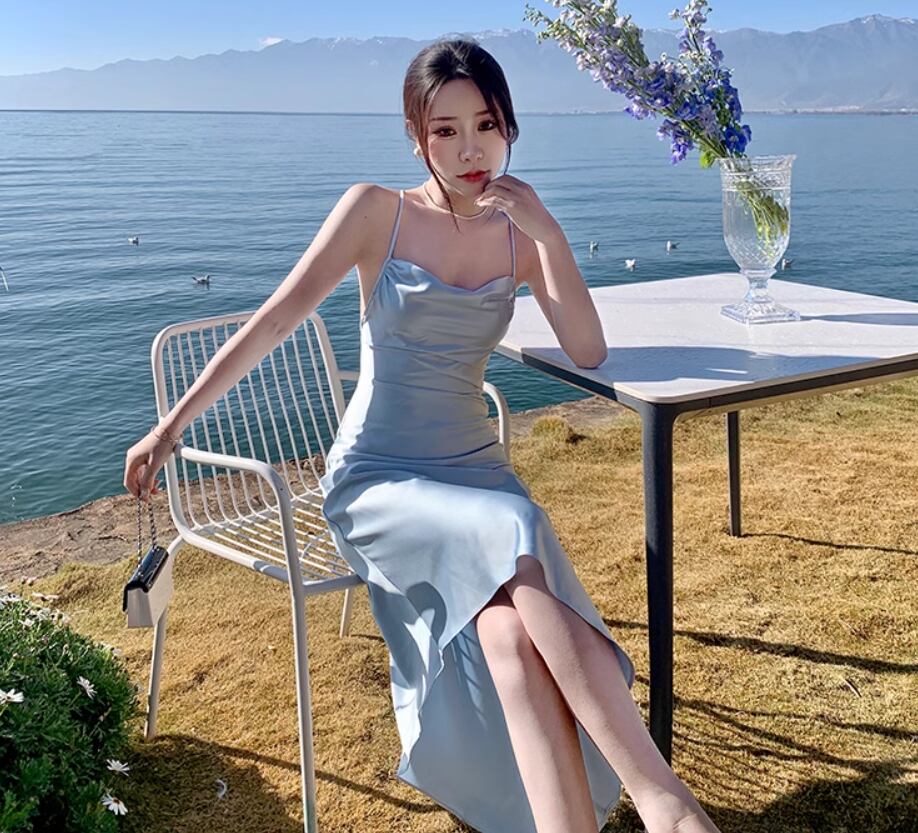 ドレス ワンピース パーティードレス 膝丈 袖なし スレンダー アシンメトリー バックコンシャス きれいめ シンプル 大人 上品 おしゃれ お洒落 セクシー エレガント 主役級 とろみ感 シンプル 華やか レトロ 無地 20代 30代 40代 レディース 女性用 S M L ライトブルー