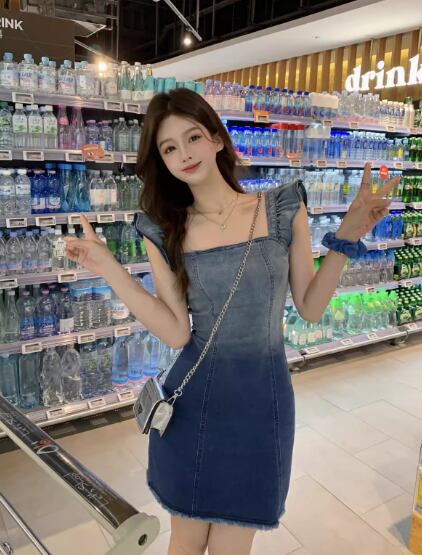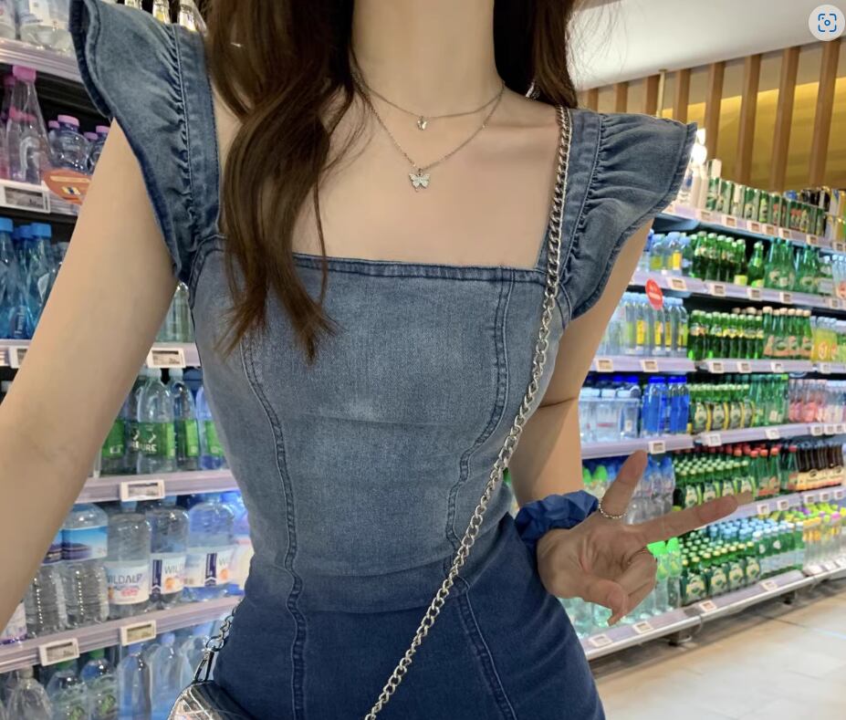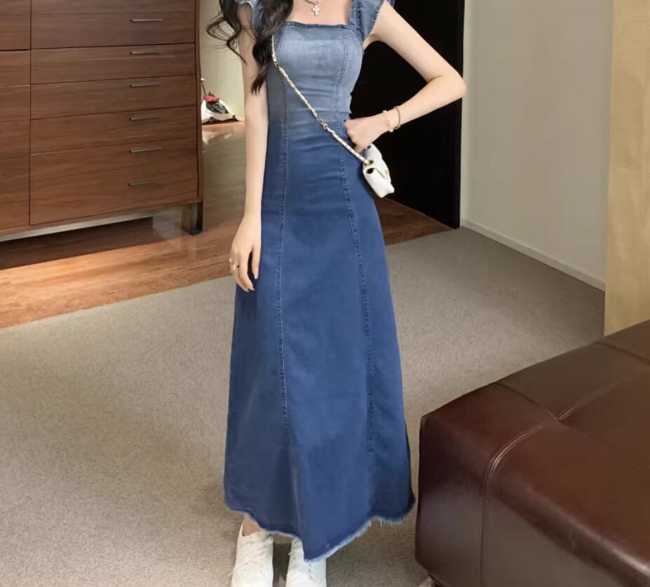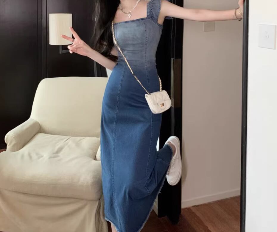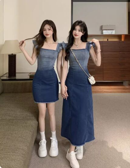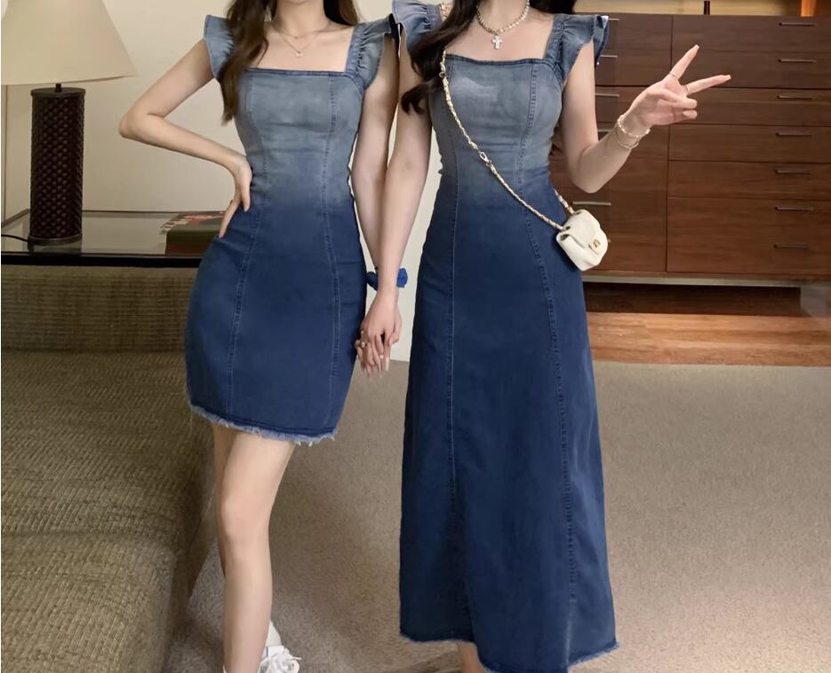 グラデーションワンピース デニムワンピース ショート丈 ロング丈 袖なし スクエアネック Aライン フリル バックスリット ファスナー かわいい 大人可愛い シンプル カジュアル おしゃれ お洒落 無地 夏 10代 20代 30代 レディース 女性用 デート お出かけ 休日 普段使い お揃い 双子 S M L 青 ブルー