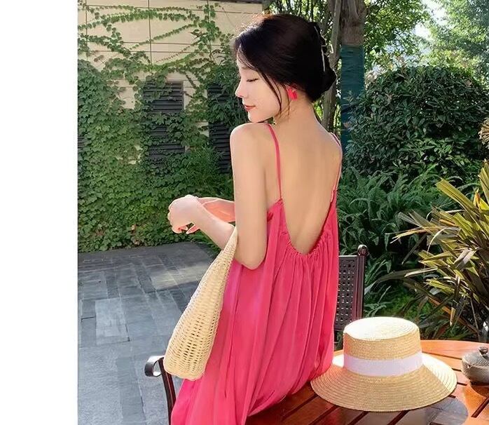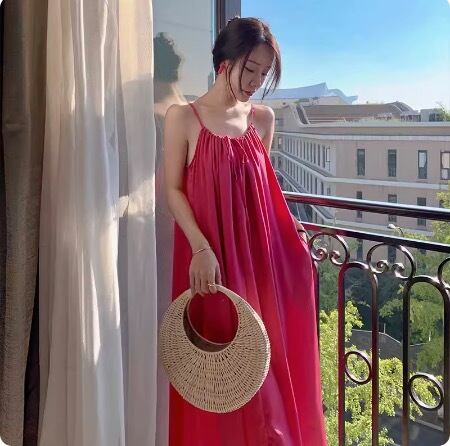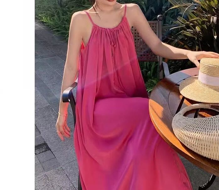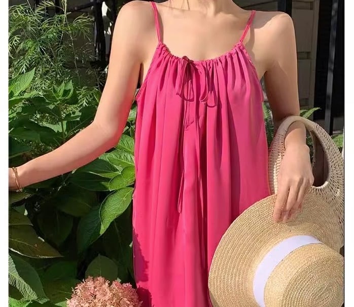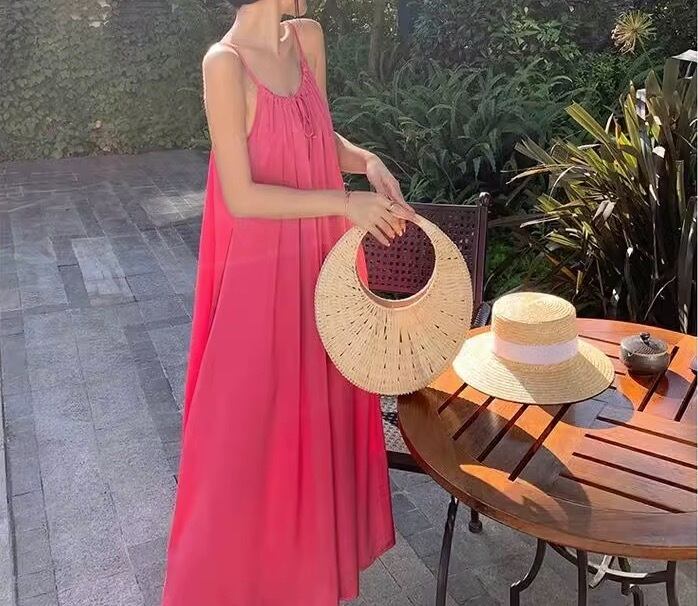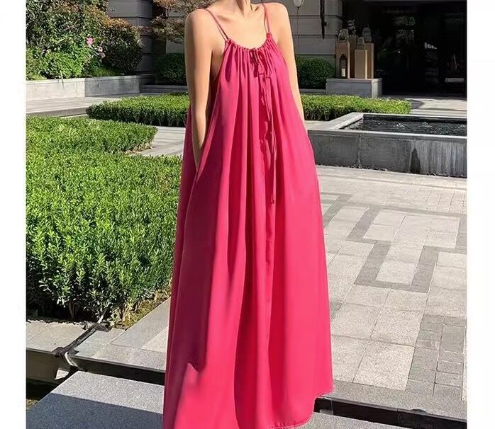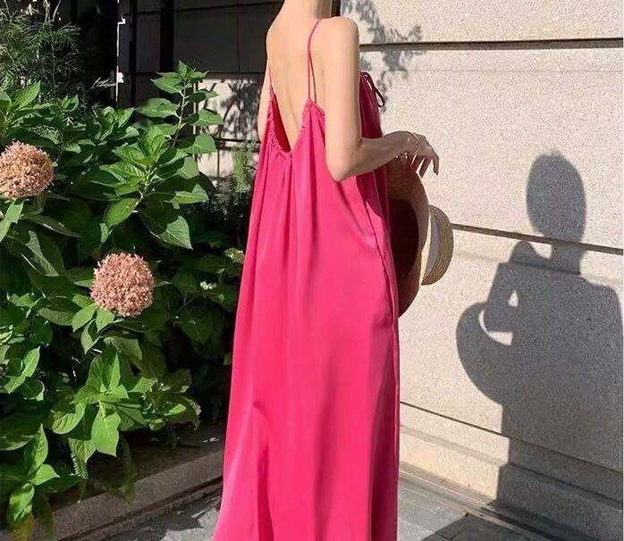 鮮やかなピンク色が目を引く、ヴァケーション気分を盛り上げるノースリーブワンピースが登場。足元まで広がるAラインシルエットで、女性らしさを引き立てます。フレアデザインが揺れるたびに、リゾート地の風を感じるような爽やかさを演出。ラウンドネックとスリットが上品な印象を与え、特別な日のお出かけや女子会、休日のデートにもぴったりです。