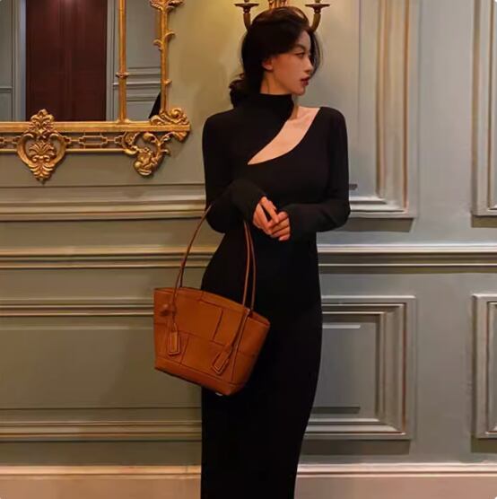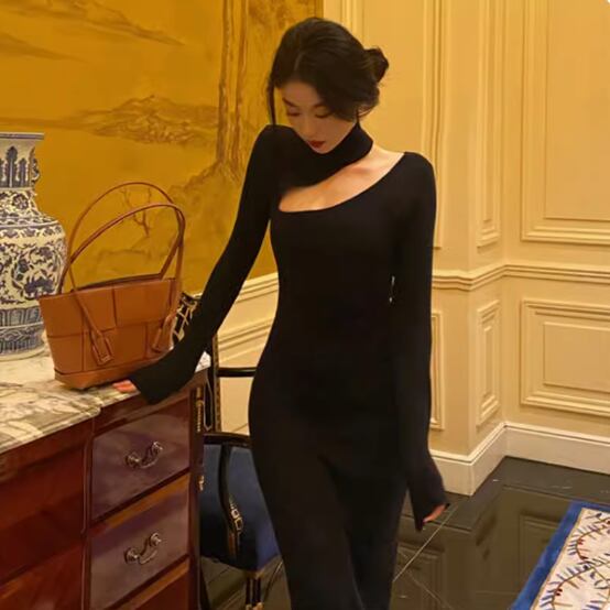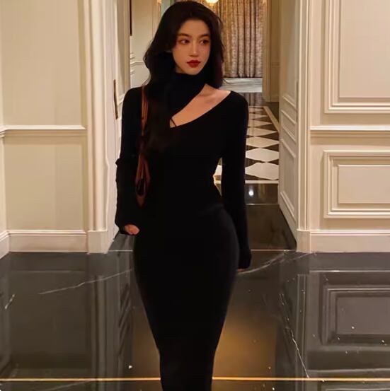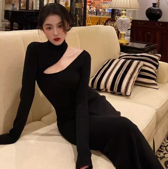 パーティードレス ワンショルダー ロング スリット 無地 ロング 長袖 ホームパーティーアイテム 謝恩会 結婚式・二次会 かわいい 大人可愛い きれいめ シンプル 上品 おしゃれ 誕生日 パーティー イベント 女子会 発表会 S M L XL ブラック
