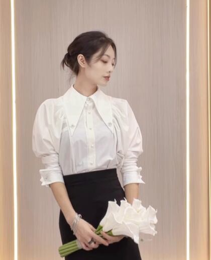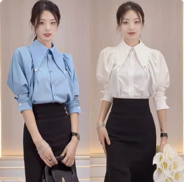 トップスは襟付きの長袖でさりげないおしゃれ感を演出します。