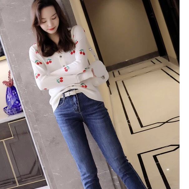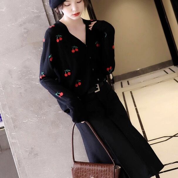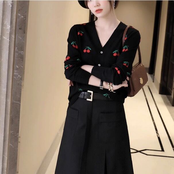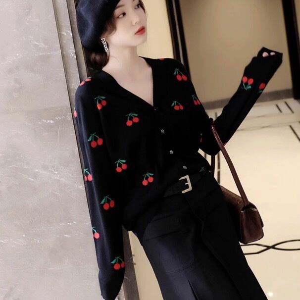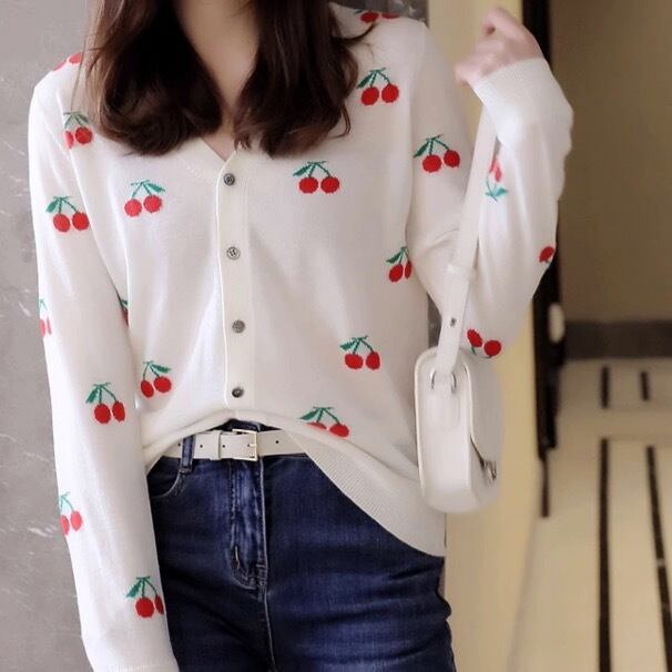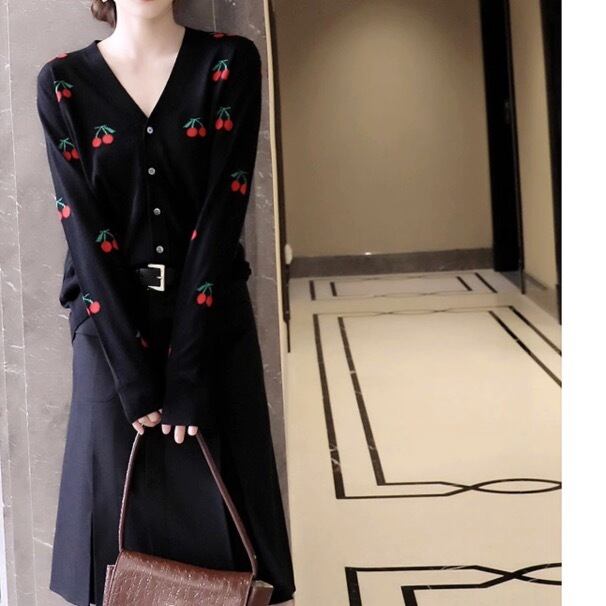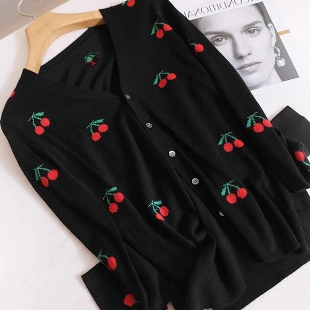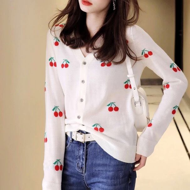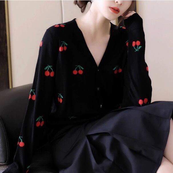 チェリー柄のショート丈カーディガン、大人可愛いデザインが魅力の一枚です。Vネックで襟なしのシンプルなデザインながら、袖には萌袖が施され、女性らしい華やかさをプラスしています。前開きの便利さも嬉しいポイント。デートや女子会、お出かけなど様々なシーンで活躍すること間違いなしです。