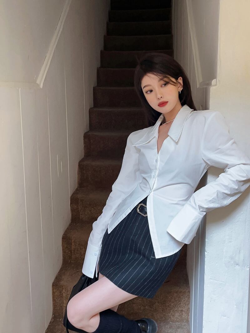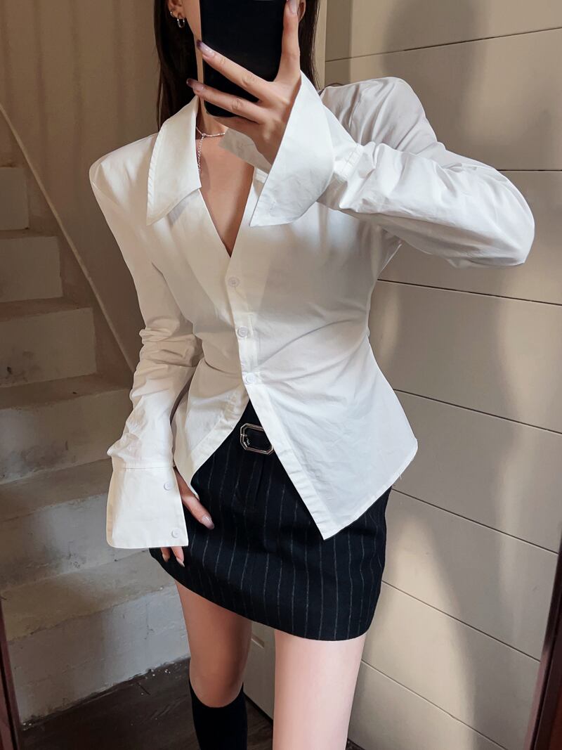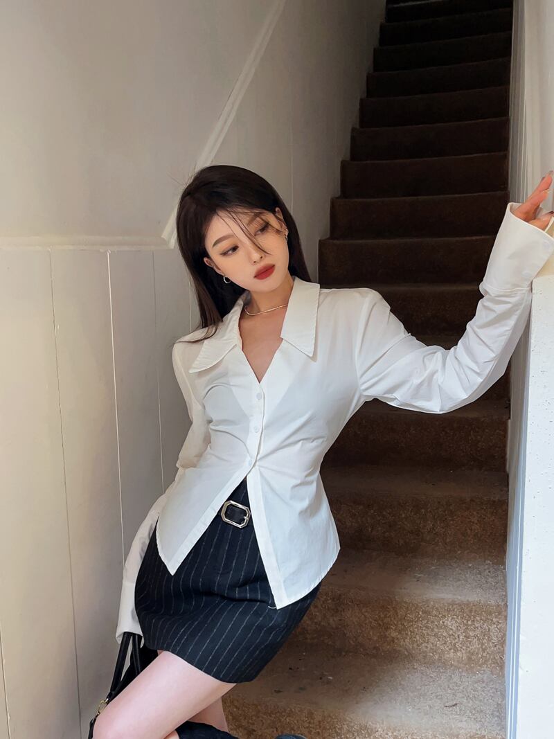 驚きの存在感を放つ、大人女子にぴったりの開襟ホワイトシャツ。襟元のディテールやボリューム袖が、シンプルながらもセクシーな雰囲気を演出します。デートや女子会、お出かけなど、さまざまなシーンで活躍する一枚です。