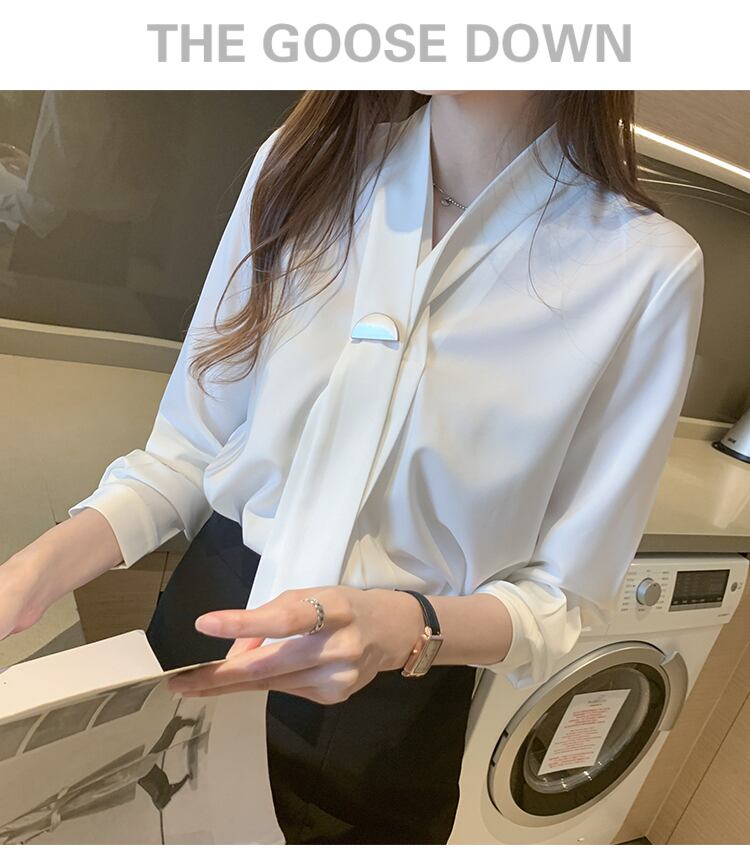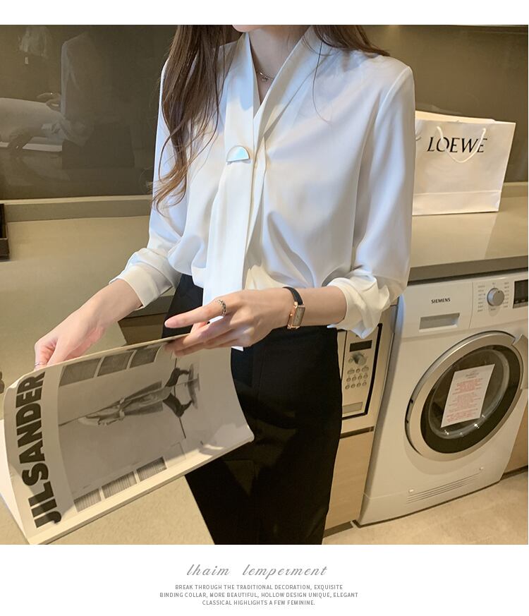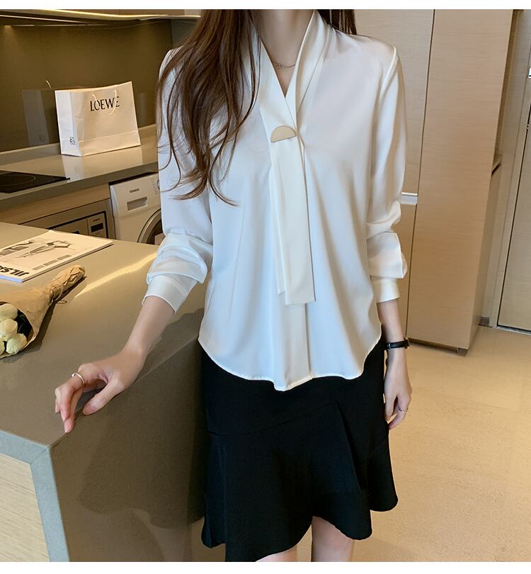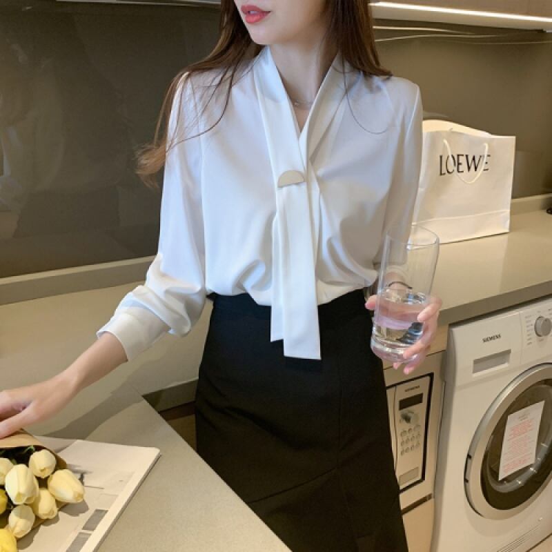リボンタイが可愛らしいエレガントなブラウスが登場しました!清楚な印象を演出してくれるホワイトカラーが、女性らしさを引き立てます。袖あり、襟なしのシンプルなデザインで、さりげないおしゃれ感を演出します。