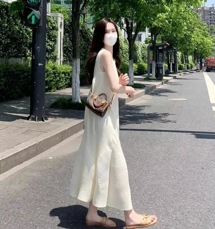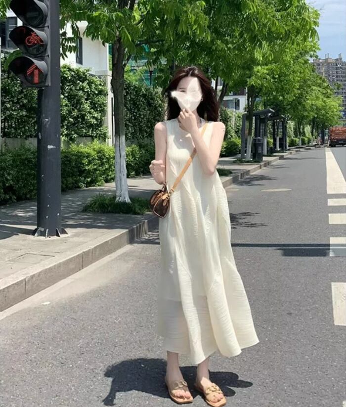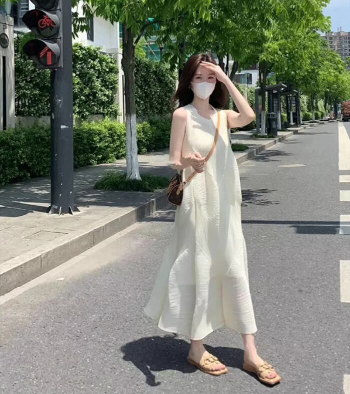 プリーツデザインノースリーブワンピース ロング丈 Aライン プリーツ 透け感 かわいい 大人可愛い きれいめ シンプル 上品 おしゃれ お洒落 大人女子 無地 春 夏 20代 30代 40代 レディース 女性用 お出かけ 休日 リゾート 旅行 海 着回し 普段使い 楽ちん S M L XL 白 ホワイト