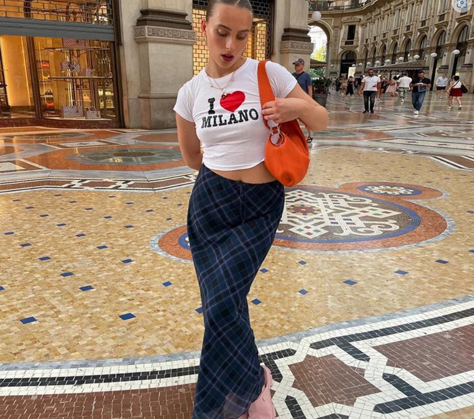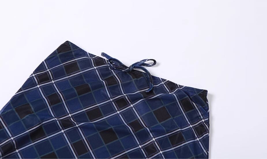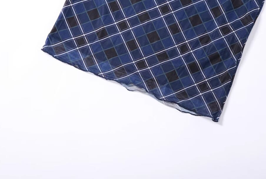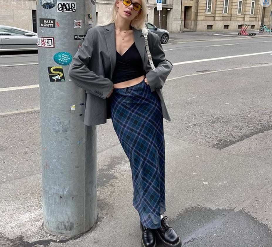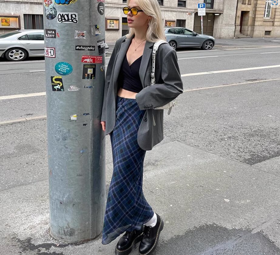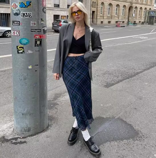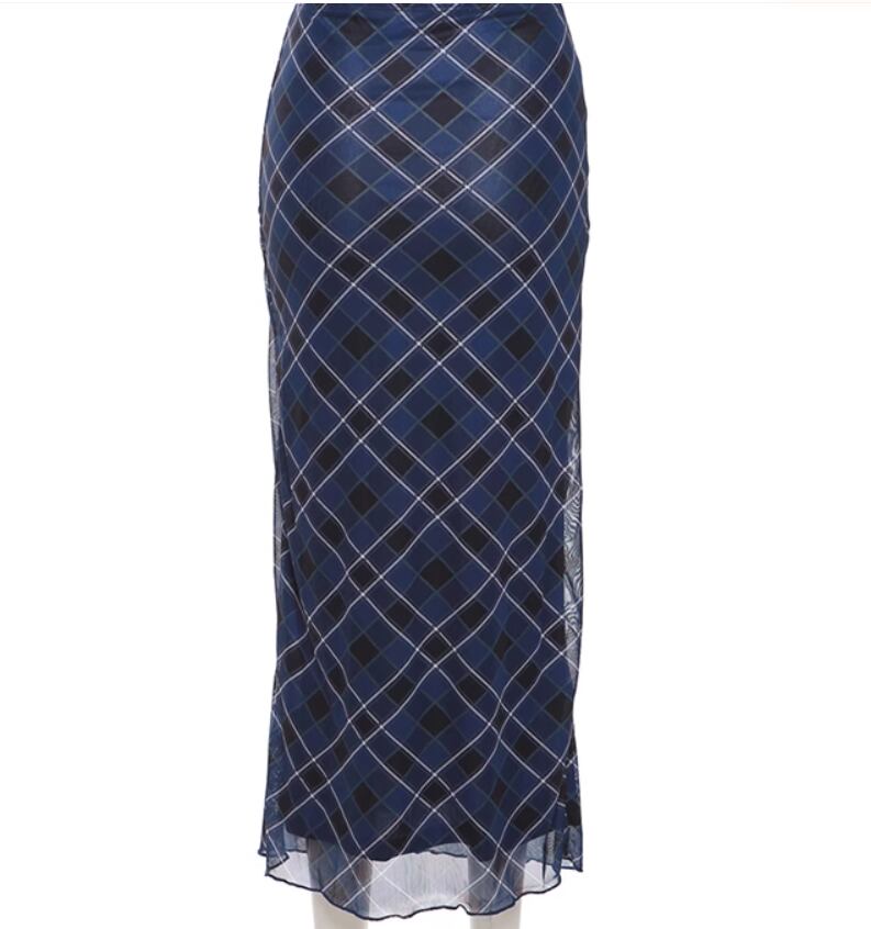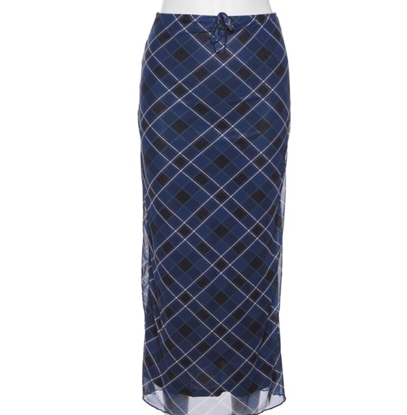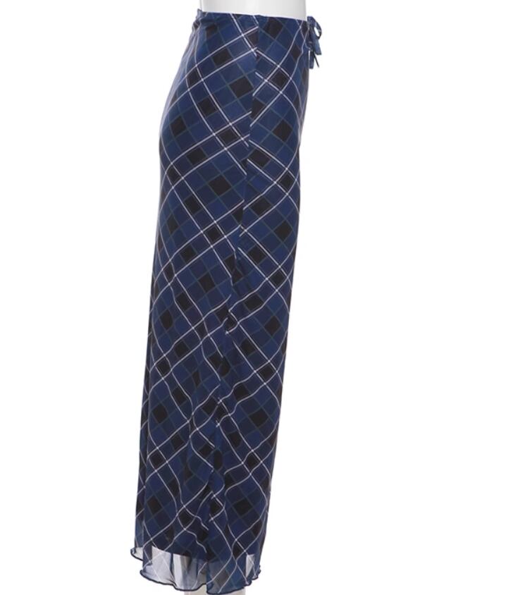 落ち着いたブルーのチェック柄がおしゃれなロングスカート