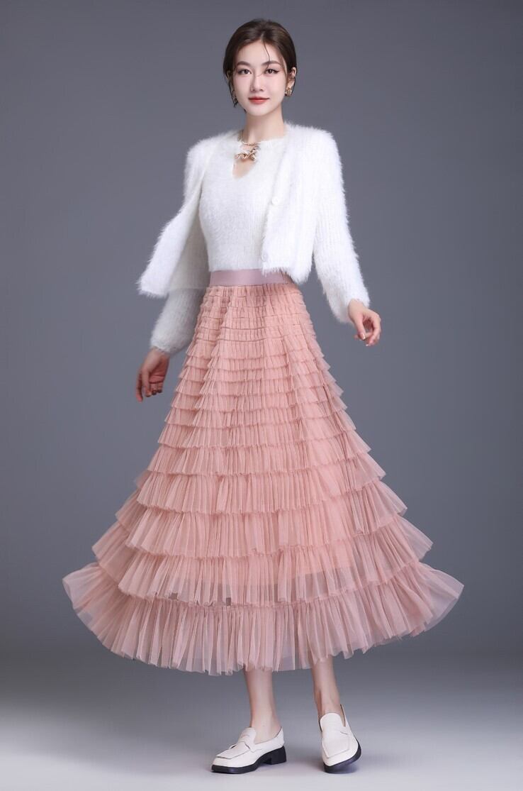 女性らしさを引き立てる、レディースケーキスカート。Aラインのシルエットが美しく、ミモレ丈で大人可愛さを演出します。ウエストはゴム仕様で楽ちんな着心地。シフォン素材とフリルディテールが、ガーリーでラブリーな印象を与えます。