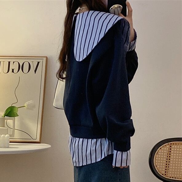 このセーターは、ビックカラーと重ね着風のデザインが特徴です。