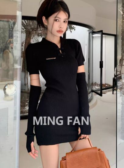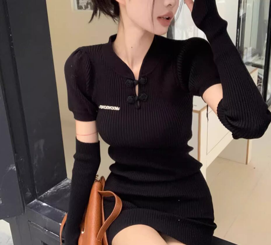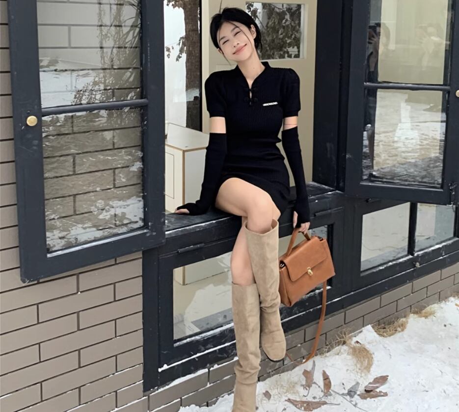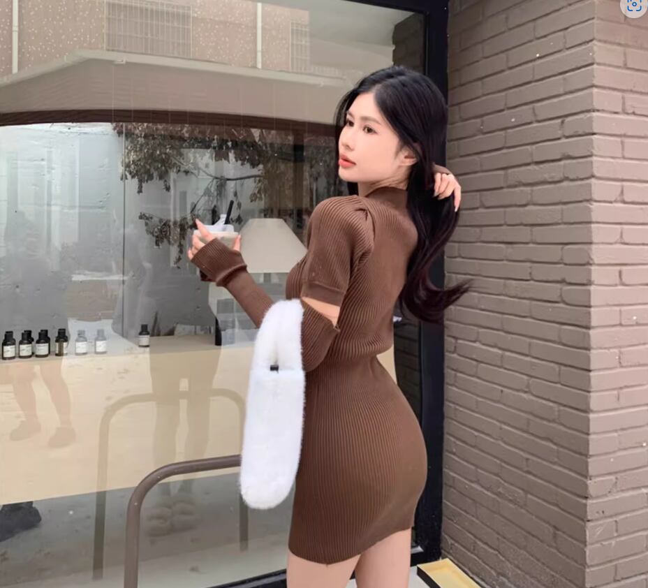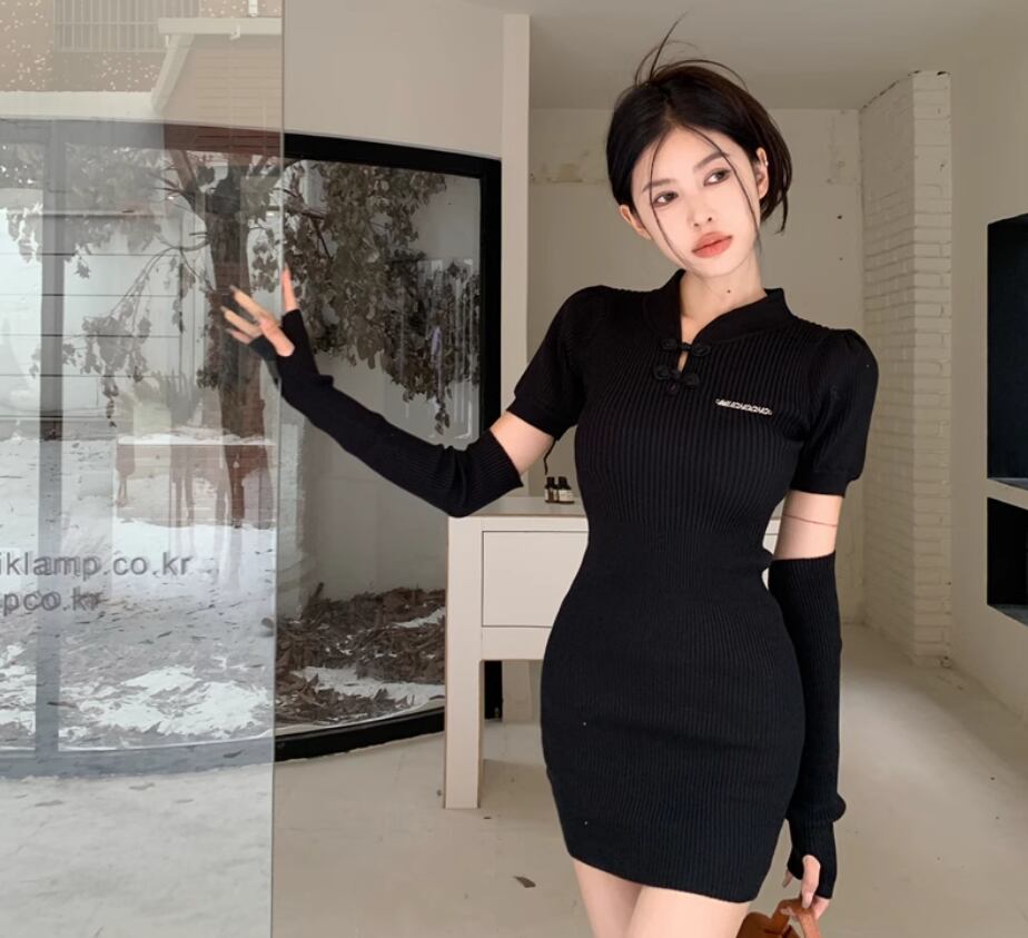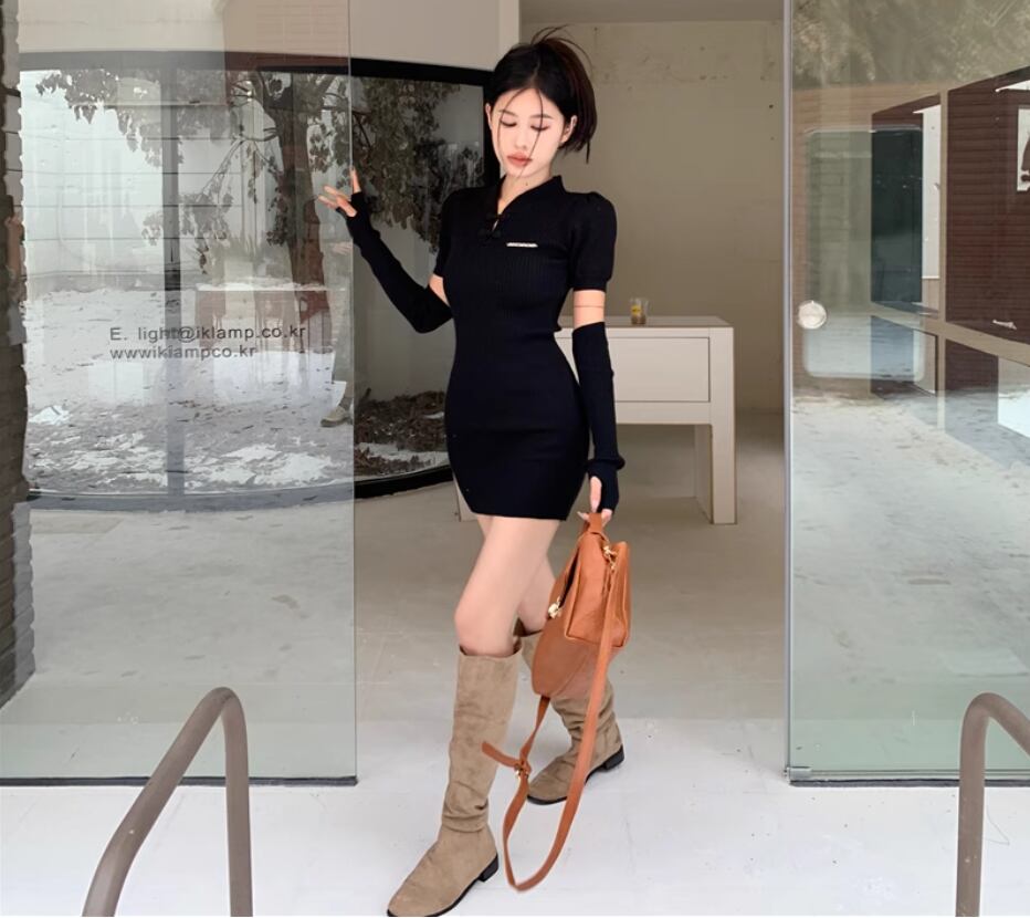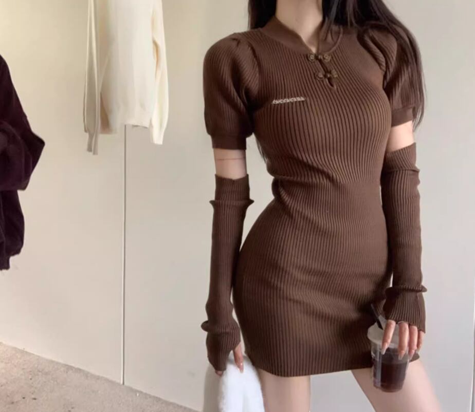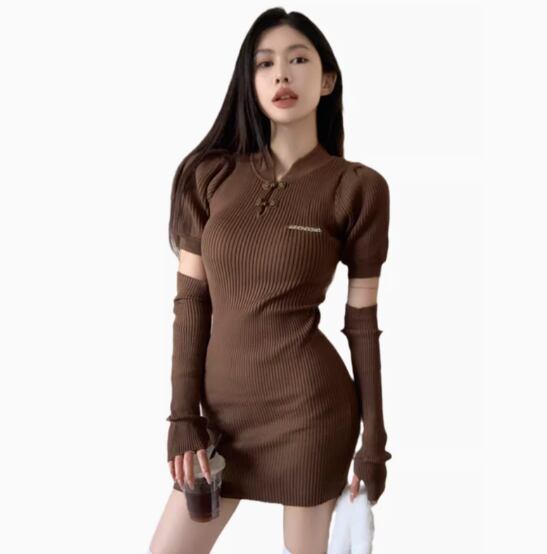 ハンドカバー付きニットワンピース ワンピース ニットワンピース ミニ丈 袖あり 半袖 スタンドカラー リブニット 伸縮性 かわいい シンプル カジュアル おしゃれ お洒落 ガーリー 無地 秋 冬 10代 20代 レディース 女性用 デート お出かけ 休日 着回し 普段使い S M L 黒 ブラック 茶色 ブラウン