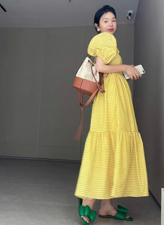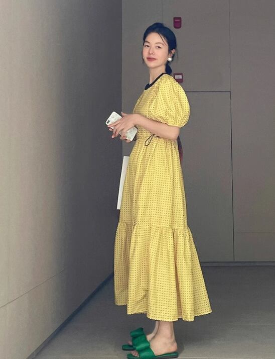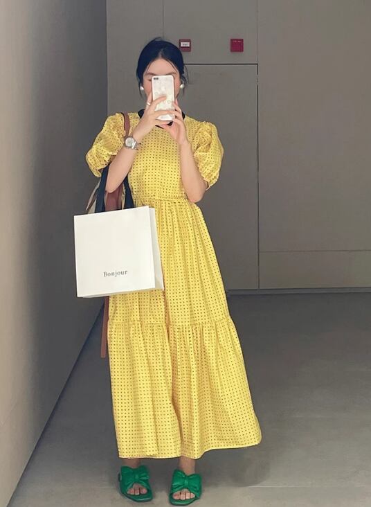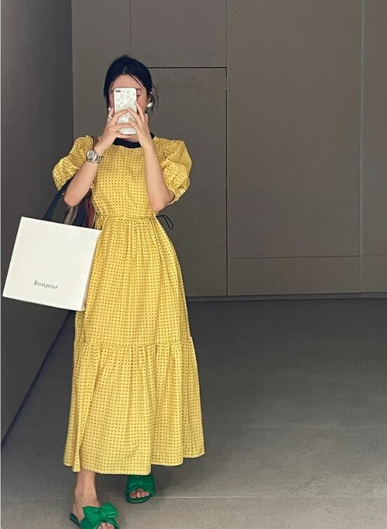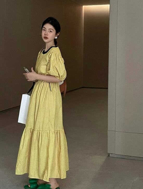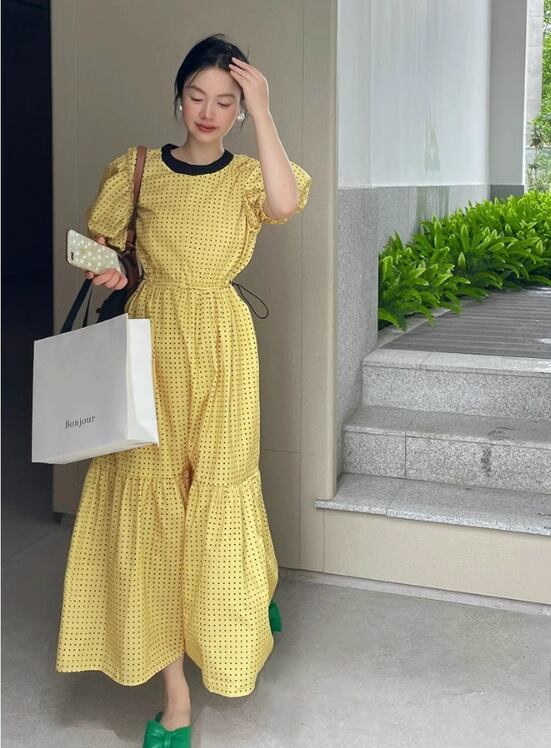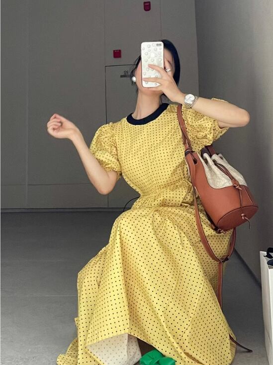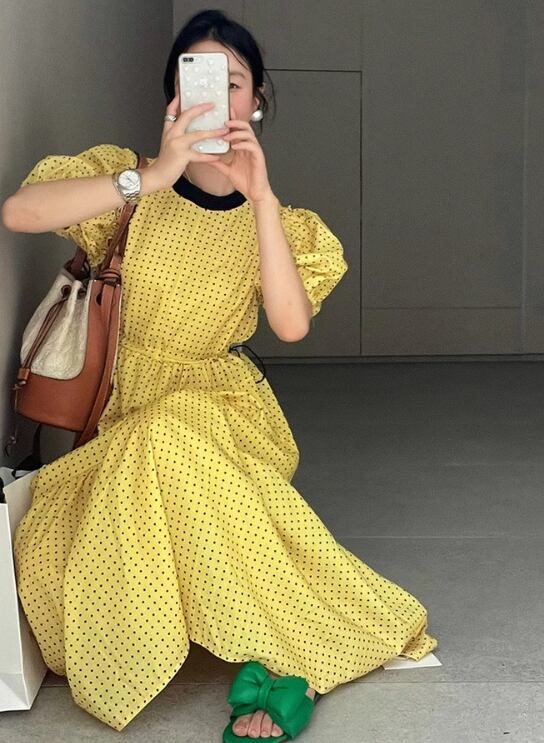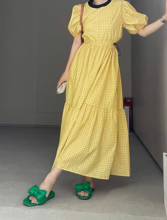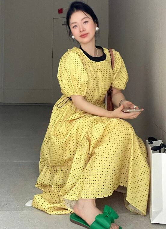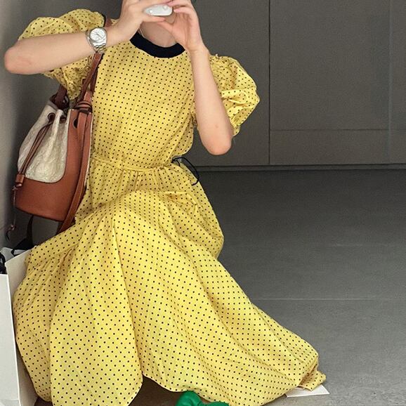 レディース ワンピース ミモレ 半袖 パフスリーブ ラウンドネック フレア Aライン ウエストマーク ハイウエスト かわいい 大人可愛い きれいめ カジュアル おしゃれ レトロ こなれ感 ラフ ガーリー ルーズ ラブリー キュート ドット柄 夏 学生 学校 通学 デート お出かけ 女子会 ショッピング カフェ 韓国 コーデ 楽ちん 体型カバー 普段使い 着回し モテ トレンド 流行 インスタ映え M L XL ゆったり イエロー