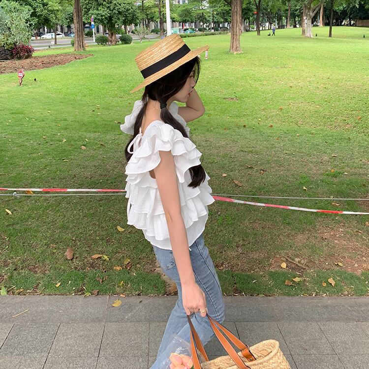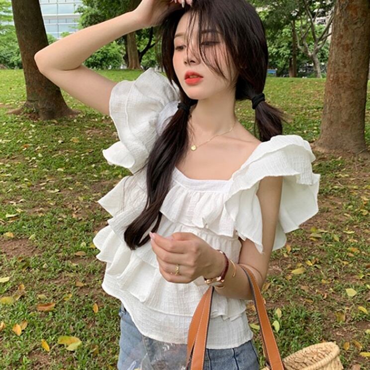 トップス ブラウス ショート丈 半袖 スクエアネック フリル 段フリル かわいい 大人可愛い きれいめ シンプル 上品 おしゃれ かっこいい レトロ こなれ感 きちんと 個性的 主役級 存在感 抜け感 春 夏 キュート ナチュラル ガーリー ベーシック フォーマル 清楚 無地 レディース 女性用 ママ OL 通勤 オフィス 学生 通学 デート お出かけ お泊まり イベント 女子会 休日 アウトドア カフェ ショッピング レストラン コンパ レイヤード 重ね着 普段使い 着回し デイリー ワンサイズ モテ