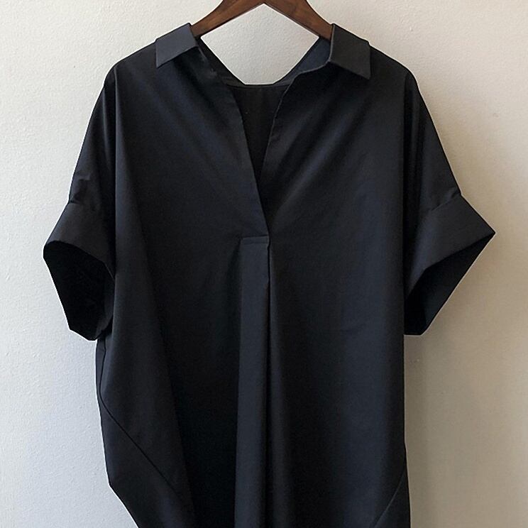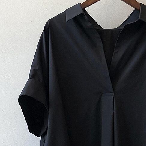 このトップスは、シックで上品な印象のミディアム丈半袖ブラウスです。