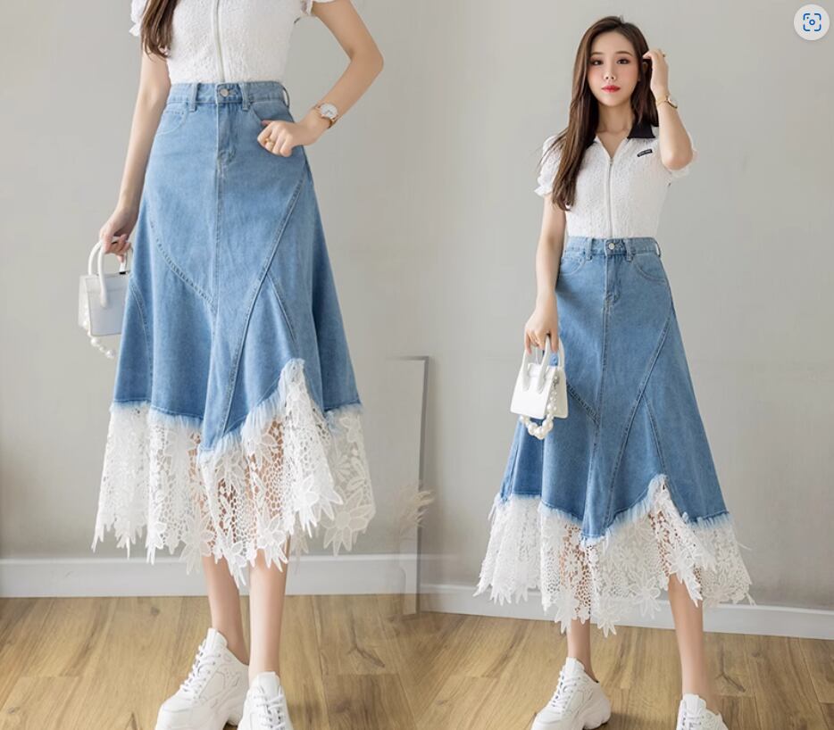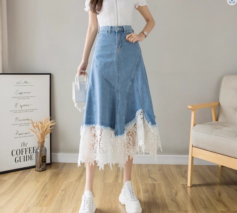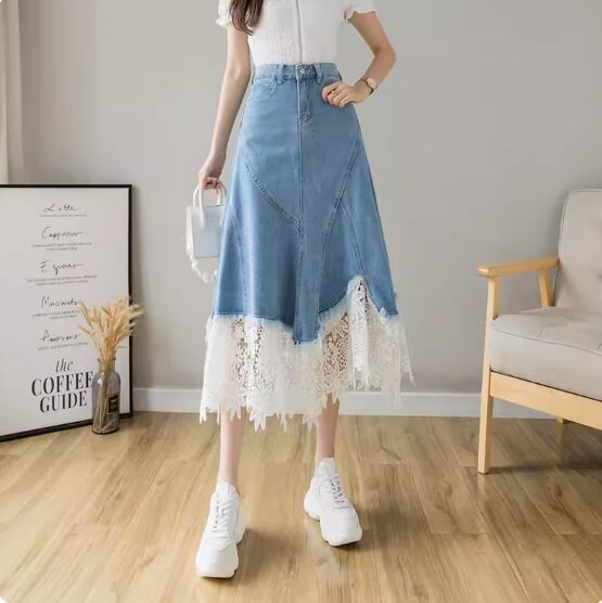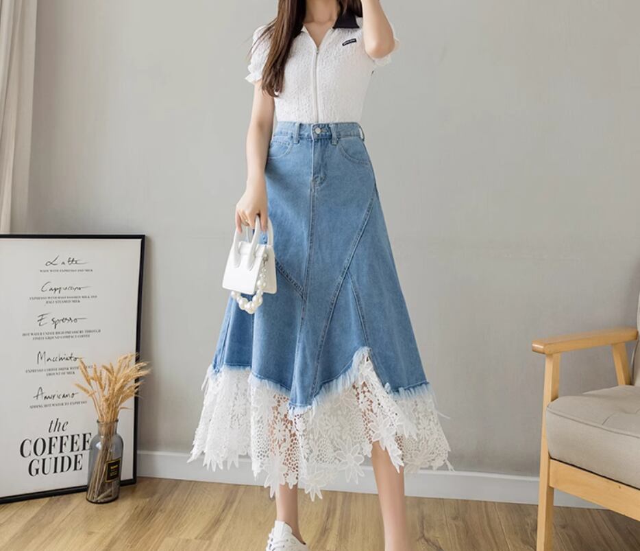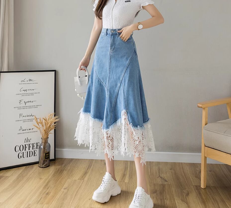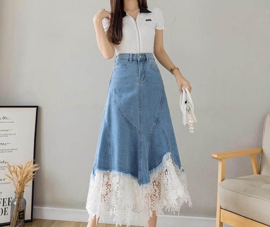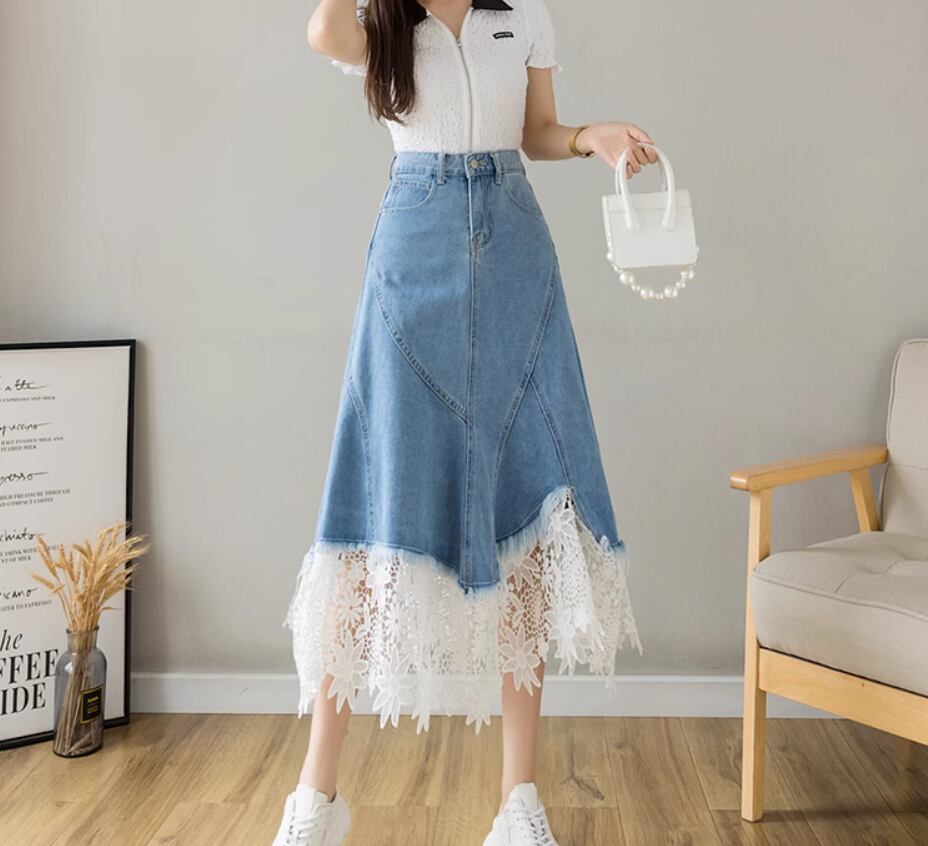 デニム×レースのドッキングデザインがおしゃれなミディアムスカート