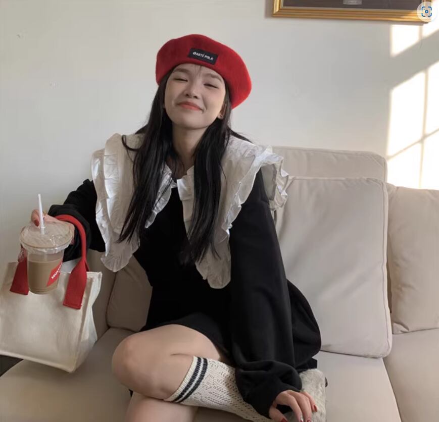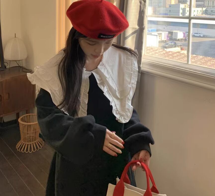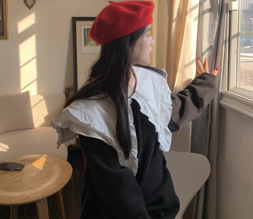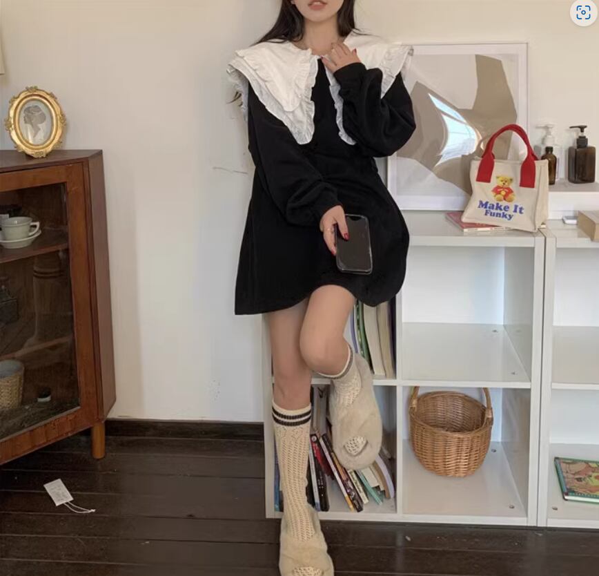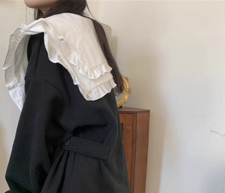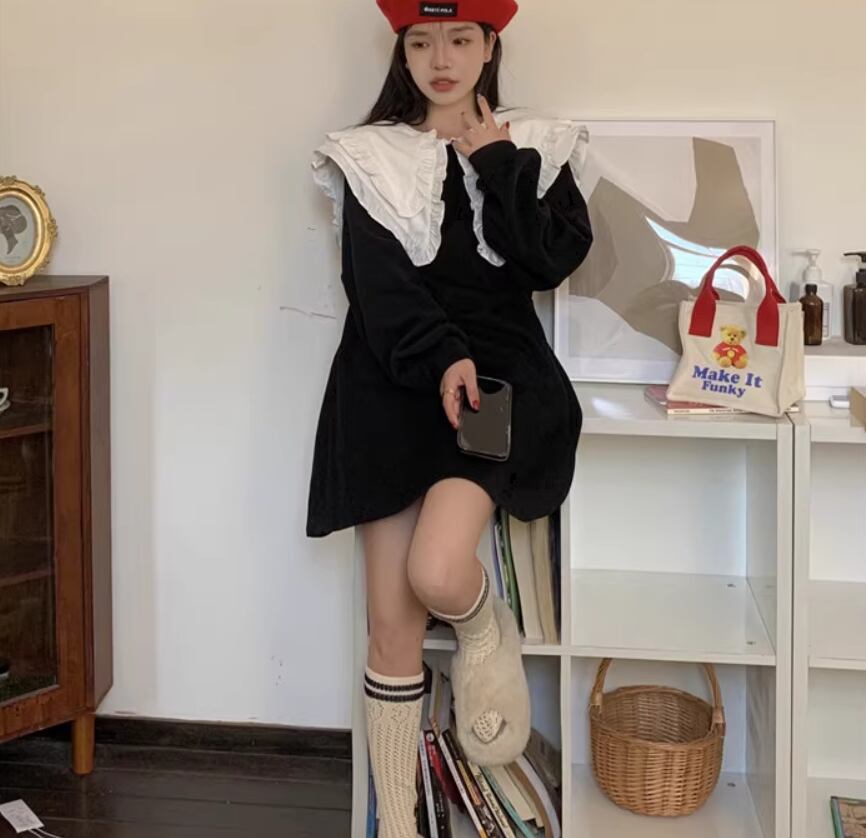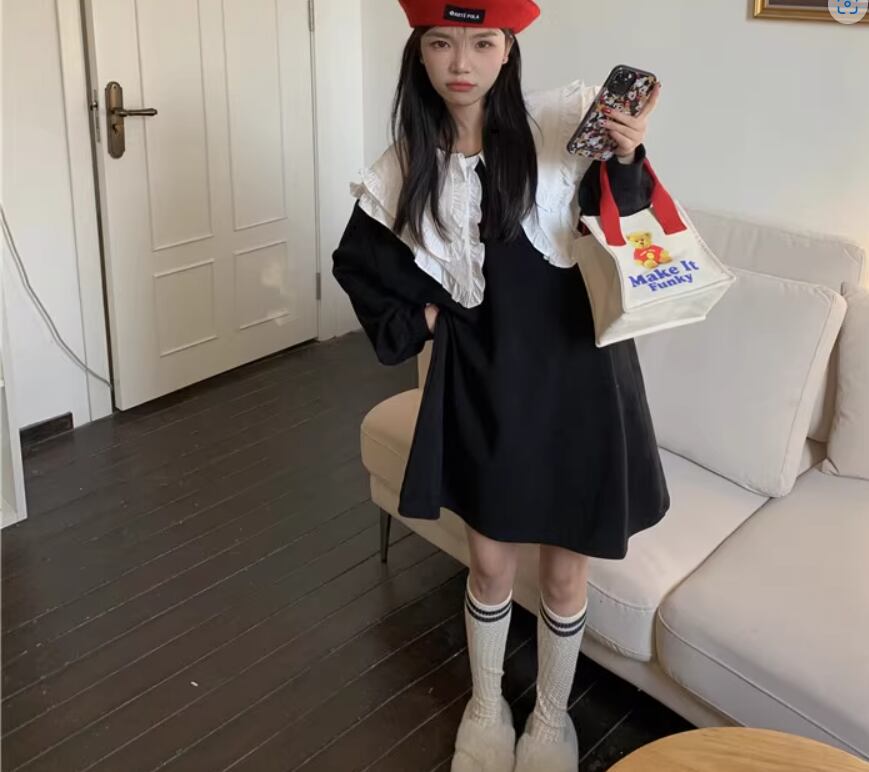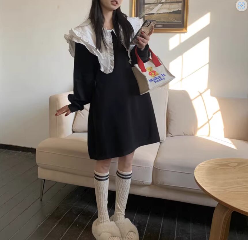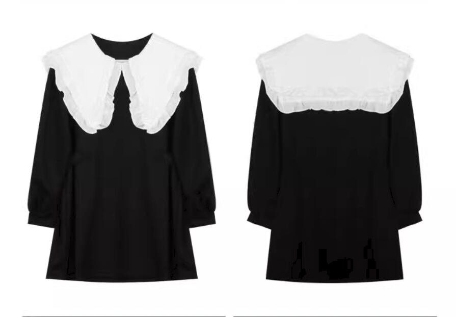 フリル襟ワンピース 膝上 袖あり 長袖 襟付き Aライン フリル かわいい おしゃれ お洒落 レトロ ガーリー 個性的 存在感 無地 春 秋 10代 20代 レディース 女性用 お出かけ 休日 イベント 着回し 普段使い 楽ちん フリーサイズ 黒 ブラック