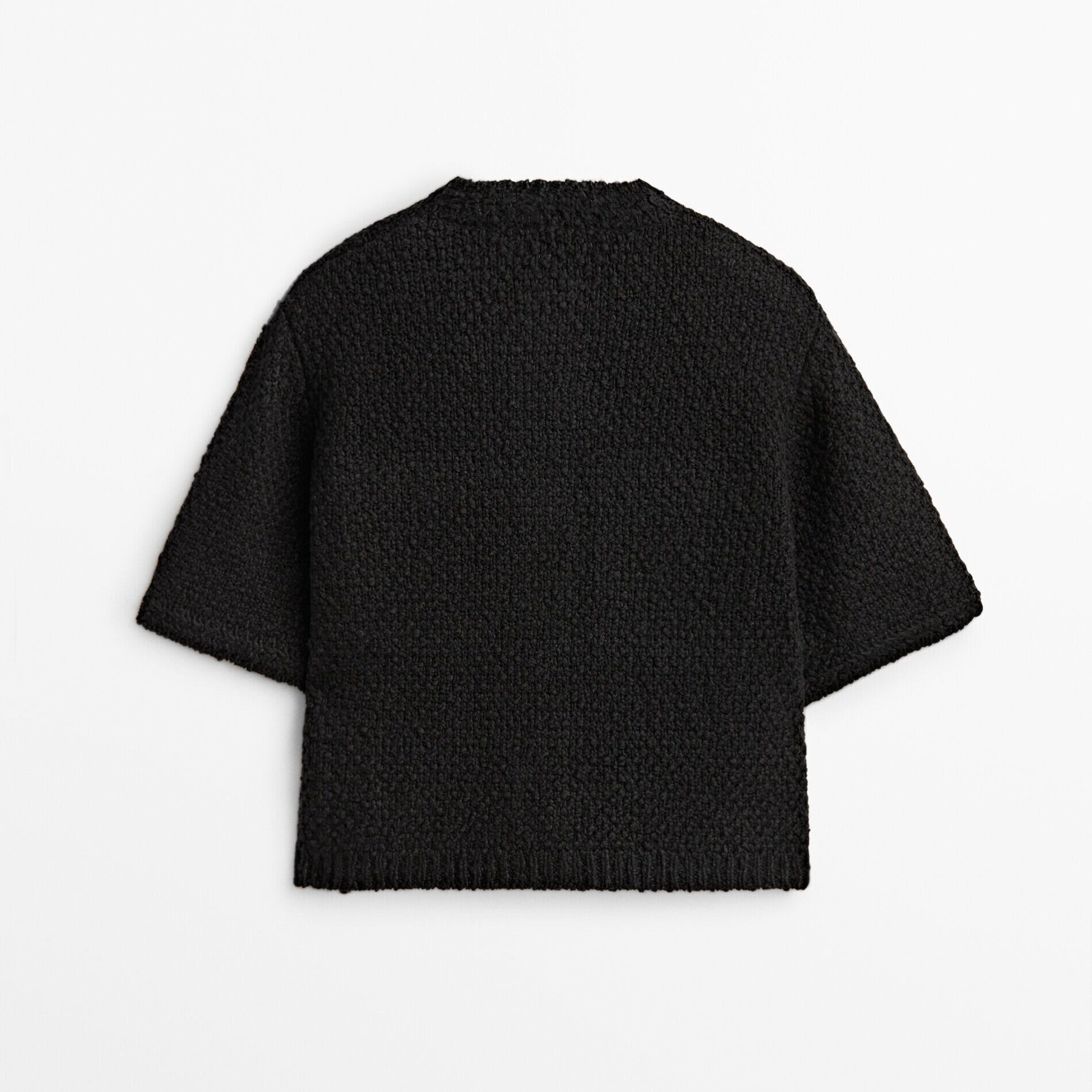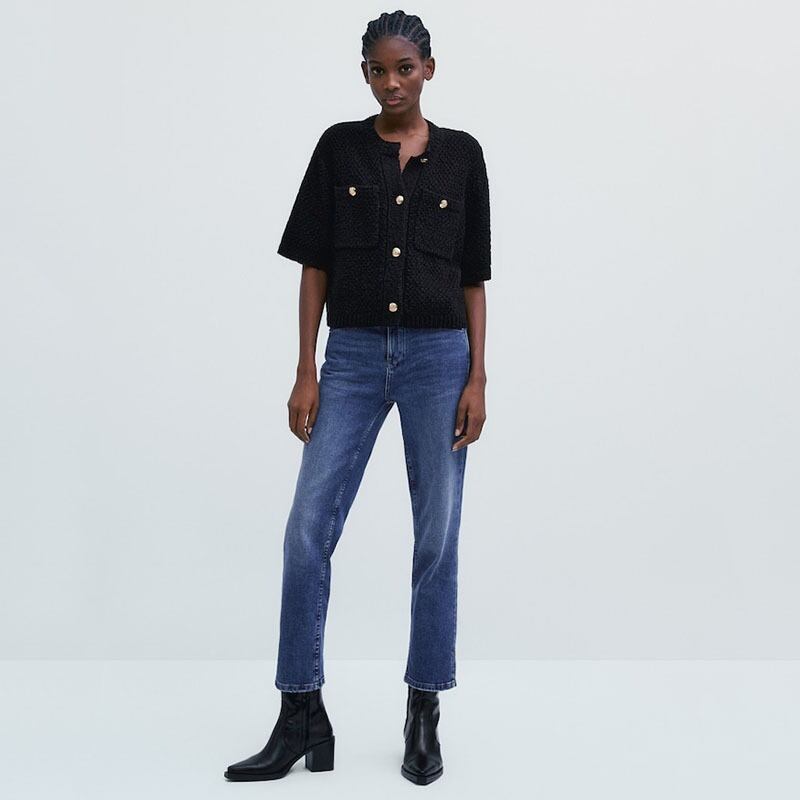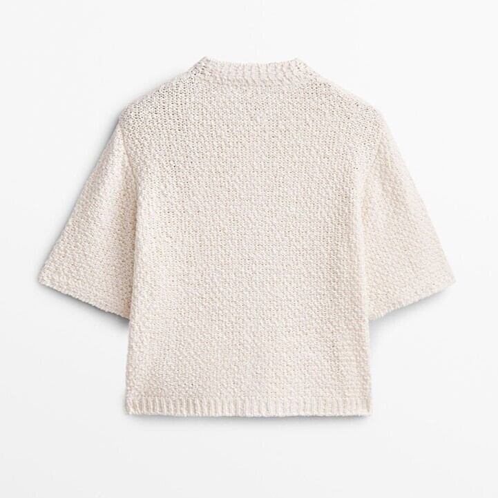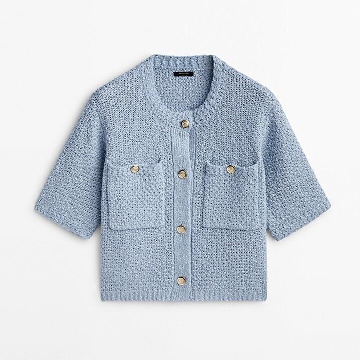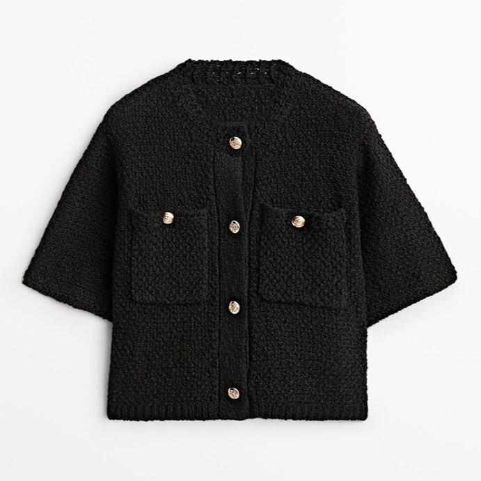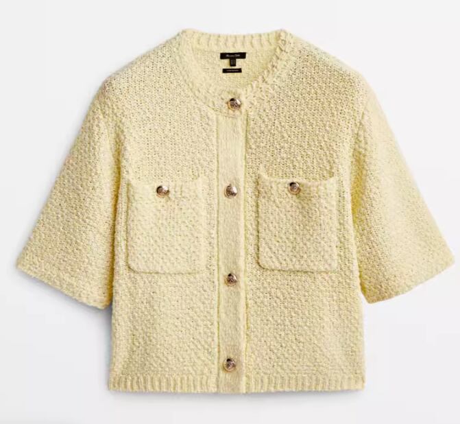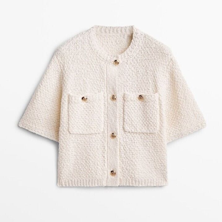 ポケットがアクセントとなる、可愛らしい半袖ニットカーディガン。