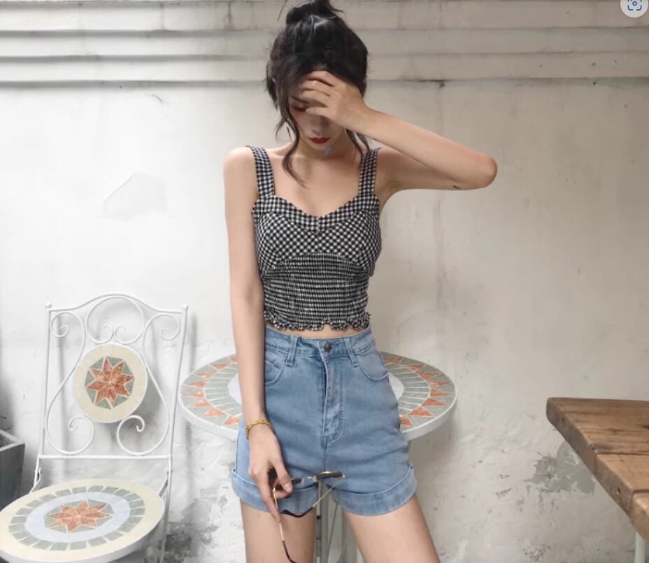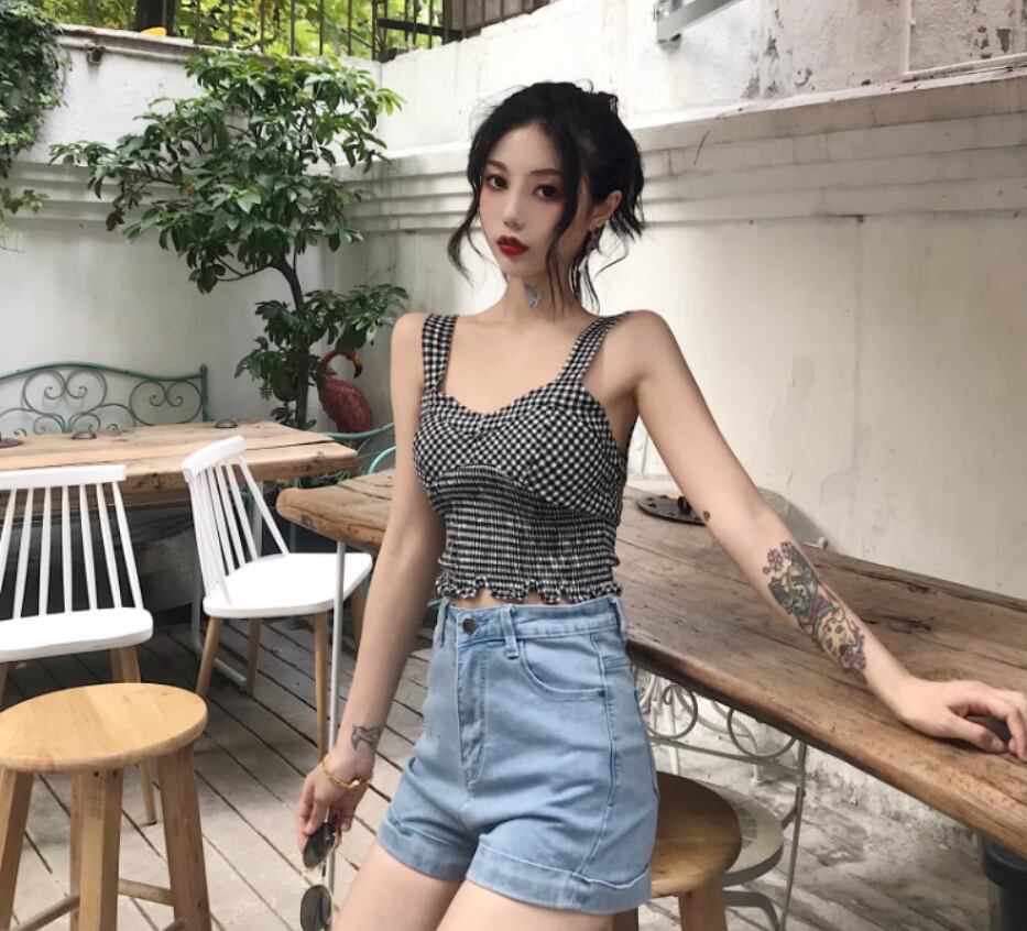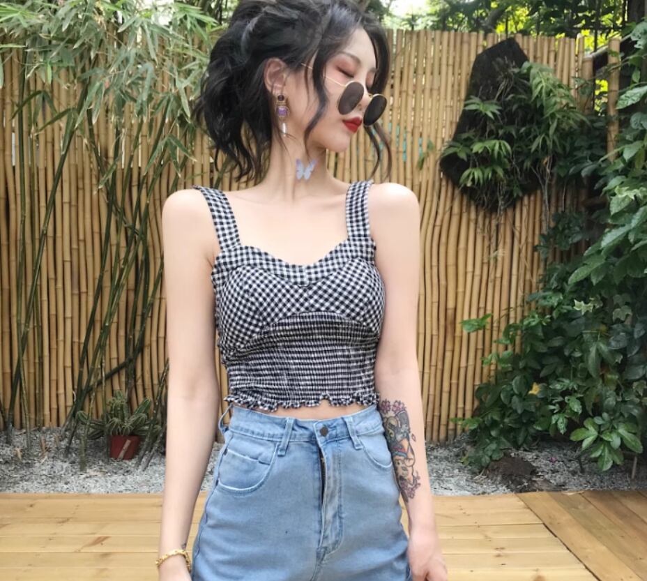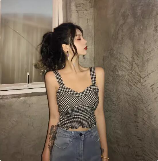 チェック柄シャーリングキャミソール トップス ショート丈 袖なし Vネック スリム 細身 伸縮性 かわいい カジュアル おしゃれ お洒落 ラブリー キュート ガーリー チェック柄 夏 10代 20代 レディース 女性用 お出かけ 休日 リゾート 旅行 海 プール 着回し 普段使い 重ね着 S M L XL 黒 ブラック