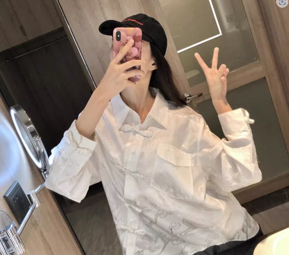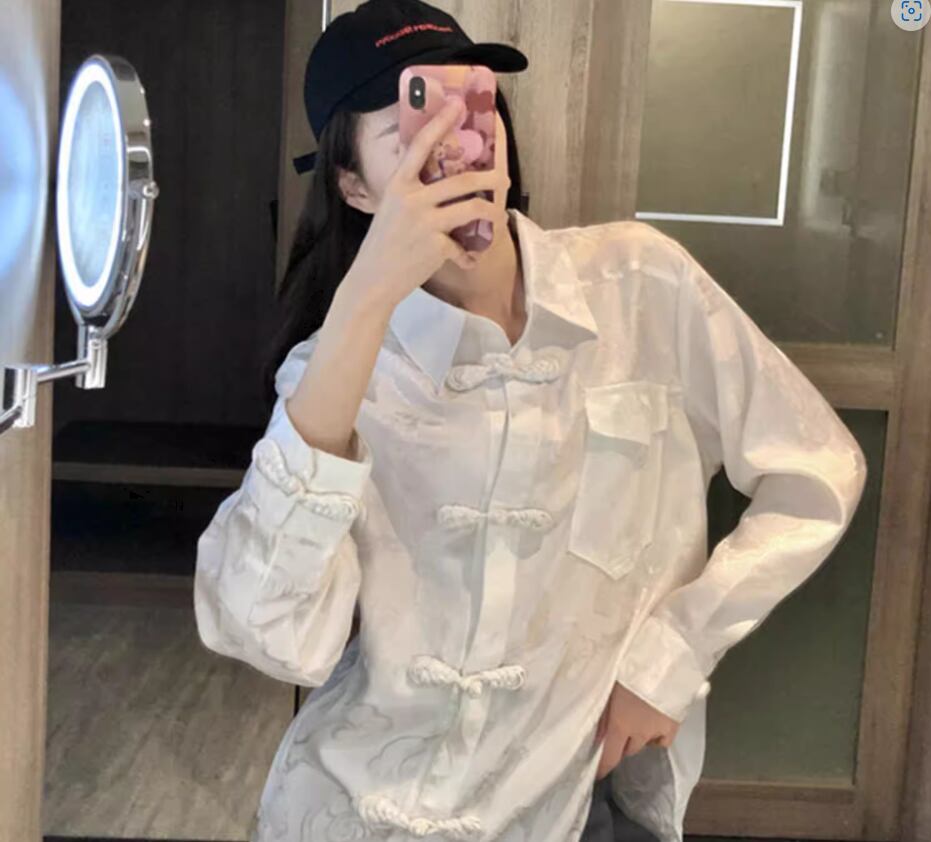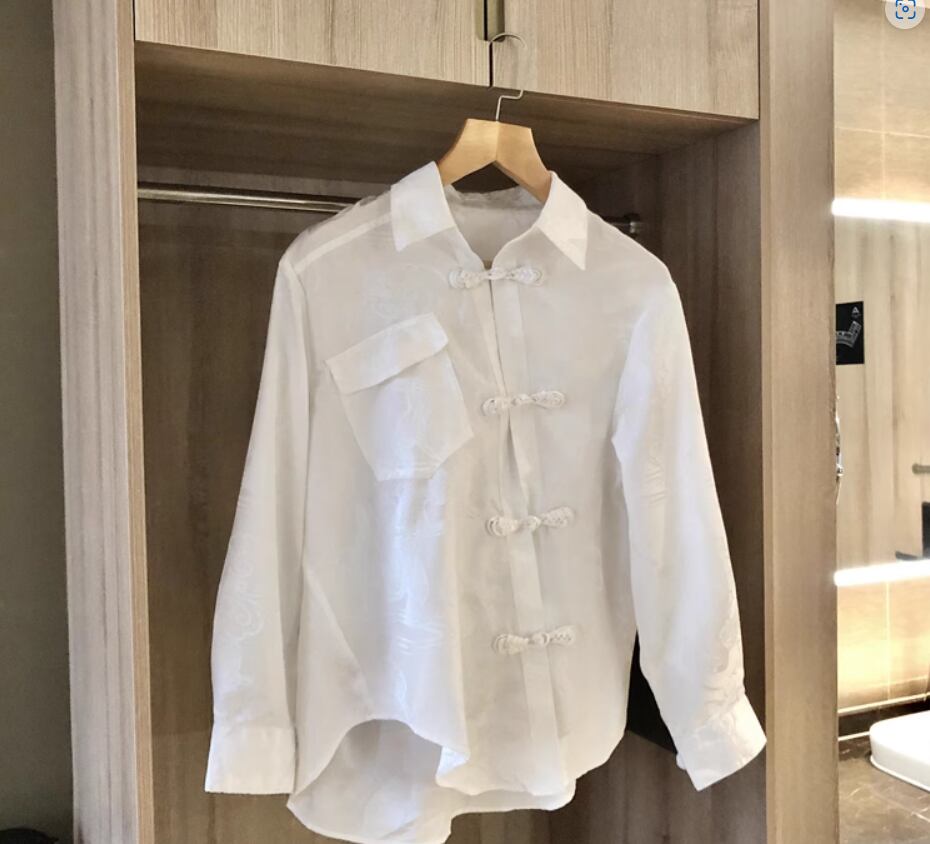 チャイナ風長袖ブラウス トップス 白シャツ 白トップス 袖あり 長袖 襟付き ポケット 透け感 カジュアル おしゃれ お洒落 レトロ アジアン こなれ感 個性的 存在感 とろみ感 春 夏 秋 10代 20代 30代 40代 レディース 女性用 お出かけ 休日 着回し 普段使い S M L XL 白 ホワイト