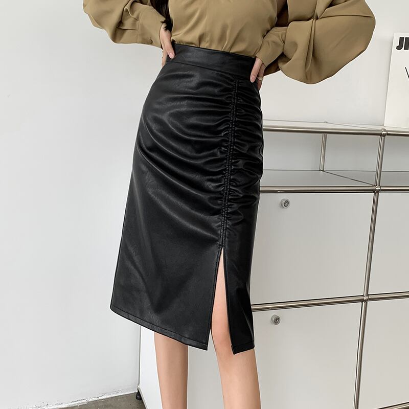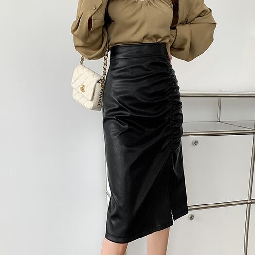 ボトムス スカート ミディアム丈スカート タイトスカート サイドスリット シャーリング フェイクレザー かわいい 大人可愛い きれいめ シンプル カジュアル 上品 おしゃれ かっこい 大人女子 こなれ感 個性的 レトロ 主役級 存在感 キュート クール ナチュラル ベーシック クール メンズライク セクシー 無地 レディース 女性用 ママ OL 通勤 学生 通学 デート お出かけ お泊まり イベント 女子会 休日 アウトドア カフェ ショッピング 旅行 リゾート コンパ レストラン 普段使い 着回し 脚長