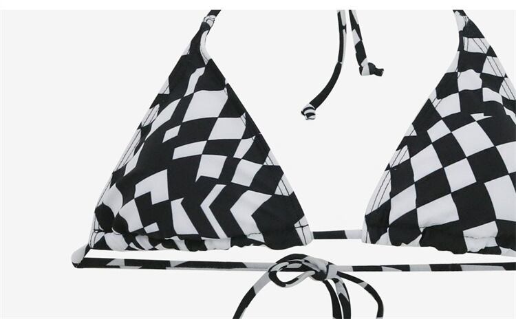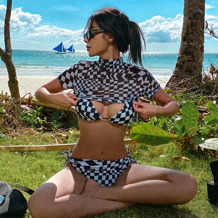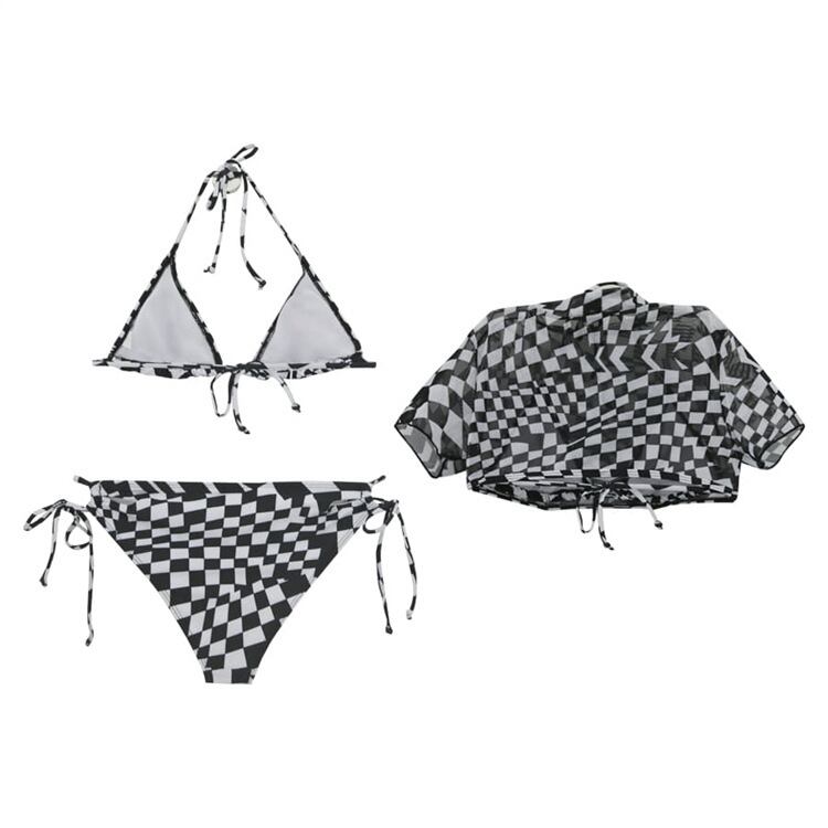 3点セット 水着 ビキニ レディース 三角ビキニ ホルターネック パッド付き 半袖 スリーピース かわいい 大人可愛い きれいめ カジュアル 大人っぽい おしゃれ お洒落 レトロ ラブリー キュート ガーリー 個性的 かっこいい セクシー 千鳥格子 リゾート 旅行 夏 海 韓国 インスタ映え こなれ感 M L XL ブラック