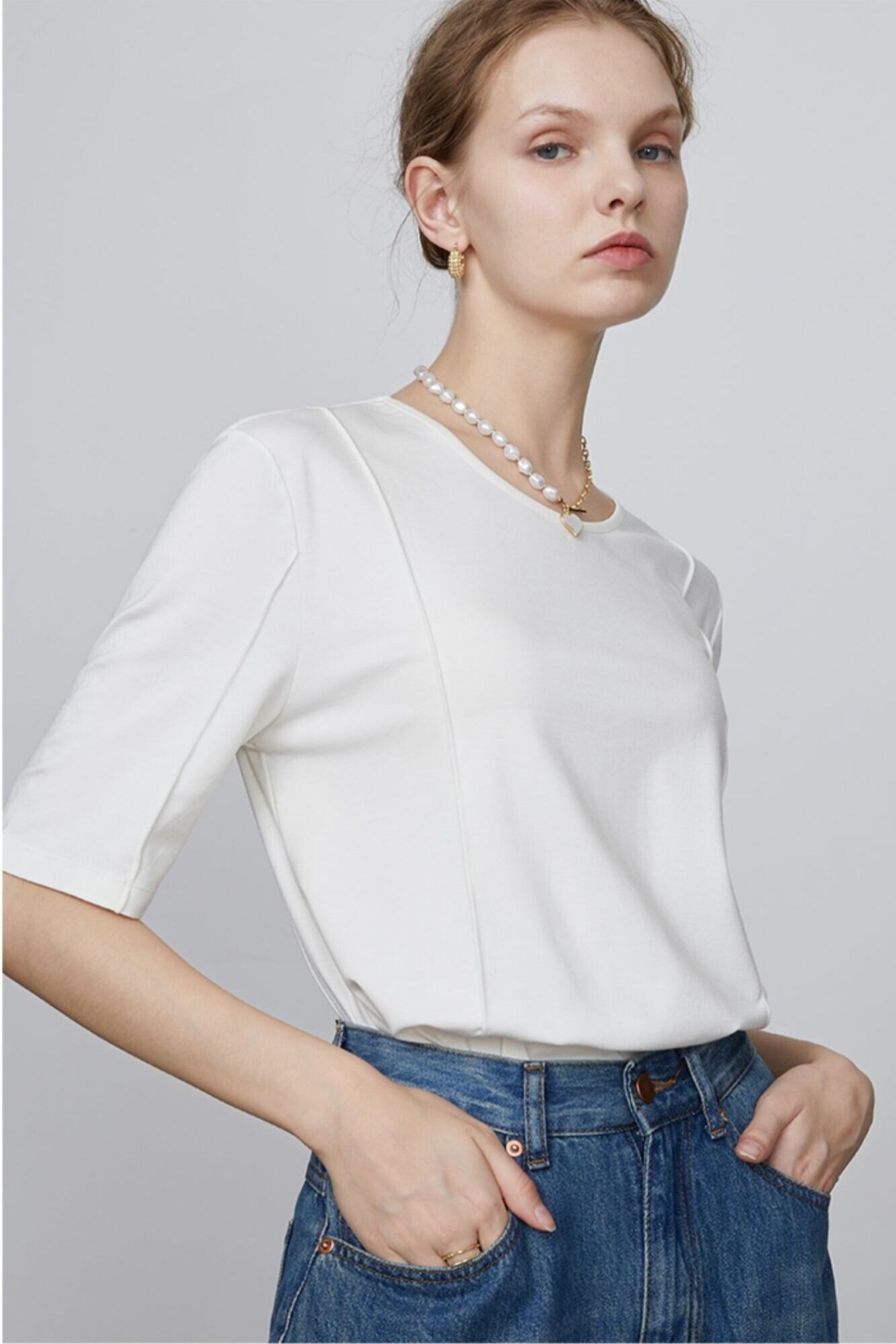 トップス カットソー レディース 半袖 5分袖 ラウンドネック ストレート 切り替え ナイロン レーヨン 大人可愛い きれいめ シンプル カジュアル 上品 おしゃれ こなれ感 クール エレガント 都会的 ベーシック ナチュラル 無地 春 夏 秋 ママ オフィス ビジネス OL 通勤 学生 学校 通学 デート お出かけ リゾート 旅行 レストラン 女子会 休日 ホテル ガーデン ショッピング カフェ 楽ちん 定番 S M L XL 2XL 3XL 大きいサイズ ビッグ ゆったり ゆる 白 ホワイト