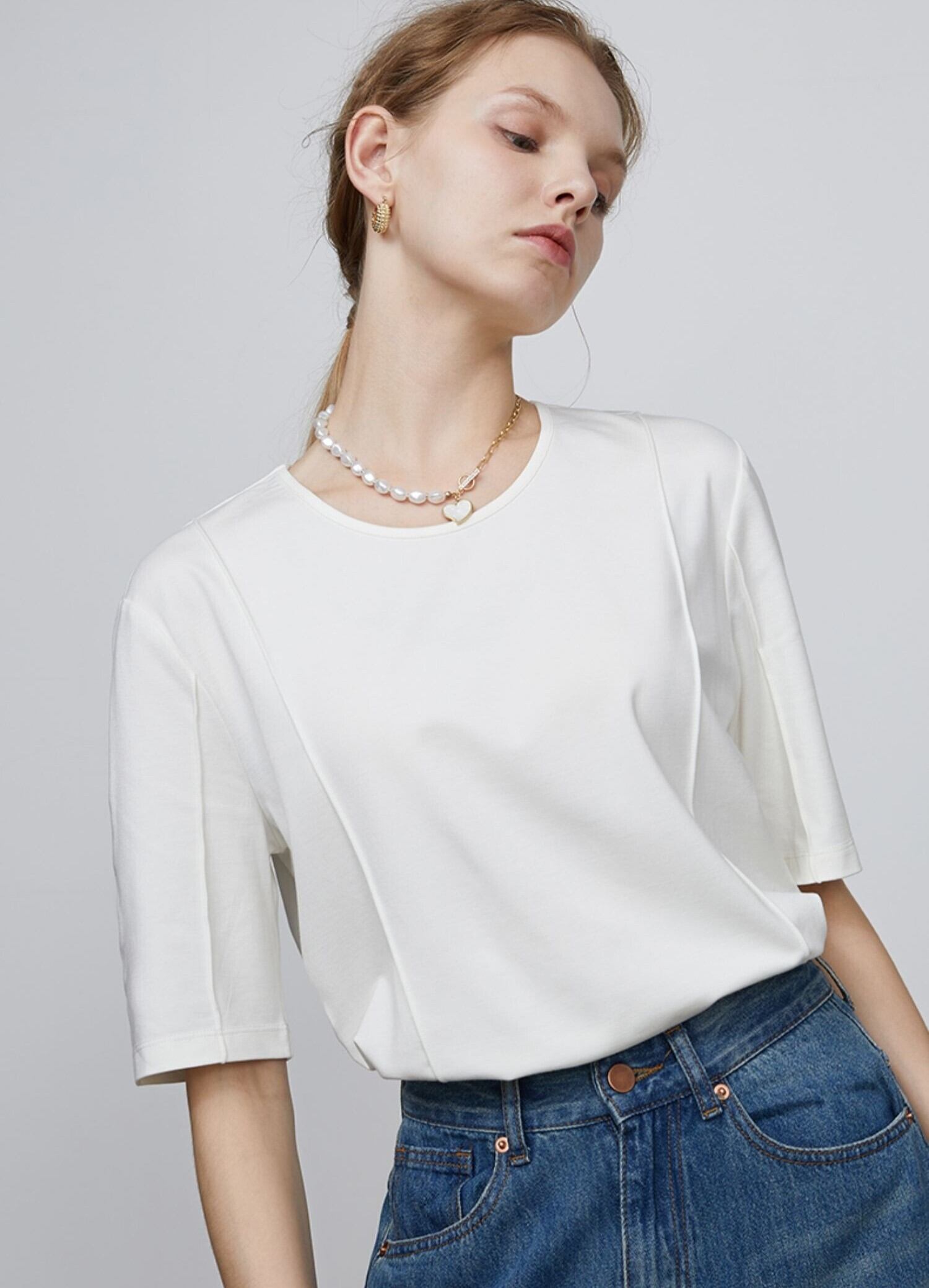 軽やかな素材感と大人可愛いデザインが魅力の、5分袖カットソー。