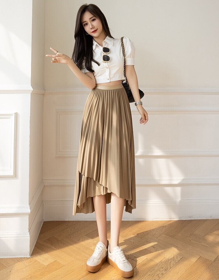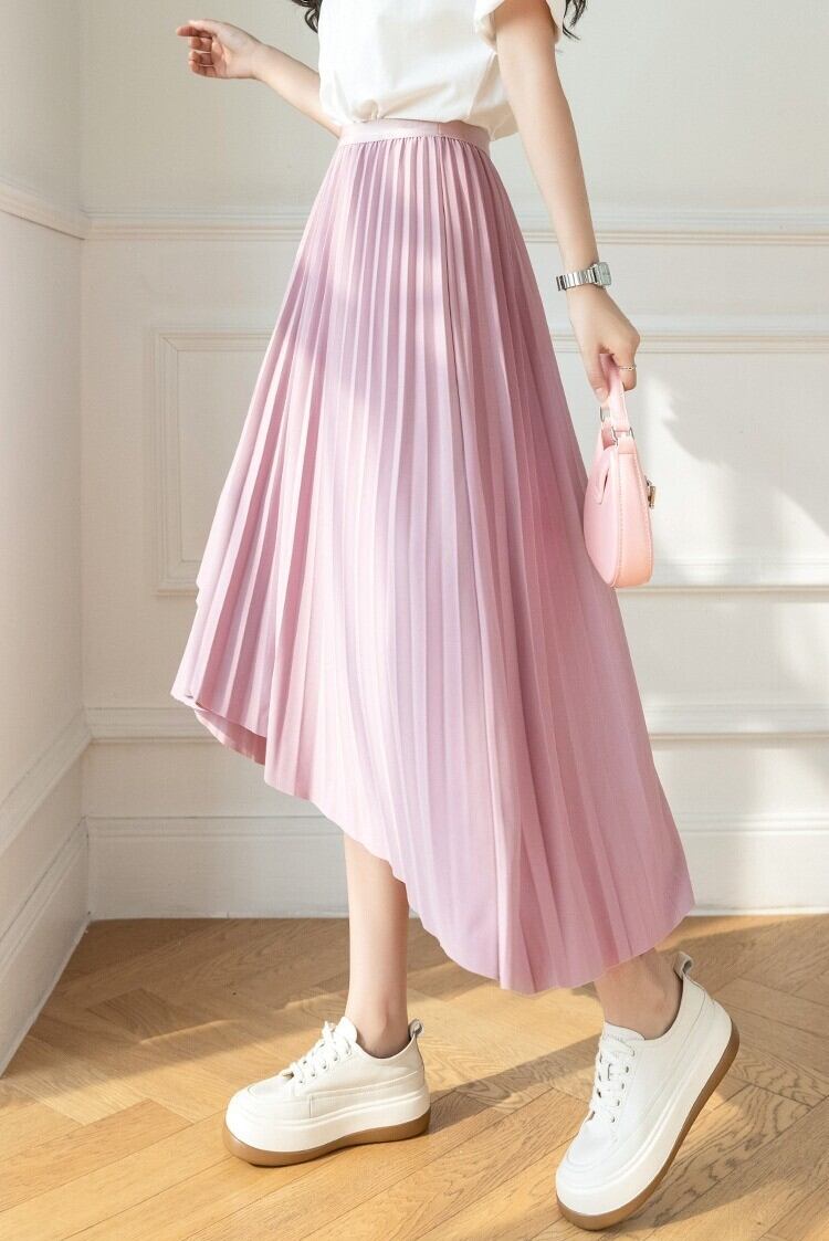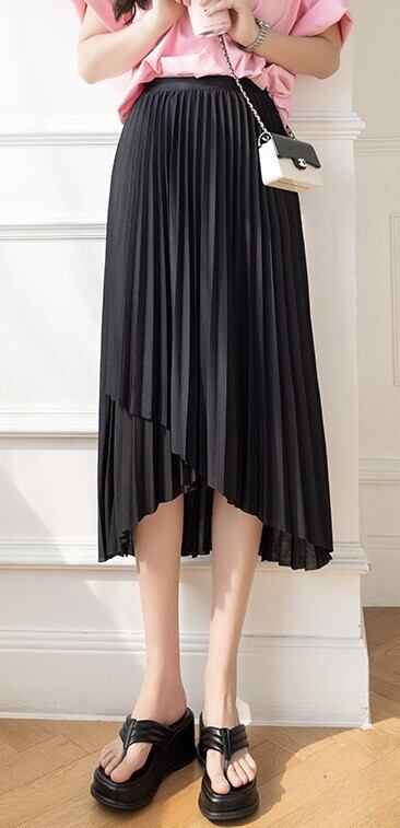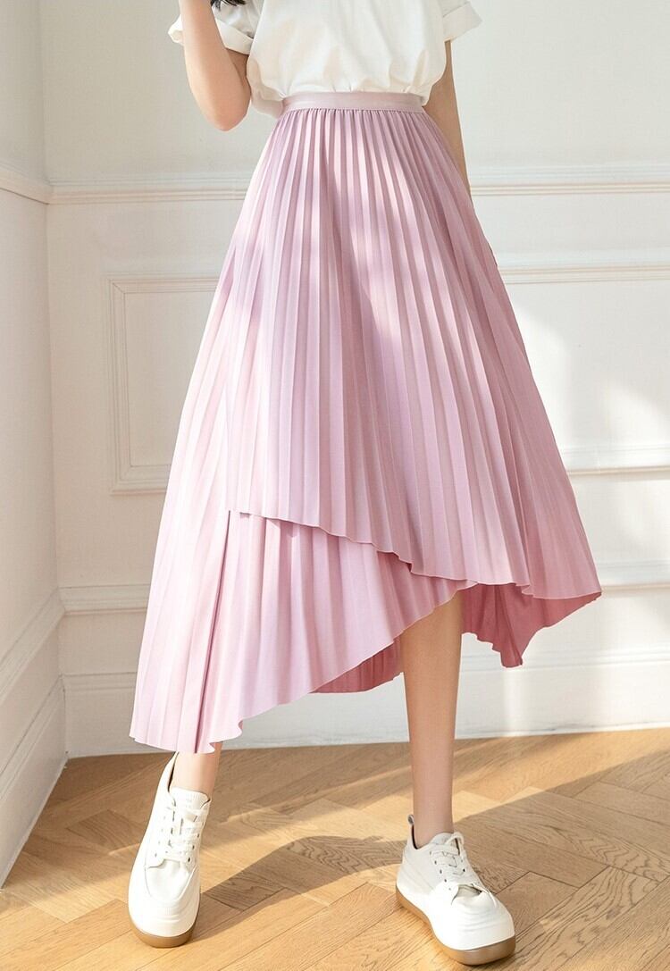 スカート レディース プリーツスカート 膝下 ミモレ フレア Aライン アシンメトリー フィッシュテール ラップ フェミニン プリーツ ウエストゴム かわいい 大人可愛い きれいめ カジュアル 上品 おしゃれ こなれ感 ガーリー エレガント 存在感 抜け感 ラブリー キュート ラグジュアリー クラシカル ベーシック ロマンティック 無地 春 夏 オフィス ビジネス OL 通勤 デート お出かけ 休日 ショッピング 楽ちん 体型カバー S M L XL ブラック カーキ ピンク アプリコット グリーン