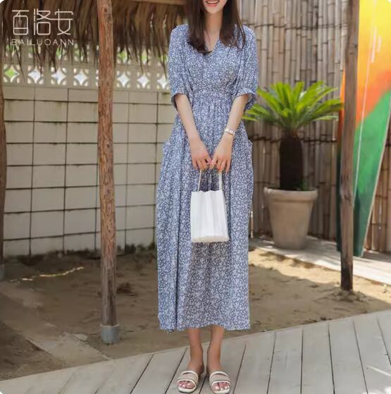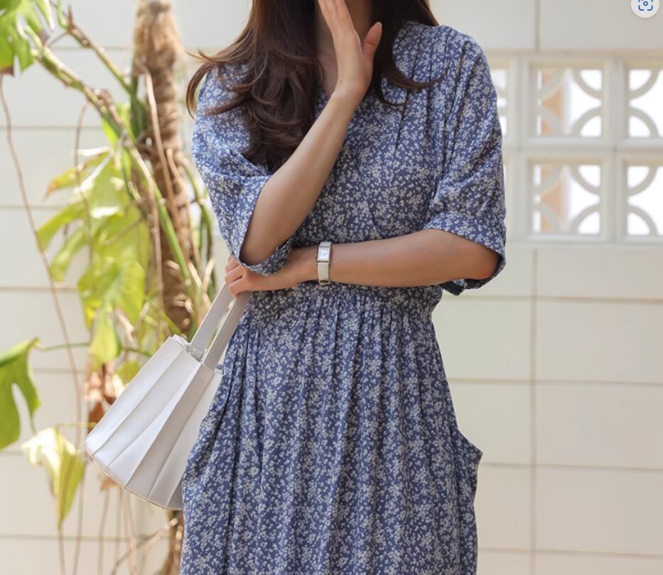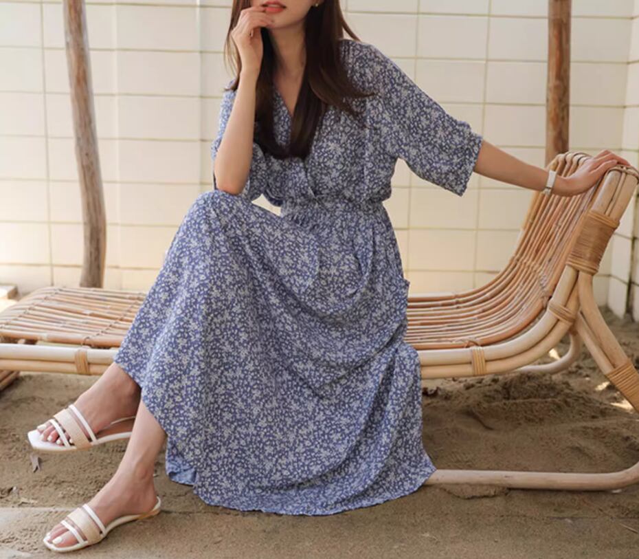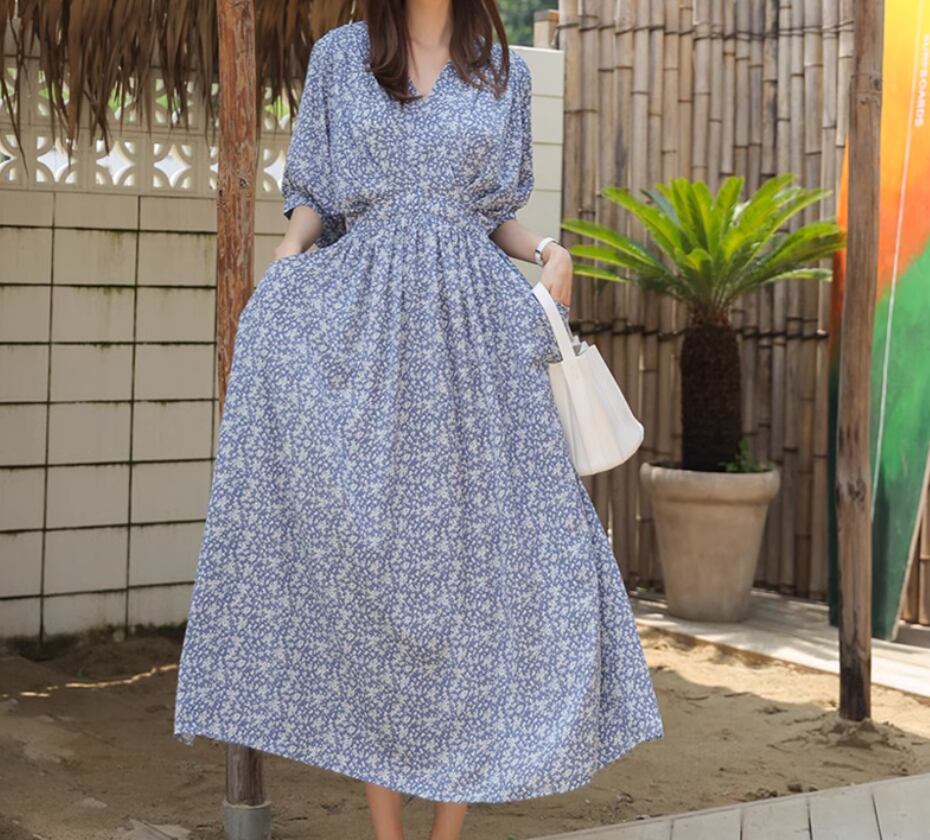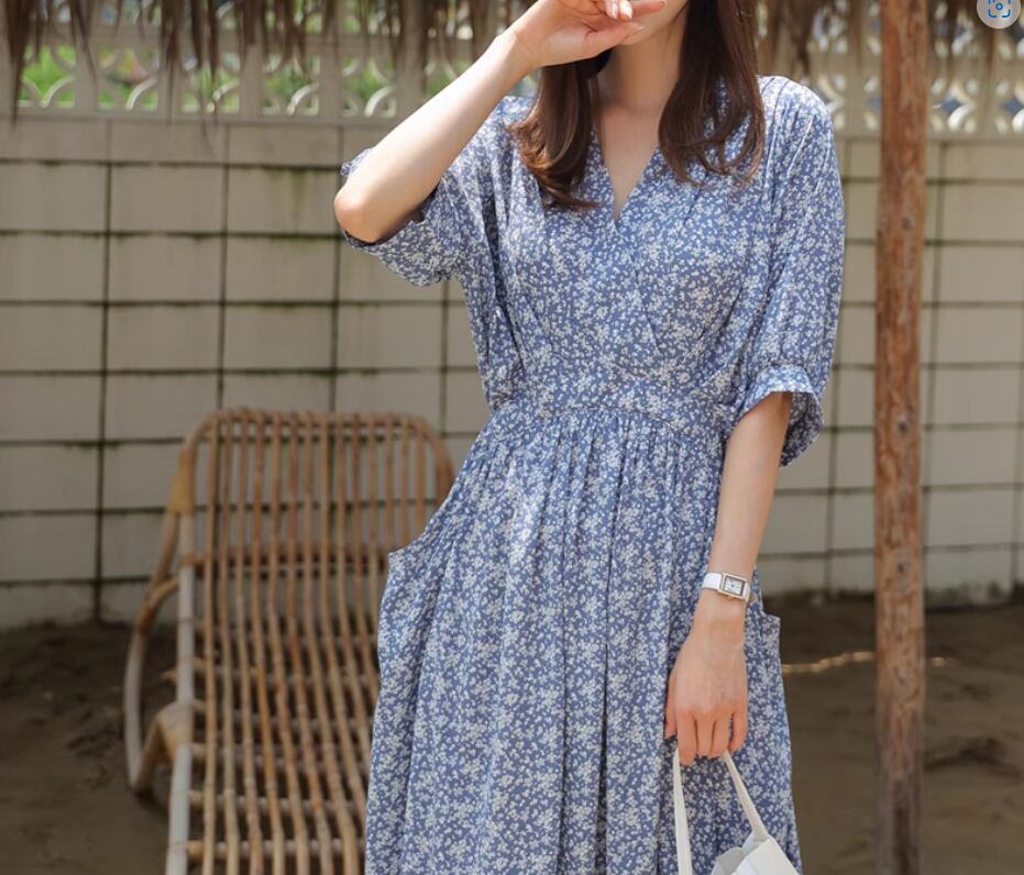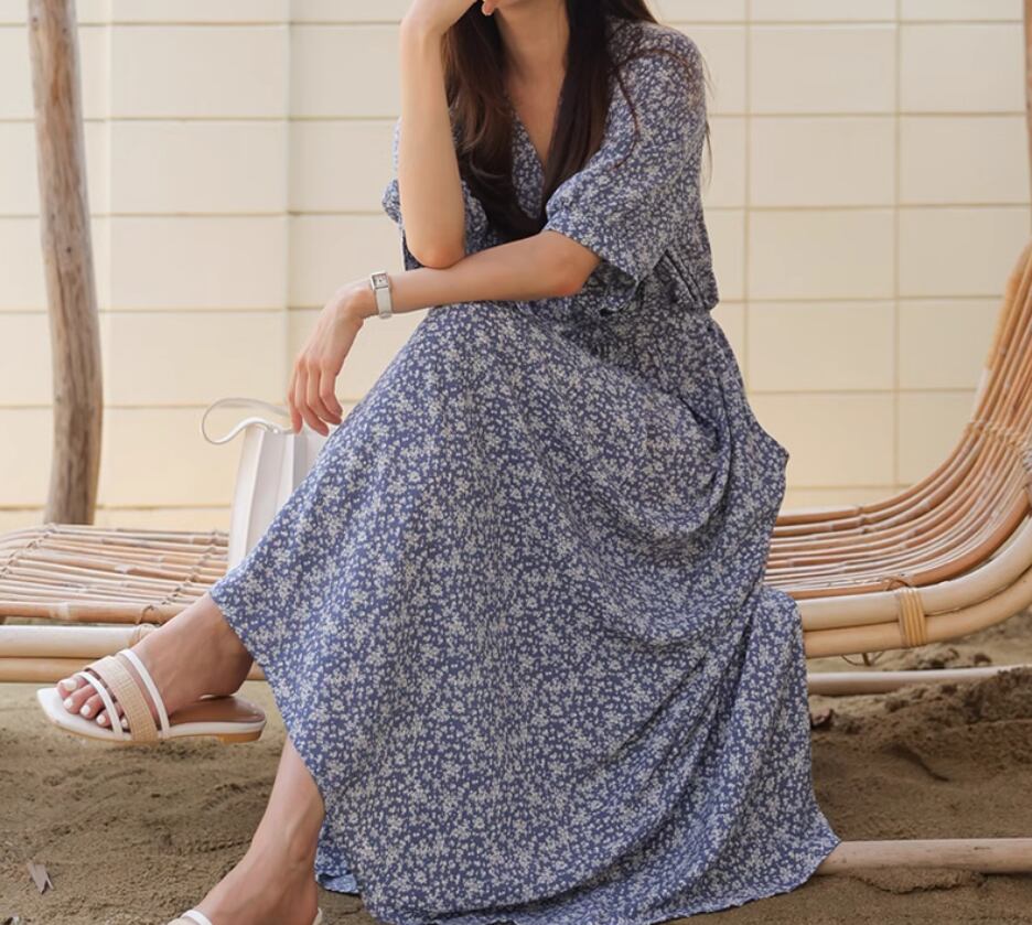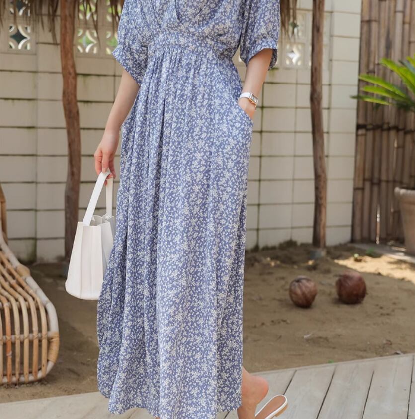 カシュクール風小花柄ワンピース ワンピドレス ロング丈 袖あり 半袖 Vネック Aライン ハイウエスト かわいい 大人可愛い きれいめ おしゃれ お洒落 大人女子 こなれ感 存在感 小花柄 春 夏 秋 10代 20代 30代 40代 レディース 女性用 デート お出かけ 休日 リゾート 旅行 海 普段使い 楽ちん 体型カバー S M L XL 青 ブルー