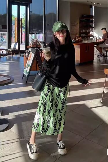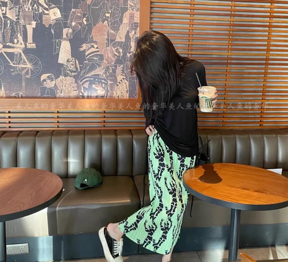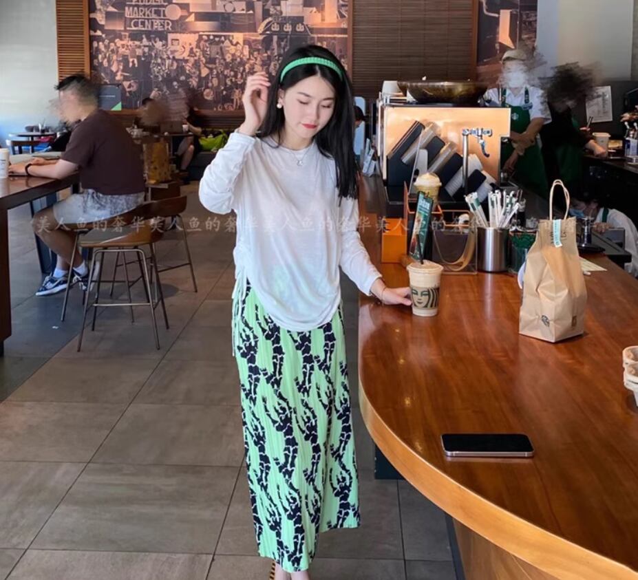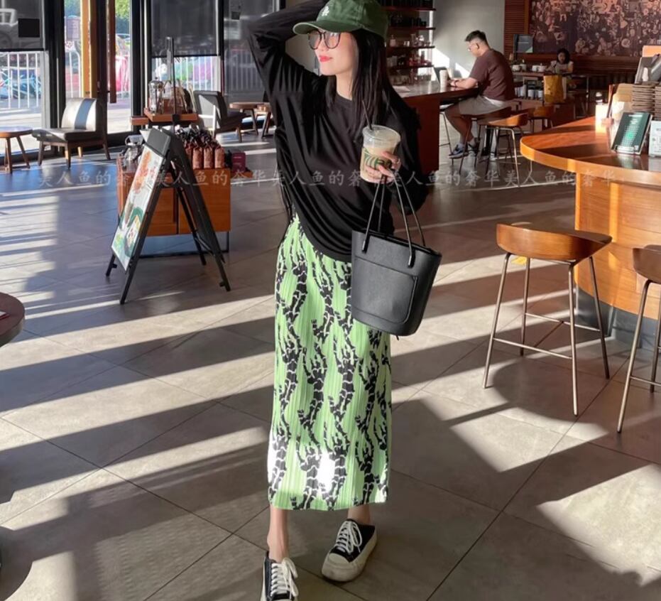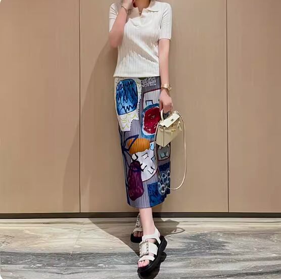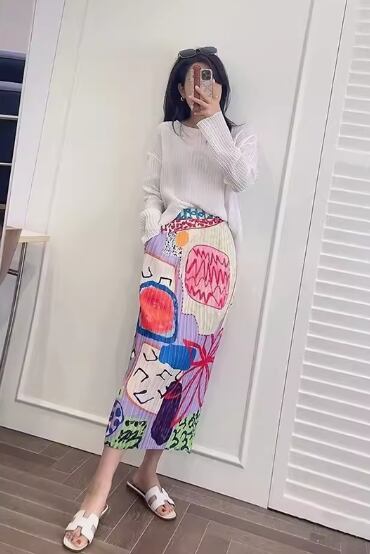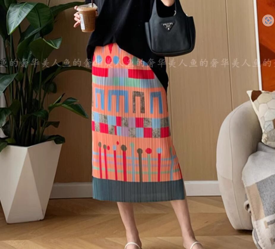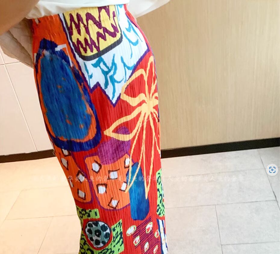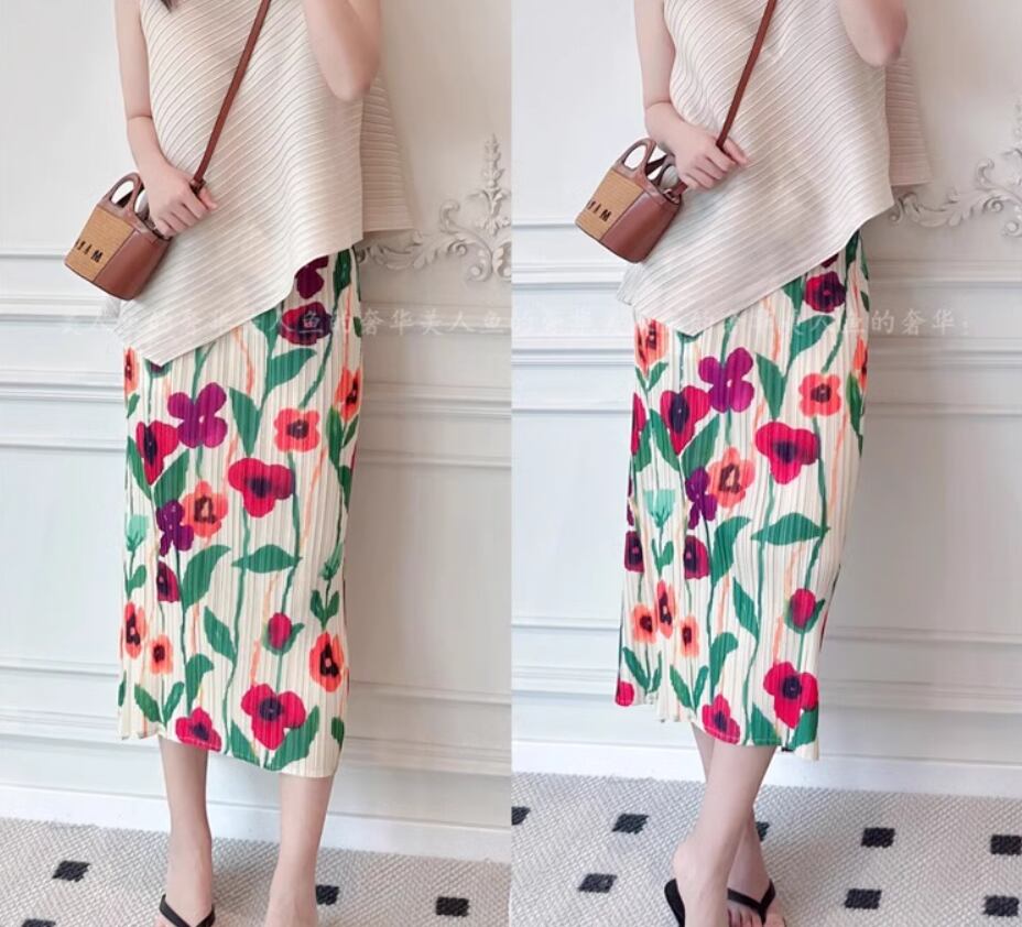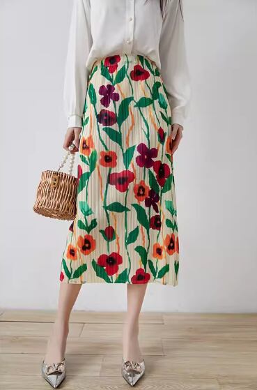 総柄プリーツスカート ミモレ丈 スリム プリーツ ハイウエスト ウエストゴム 伸縮性 ポリエステル カジュアル レトロ こなれ感 個性的 存在感 柄 春 夏 20代 30代 40代 お出かけ リゾート 旅行 着回し 普段使い 楽ちん フリーサイズ 赤 レッド 青 ブルー 緑 グリーン 紫 パープル オフホワイト オレンジ