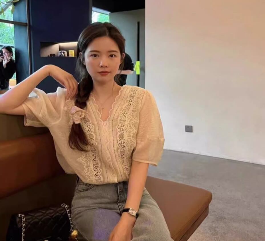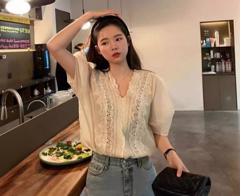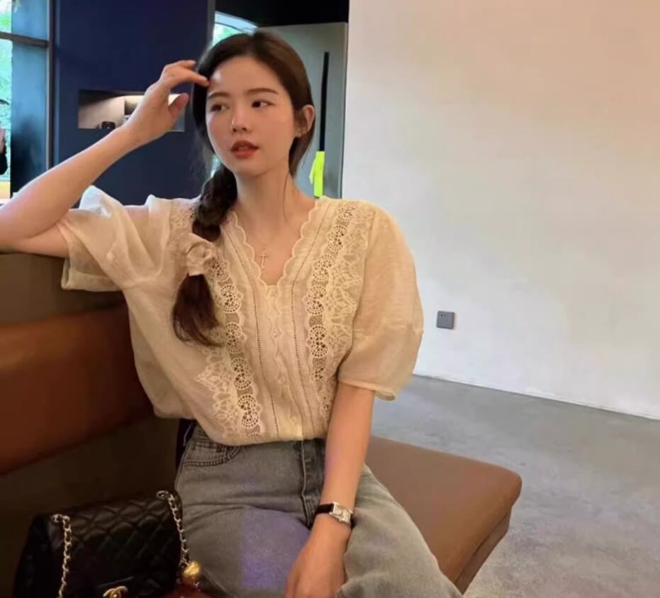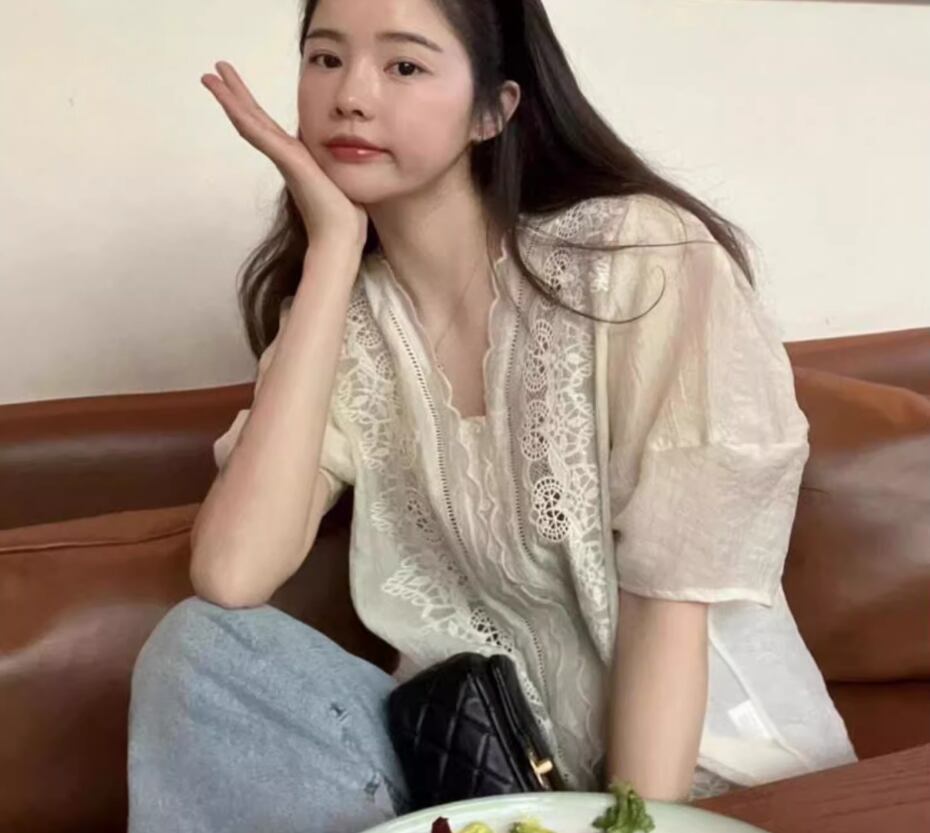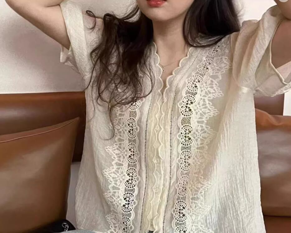 刺繍レースブラウス トップス シャツ ショート丈 袖あり 半袖 パフスリーブ Vネック ストレート レース 刺繍 前開き 透け感 かわいい 大人可愛い シンプル カジュアル おしゃれ お洒落 ガーリー 春 夏 10代 20代 レディース 女性用 お出かけ 休日 着回し 普段使い 重ね着 S M L XL アプリコット