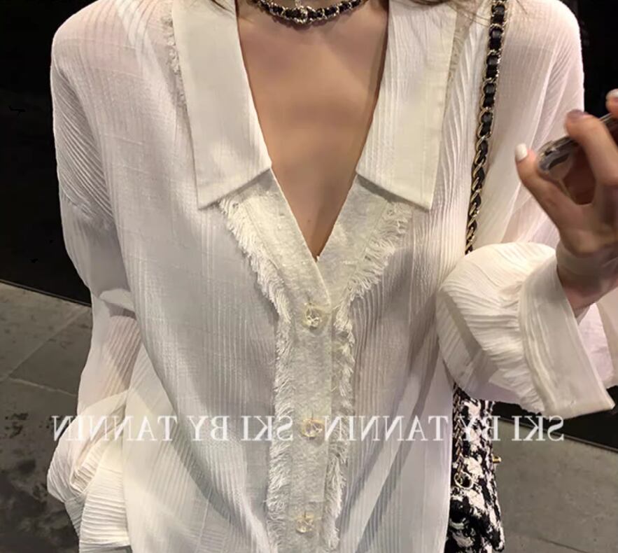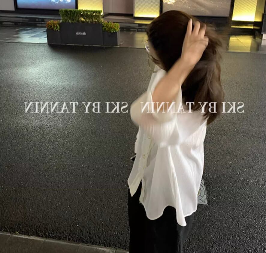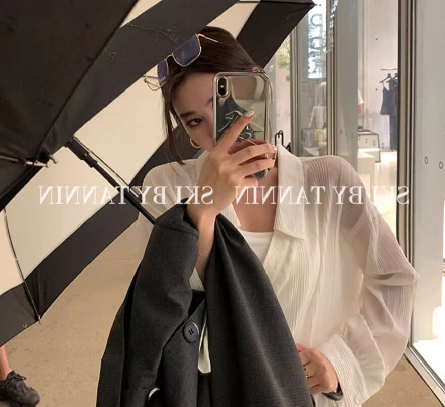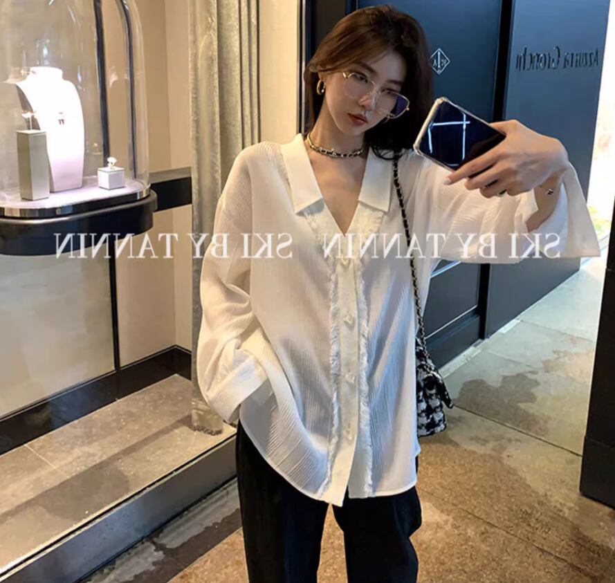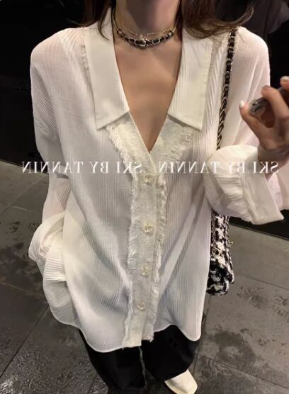 プリーツ加工長袖ブラウス トップス シャツ 袖あり 長袖 ドロップショルダー Vネック 襟付き ストレート プリーツ バックコンシャス 透け感 薄手 かわいい 大人可愛い シンプル おしゃれ お洒落 大人女子 こなれ感 無地 春 夏 20代 30代 40代 レディース 女性用 お出かけ 休日 着回し 普段使い 重ね着 XS S M 白 ホワイト