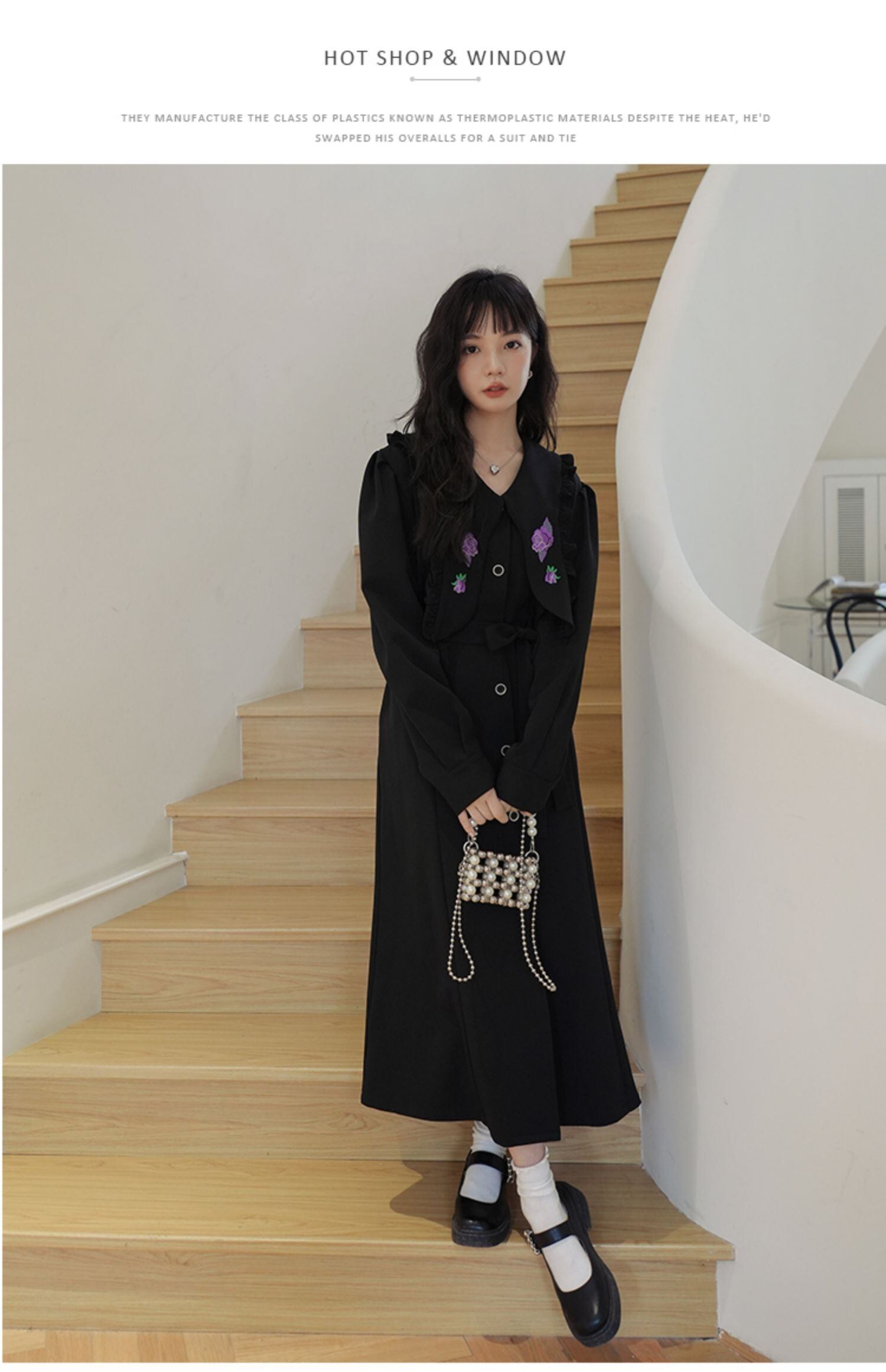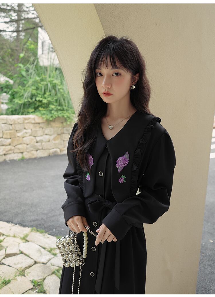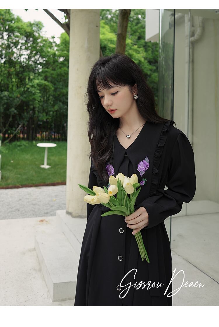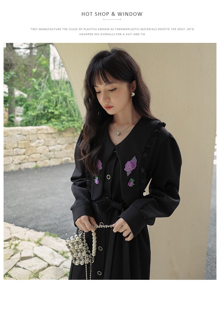 レディース ワンピース デート ワンピドレス ロング ロング丈 袖あり 長袖 Vネック 襟付き セミフレア Aライン 刺繍 前開き かわいい 大人可愛い きれいめ シンプル カジュアル 上品 おしゃれ お洒落 レトロ 大人女子 こなれ感 ラフ ラブリー キュート ガーリー 個性的 クール モード系 エレガント モダン 主役級 存在感 抜け感 レディース デート お出かけ 女子会 休日 着回し 普段使い ファッション コーデ スタイル モテ プレゼント 定番 トレンド インスタ映え