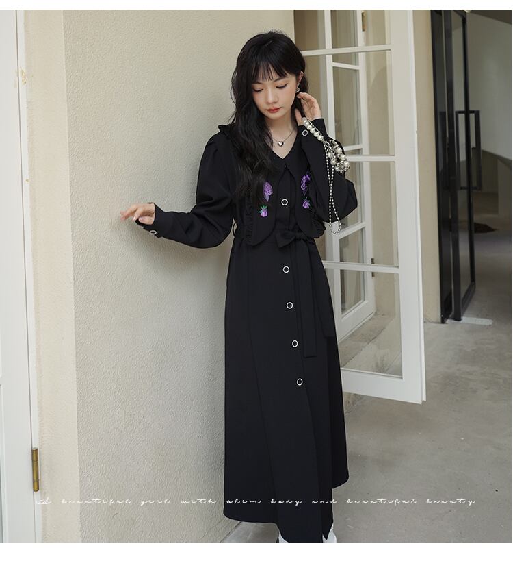 オシャレなデートや女子会にぴったりのブラックワンピースが登場しました!Vネックと刺繍がポイントのこのワンピースは、大人可愛い雰囲気を演出してくれます。セミフレアのAラインシルエットが女性らしさを引き立て、着るだけで一気におしゃれ感が漂います。ロング丈で足元をスッキリ見せてくれるのも嬉しいポイント。デートやお出かけ、女子会など様々なシーンで活躍すること間違いなし!思わず自信を持って歩きたくなる、主役級の存在感を放つ一着です。