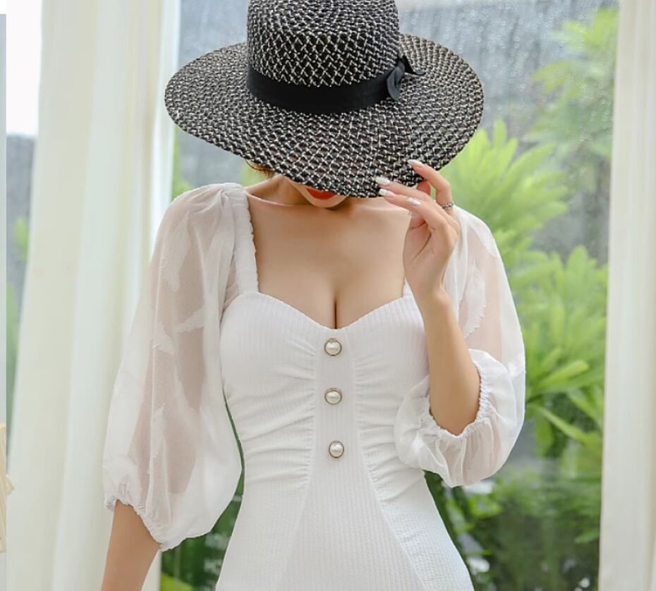 水着 ワンピース水着 二の腕カバー 長袖 シフォン 透け感 かわいい 大人可愛い シンプル カジュアル 華やか 大人っぽい おしゃれ お洒落 女っぽ 無地 10代 20代 30代 レディース 女性用 夏 海 ビーチ プール リゾート 旅行 モテ M L XL 白 ホワイト
