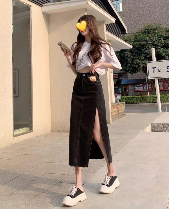 流行りのデニムスカート!ハイウエストで美しいスタイルを演出するデザイン。ショート丈からロング丈、ストレートラインでシンプルながらも、スリットがさりげなく足元をアピール。