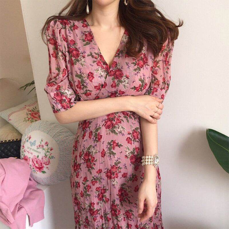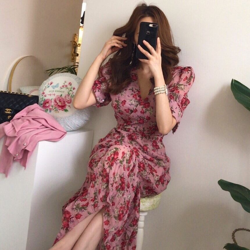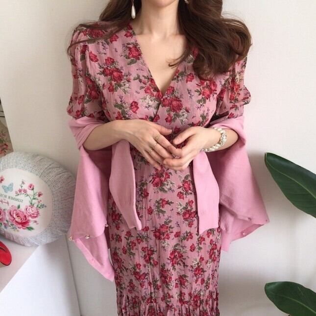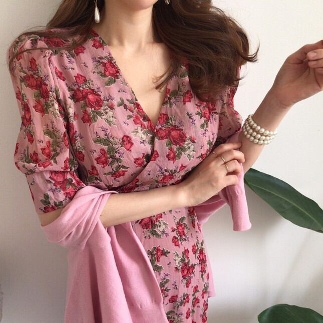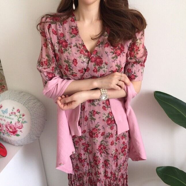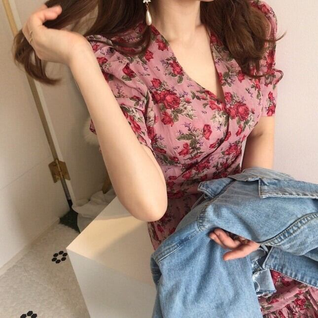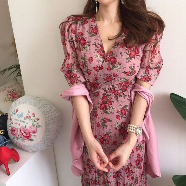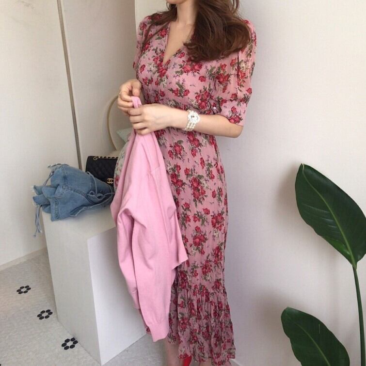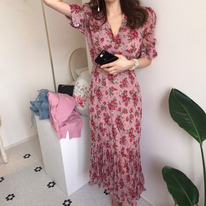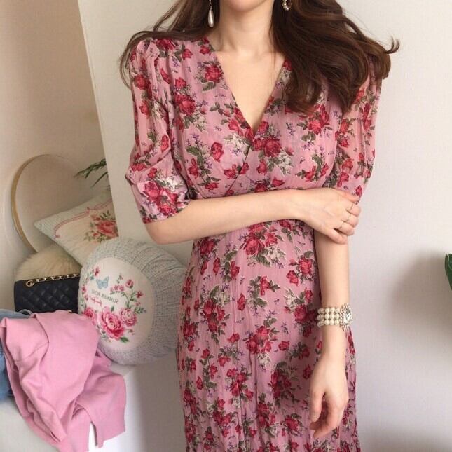 レディース ワンピース ミモレ 半袖 Vネック フレア スリム 細身 Iライン フェミニン ハイウエスト かわいい 大人可愛い きれいめ シンプル カジュアル おしゃれ レトロ こなれ感 ラフ ガーリー ラブリー キュート 花柄 春 夏 デート お出かけ パーティー イベント 女子会 ショッピング 韓国 コーデ 楽ちん 体型カバー 脚長 普段使い モテ トレンド 流行 インスタ映え S M L ピンク